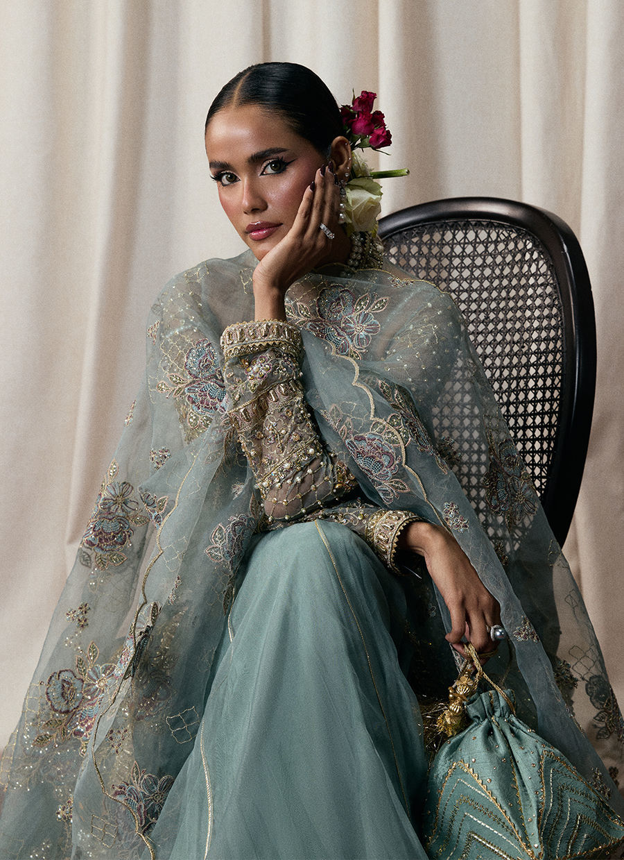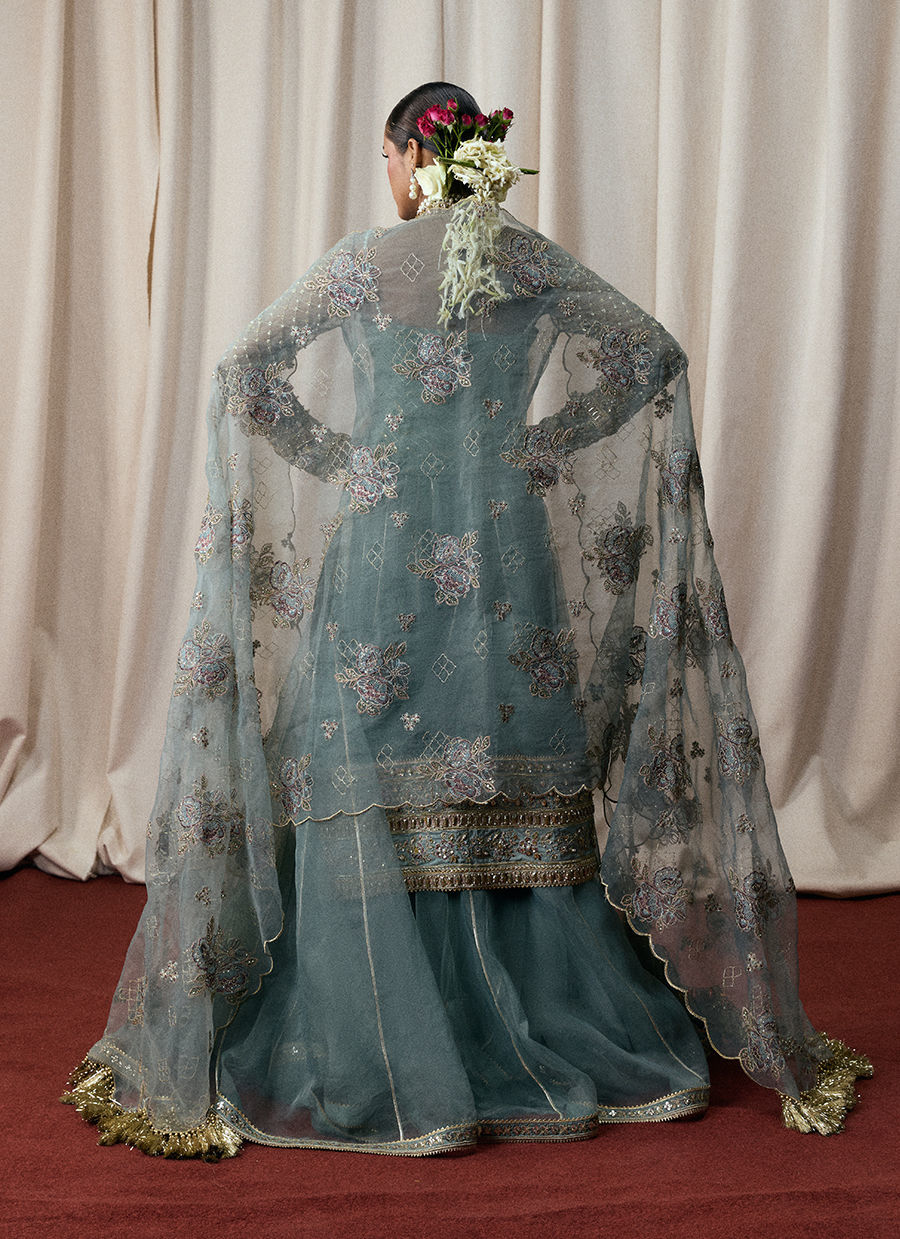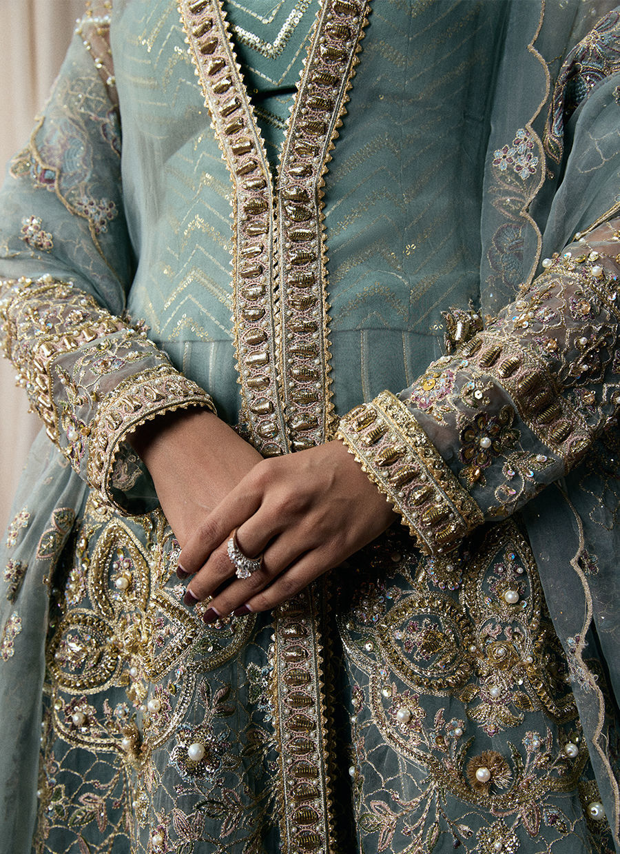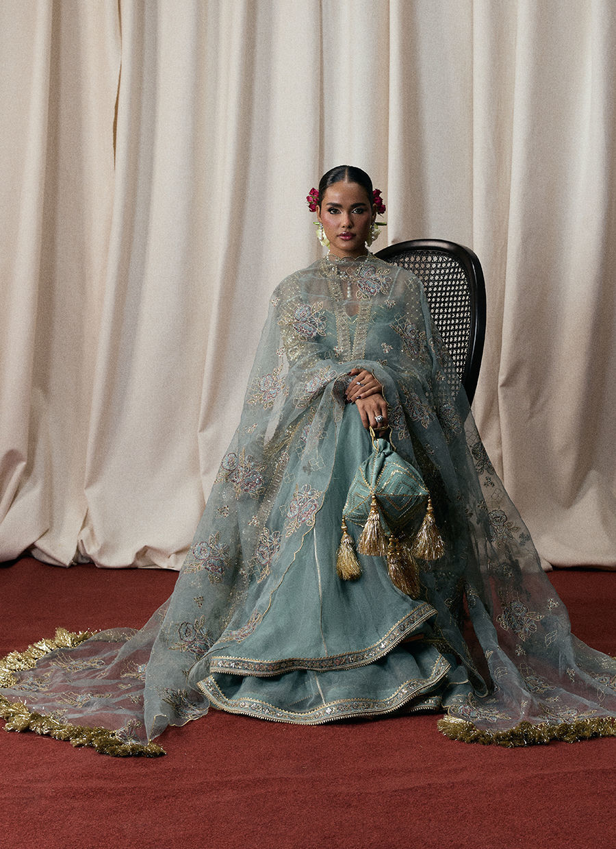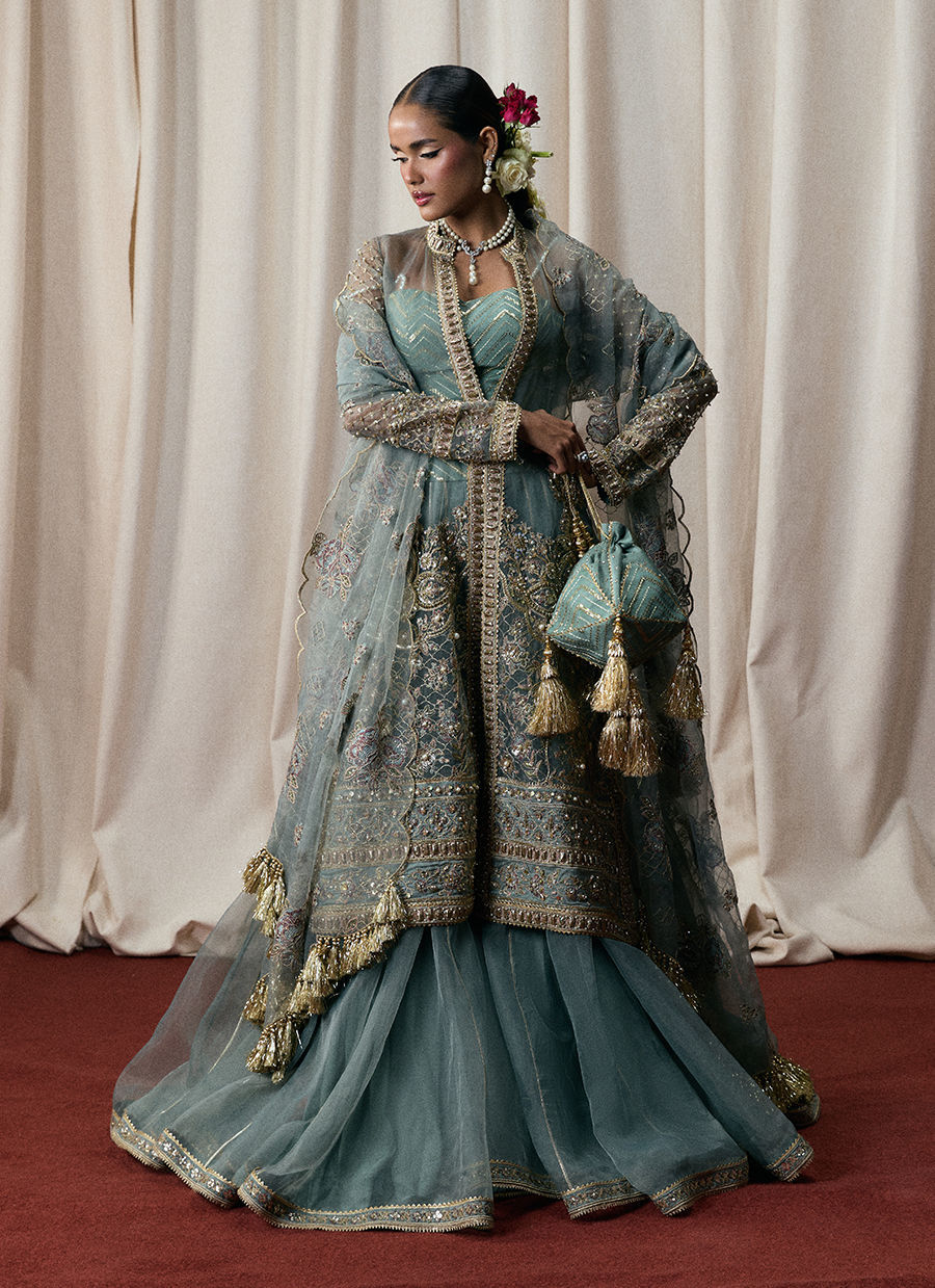 An ice blue fully embroidered jacket with intricate adda work, layered over an embroidered corset. Paired with a panelled sharara featuring gota detailing and bordered edging, the look is finished with a scalloped dupatta for a refined, contemporary statement.