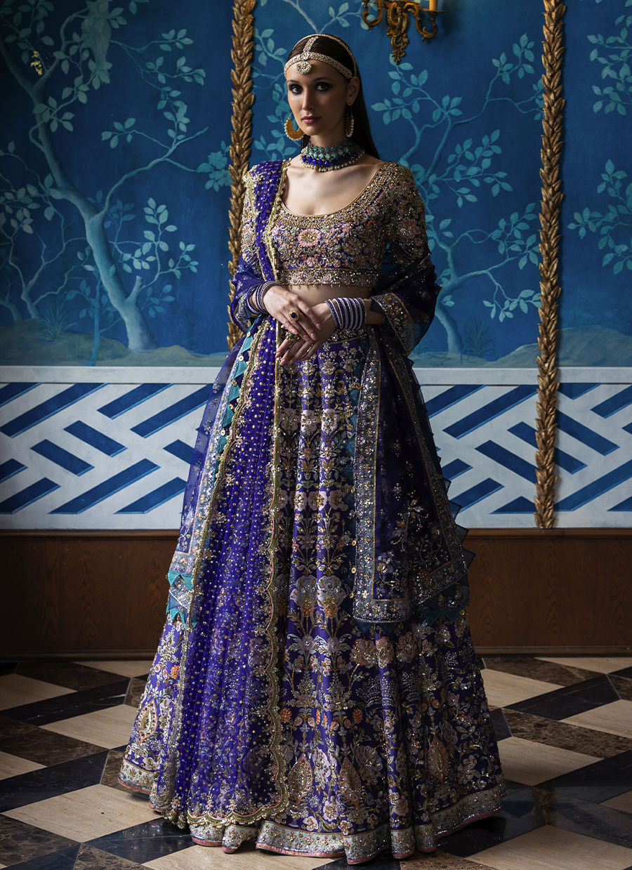 Our indigo lehnga choli, adorned with intricate pink florals, gold and silver hand embroidery details, plus 3D crystals and zardozi techniques. Two splendid dupatta options in organza and tulle net complement the masterpiece.