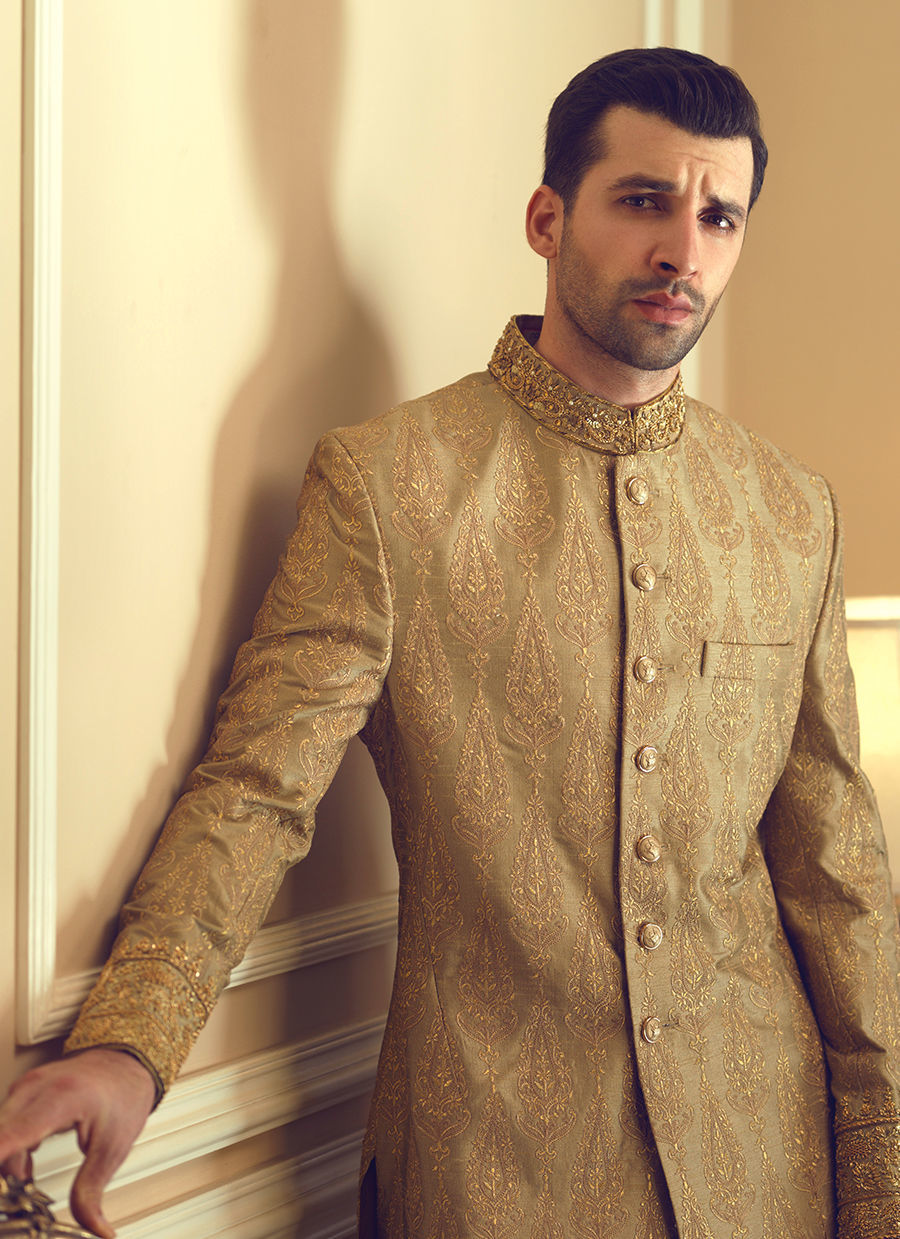 An elaborate embroidered gold sherwani, with uniquely designed hand detailed gold cuffs, collar and sleek buttons.