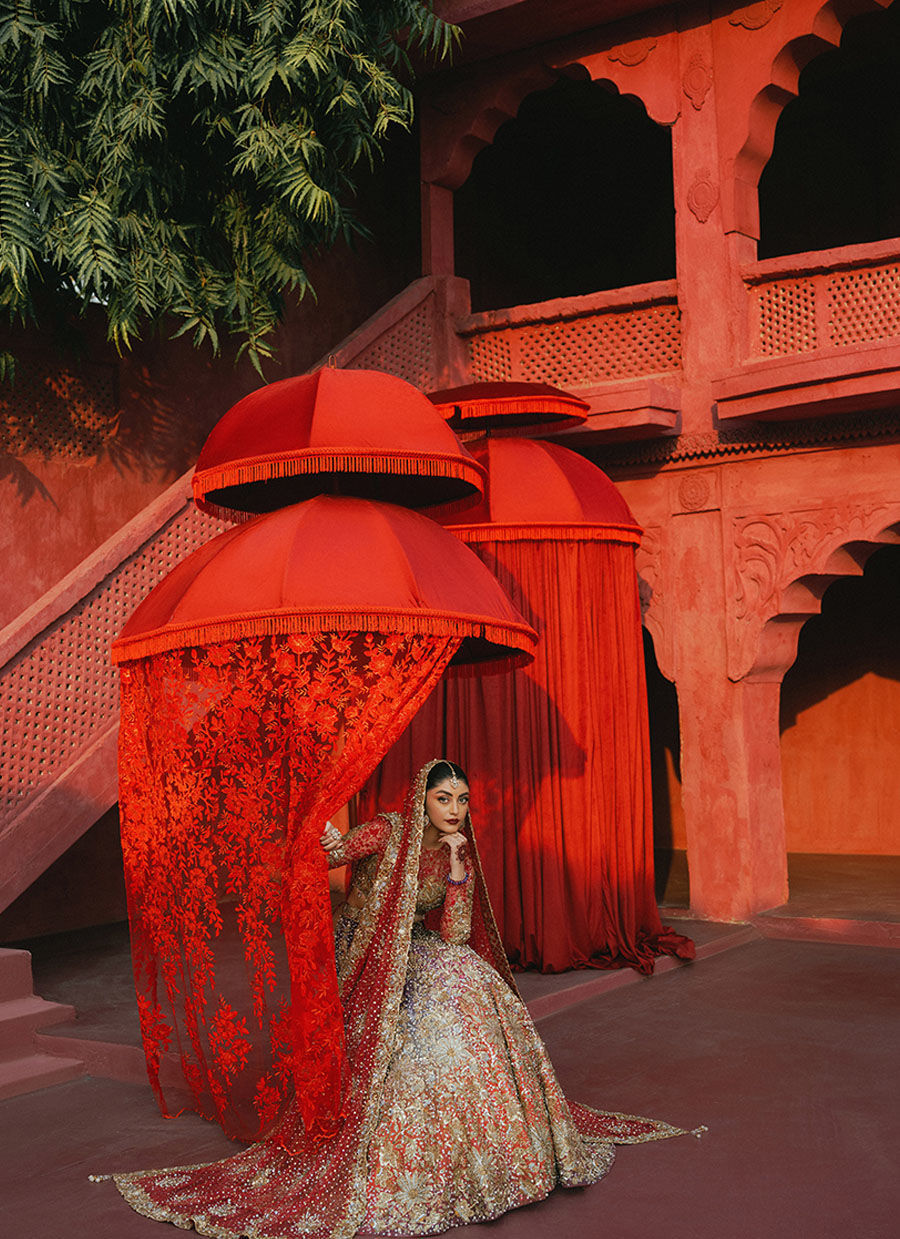A breathtaking coral, purple, and pink ombre lehnga adorned with intricate gold and sequin work, paired with a sheer net choli that exudes elegance. The look is completed with a soft net dupatta featuring delicate white pearl detailing and shimmering sequin accents.