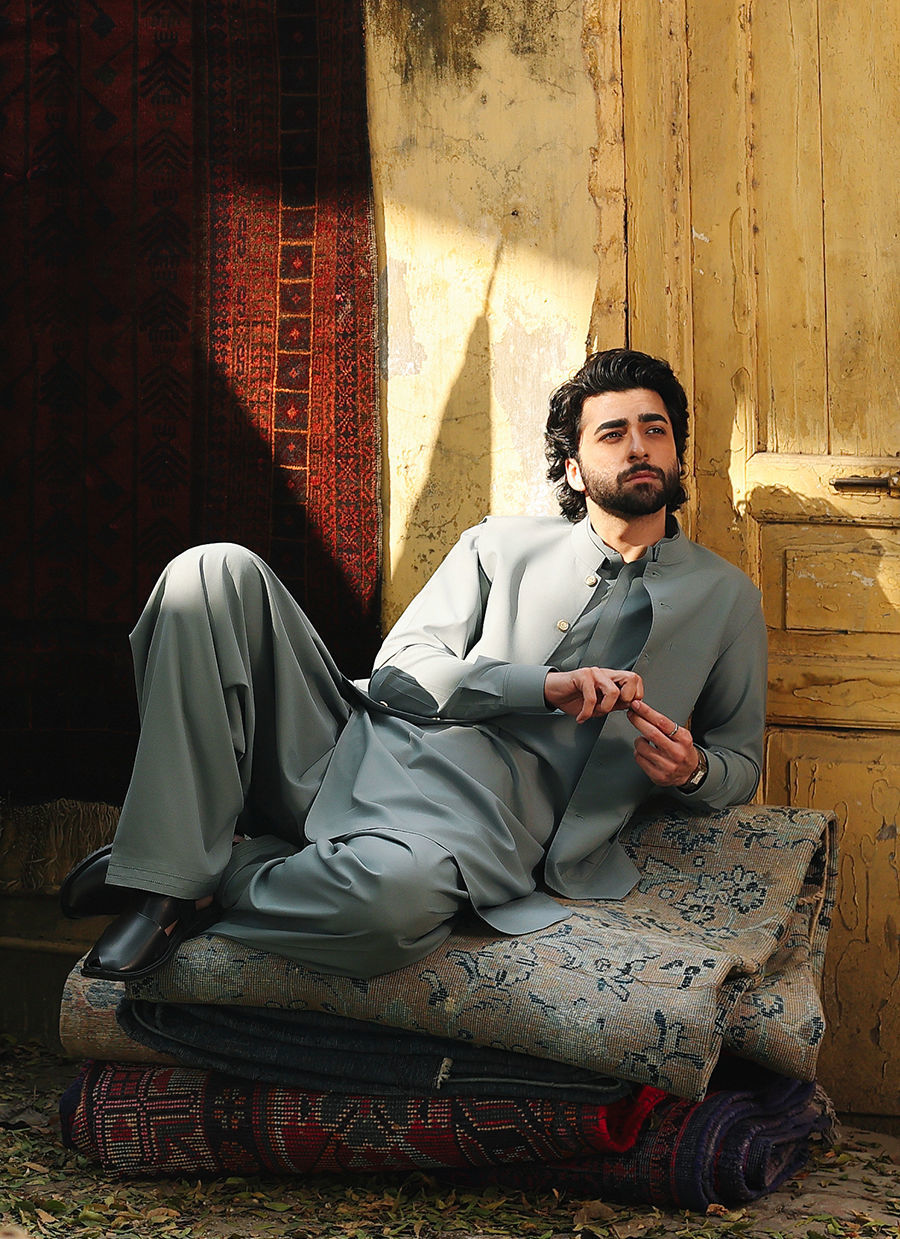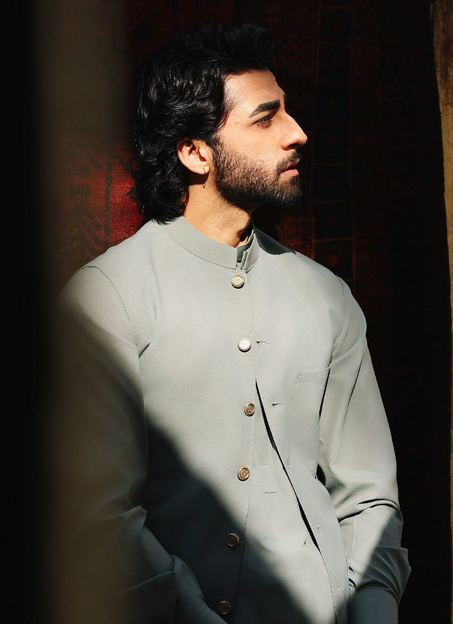Elegant sage green outfit featuring refined stitching details, a sleek ban collar, and stylish double cuffs. Designed with a hidden button pocket for a clean finish, and paired with a front-buttoned waistcoat adorned with golden buttons for a sophisticated, polished look.