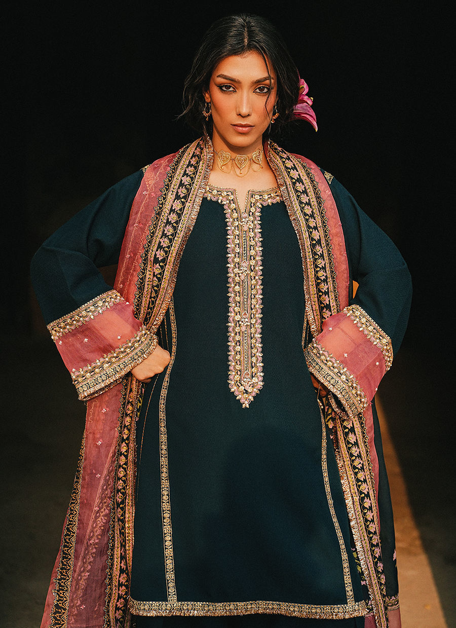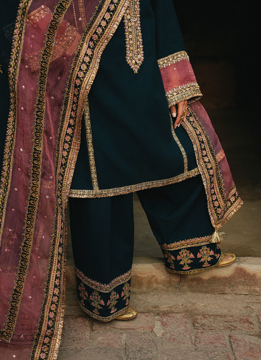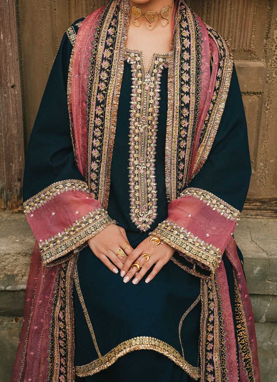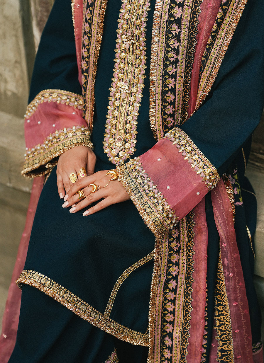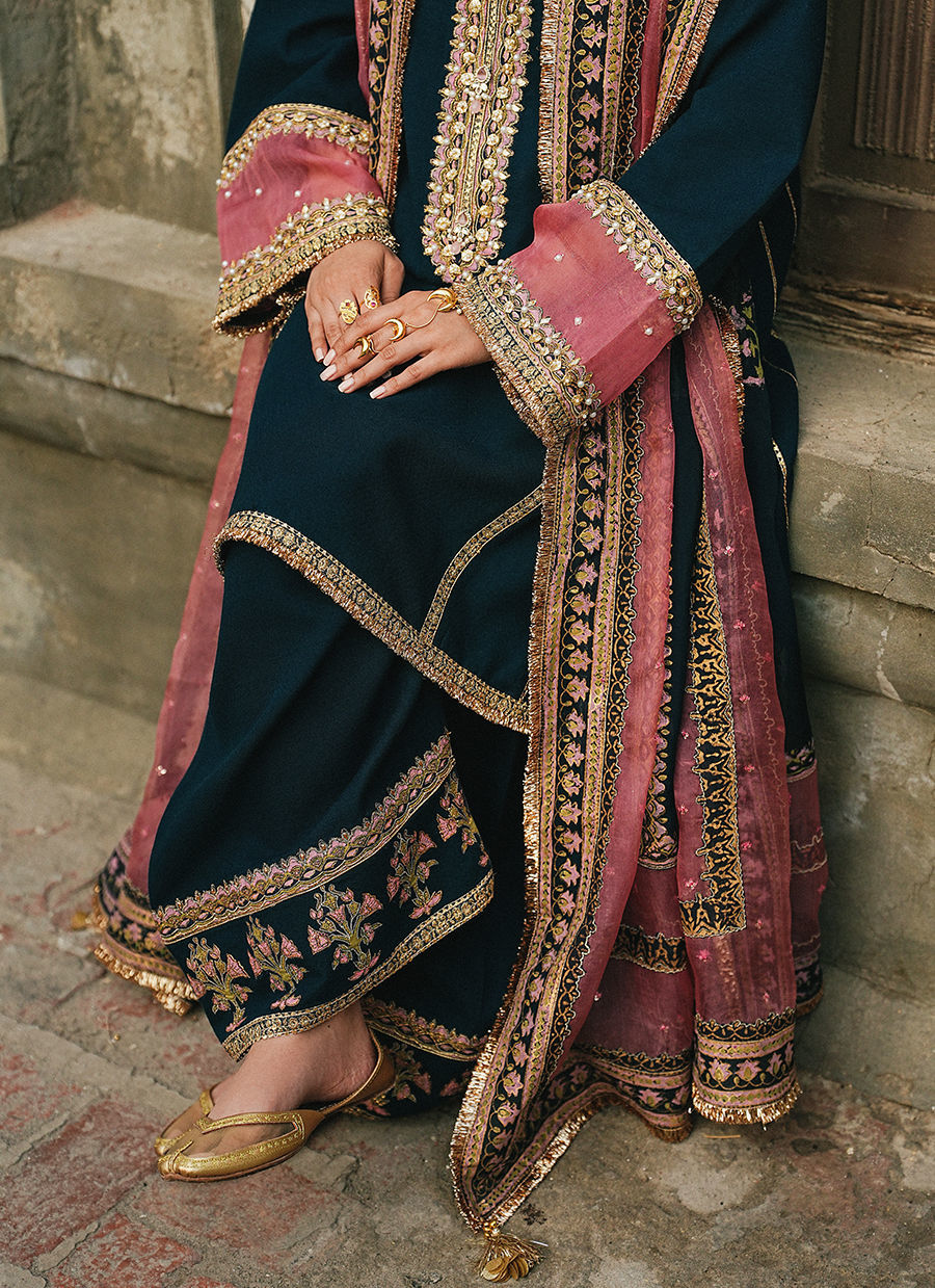A navy blue self-textured Afghani kurta, featuring a block-printed and embroidered neckline accented with subtle adda detailing for a refined touch. Structured panel and hem borders enhance the silhouette, while it is paired with a shalwar finished with a block print hem for a cohesive look. Styled with a pink double-chan organza dupatta, thoughtfully patched with block print borders and a blue chiffon center adorned with embroidered motifs, the ensemble combines traditional craftsmanship with contemporary elegance.