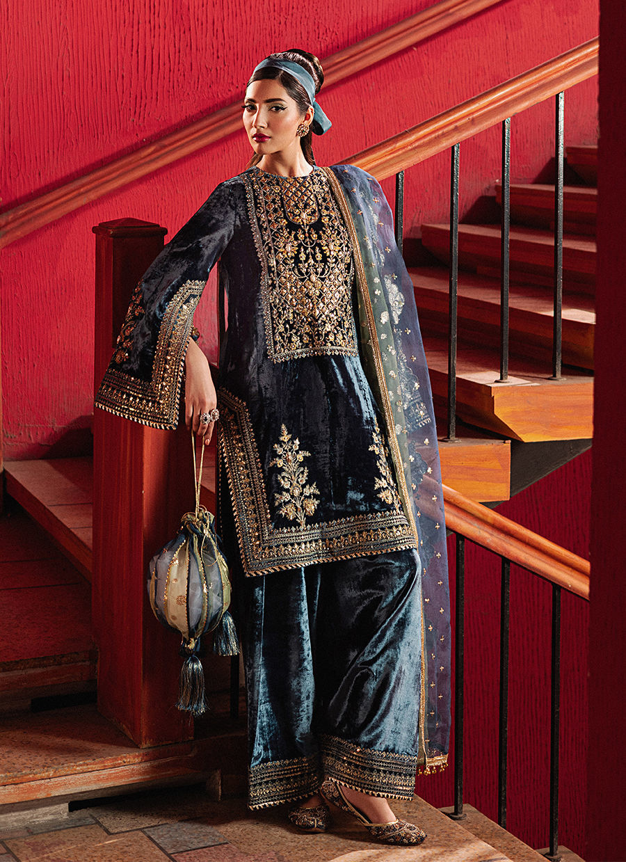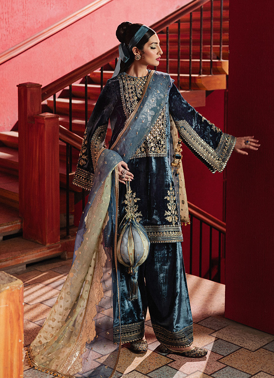Dive into the serenity of twilight azure with Neelo, a mellow blue velvet ensemble that exudes sophistication. The short shirt is adorned with floral mughal guldasta embroidery and adda work on the sleeves that feature ottoman slit detail, hemline, and neckline, while delicate borders frame its every edge. Paired with an azaar featuring understated embroidery, the set is elevated by a dual-toned organza dupatta in emerald green and royal cerulean adorned with kacha tilla. Neelo is an ode to one of Lollywood’s leading ladies, capturing her elegance and magnetism.