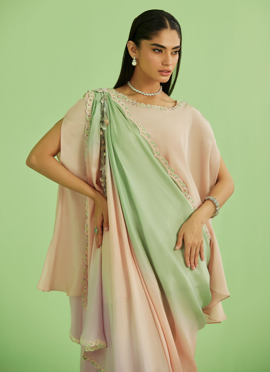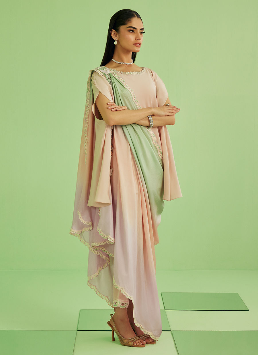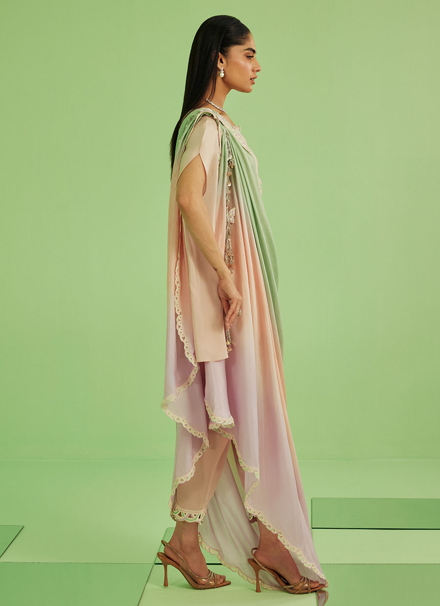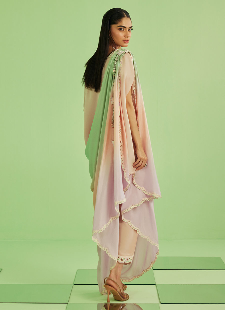 This pale pink ensemble features a short shirt and shalwar paired with an asymmetrical pre-draped dupatta, creating a silhouette that feels both modern and gracefully understated. Crafted in pure crepe, the shirt is adorned with intricate handwork along the neckline, brought to life in subtle hues of white, lilac, and mint — adding depth with a whisper of color.