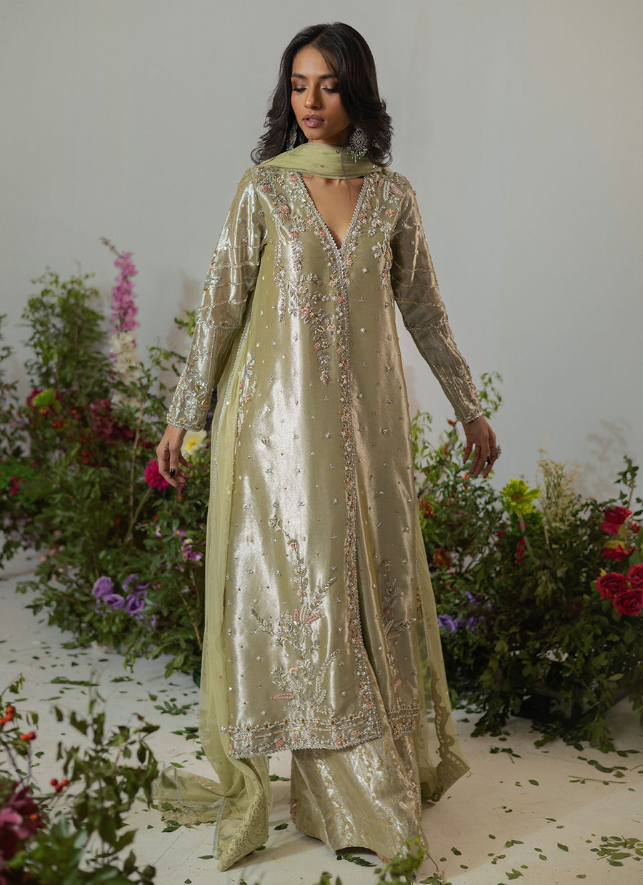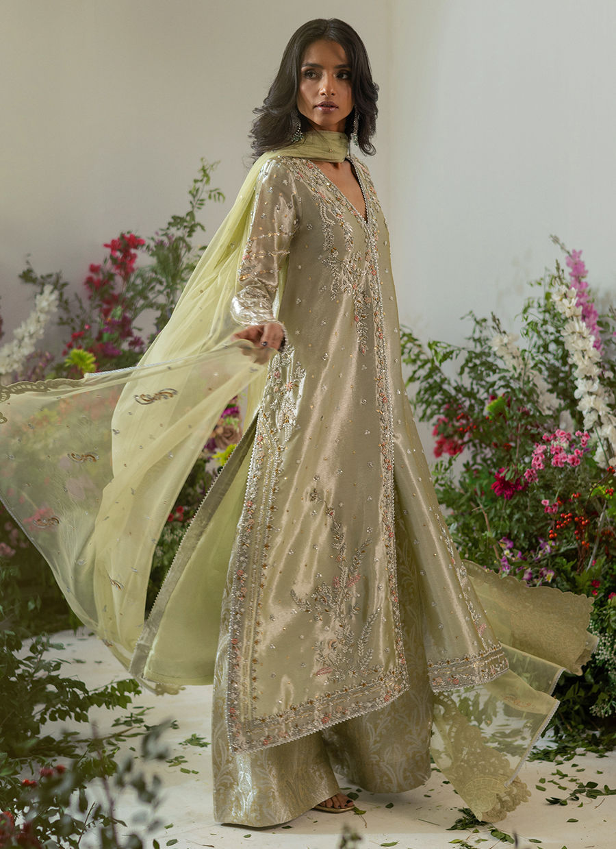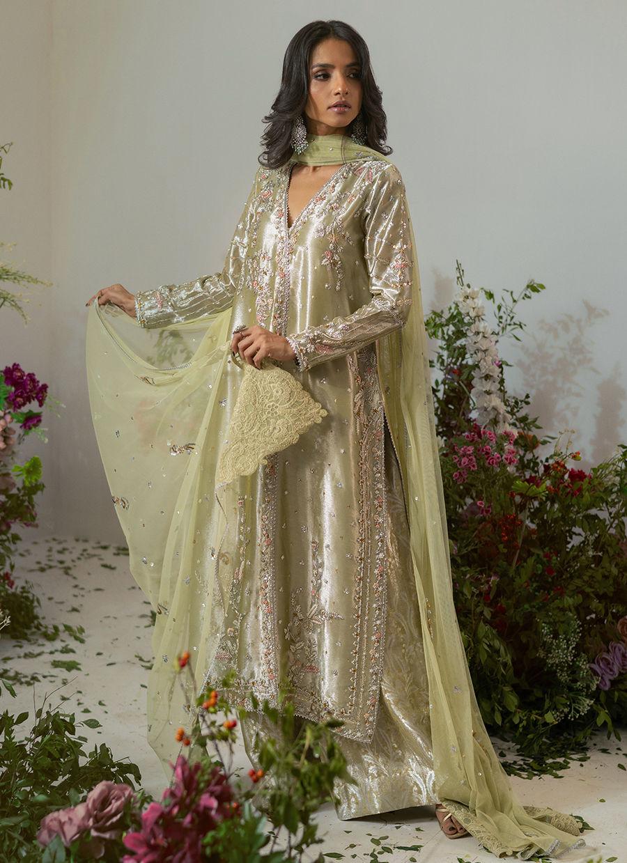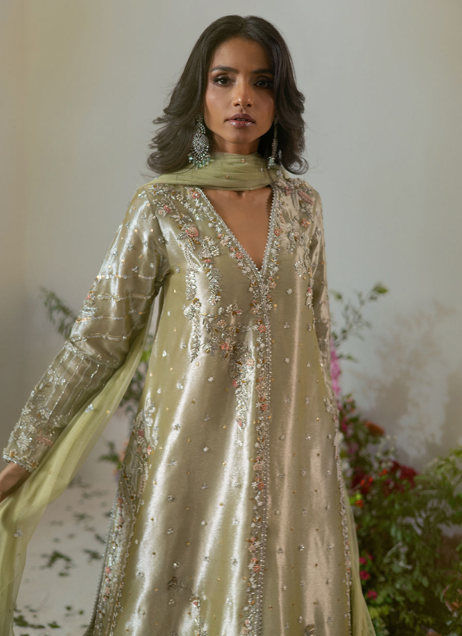 Long silhouette A line Angharka in olive gold shade featuring intricate silver and gold zardozi details. The angharka is paired with flared damask pants and a net dupatta featuring appliqué zari motifs on each pallu.