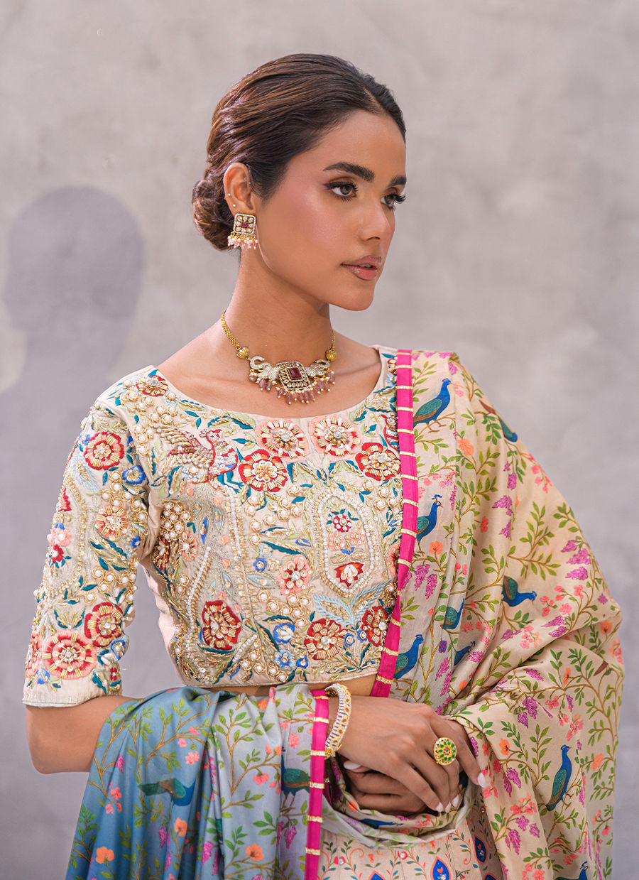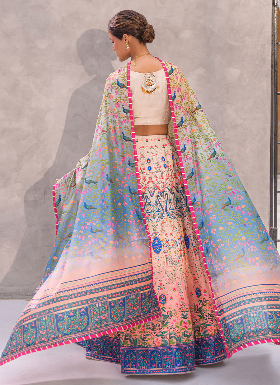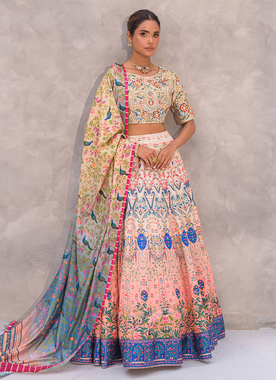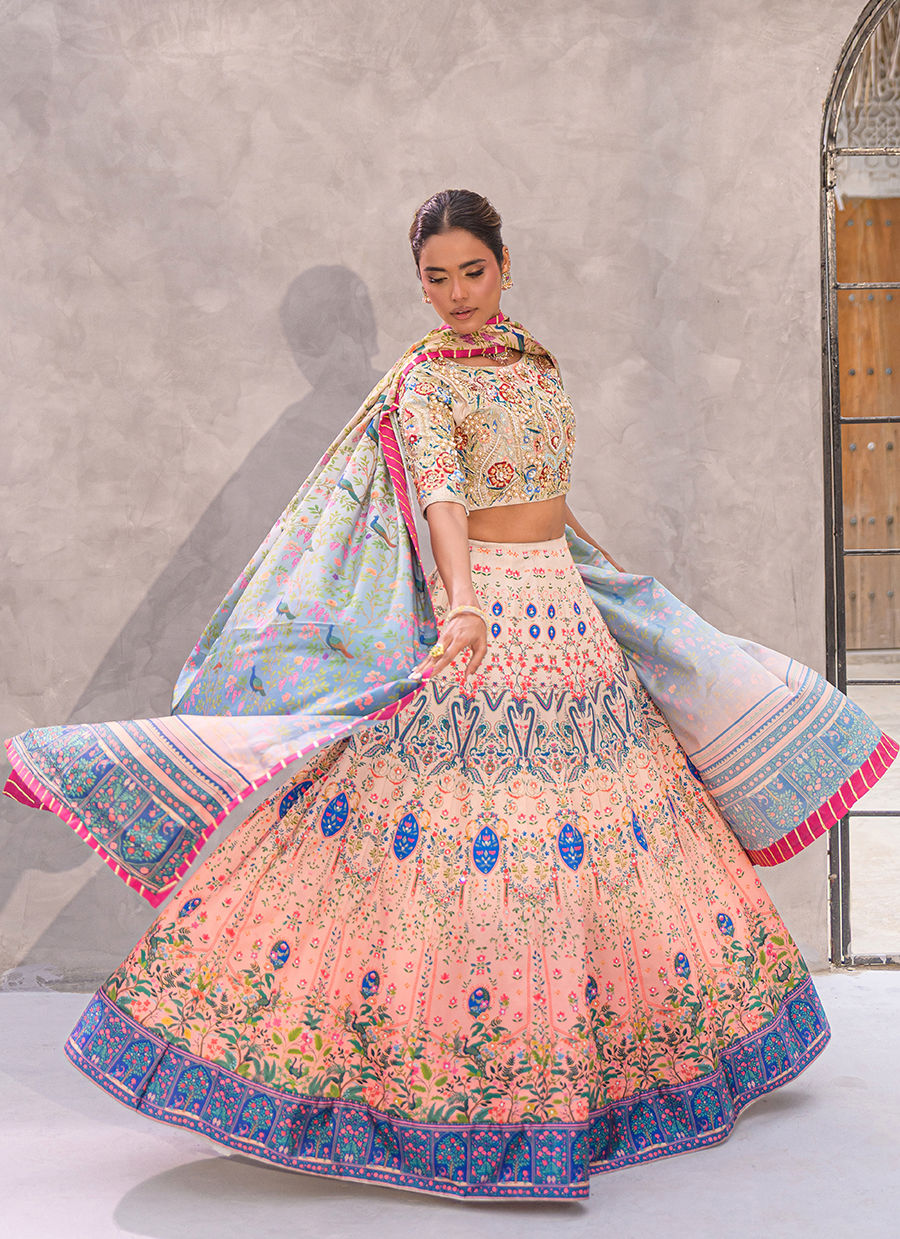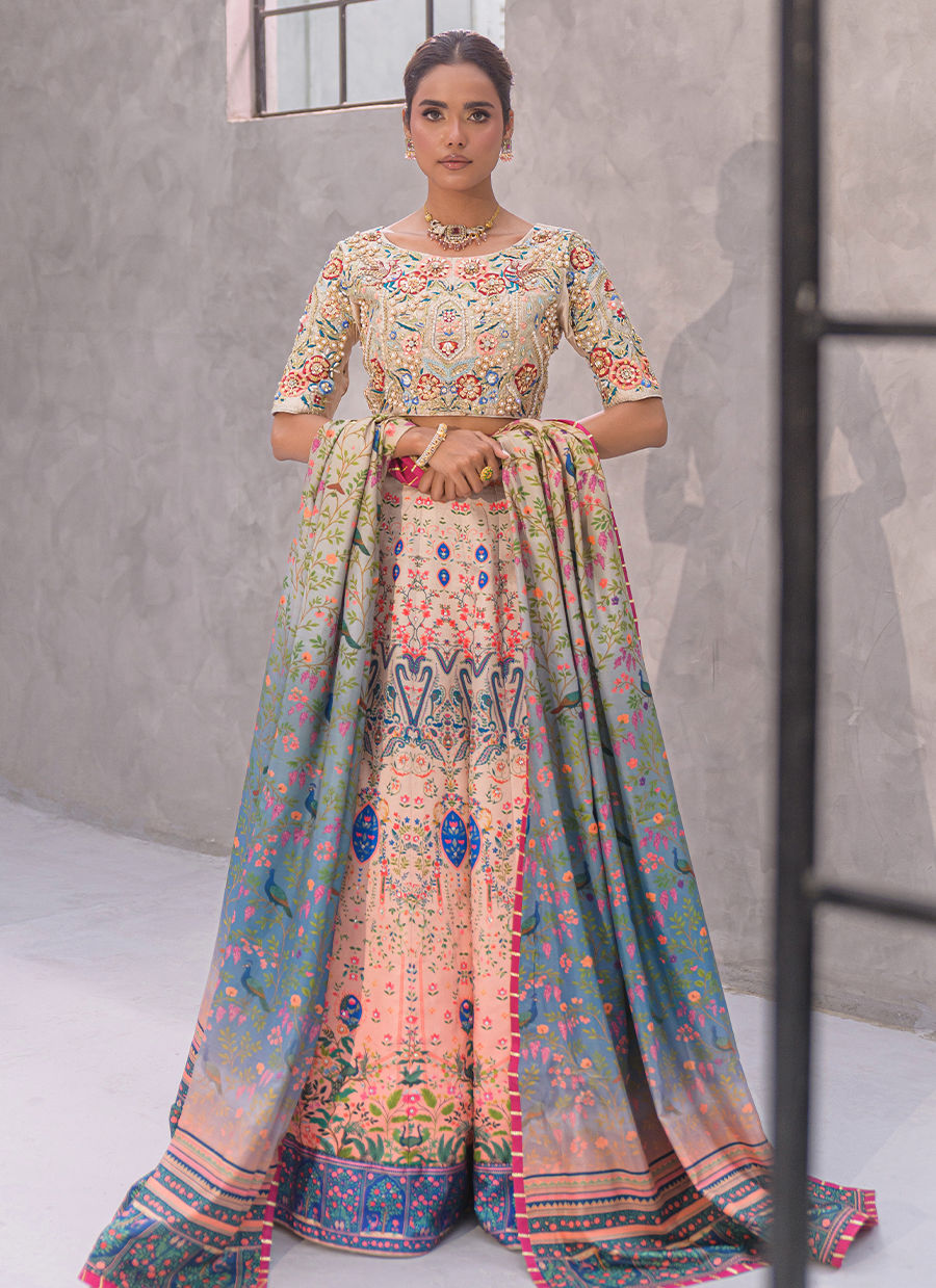 A breathtaking lehenga choli in pastel tones, adorned with an intricate digital-Embroidered pattern that blends florals and geometric artistry. The gradient shades of aqua, peach, and lilac create a dreamlike canvas, while the fully worked blouseenhances the ensemble’s richness. A flowing ehenga with a regal fall makes this design a showstopper—perfect for eddings, receptions, or grand festive evenings.