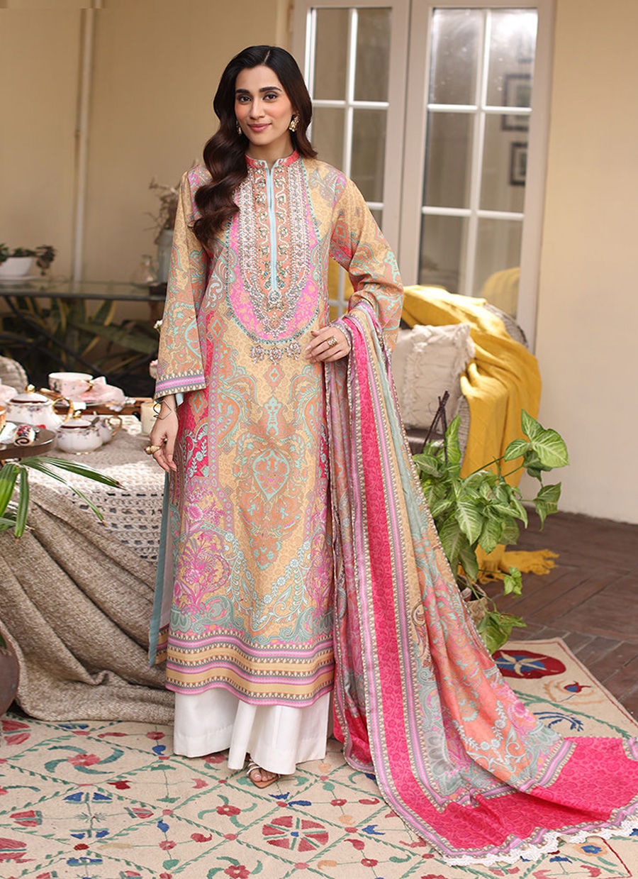 This vibrant ensemble in lemon yellow, coral, pink, and aqua features a Pure Grip shirt, Pure Raw Silk trousers, and a Medium Silk Pure dupatta, blending color and sophistication perfectly.
