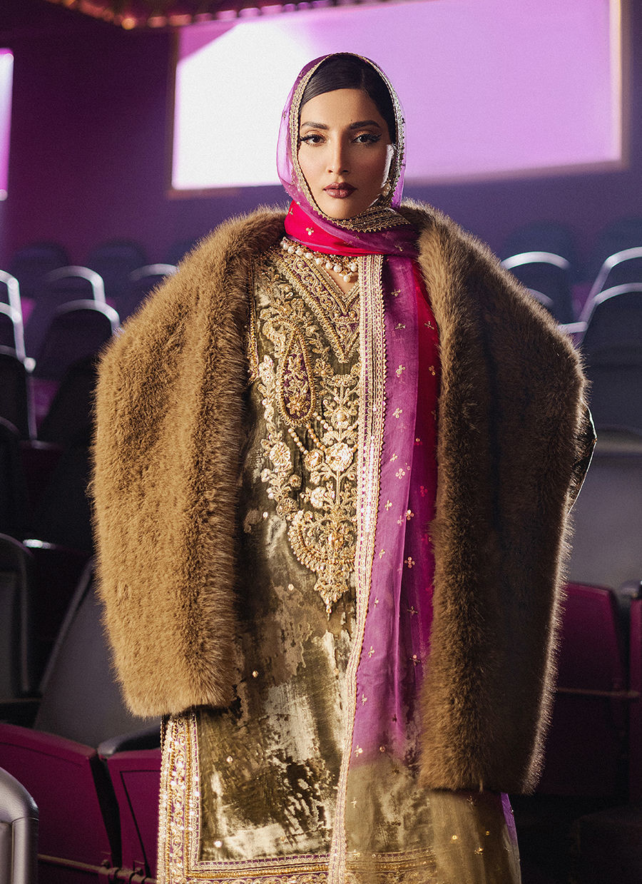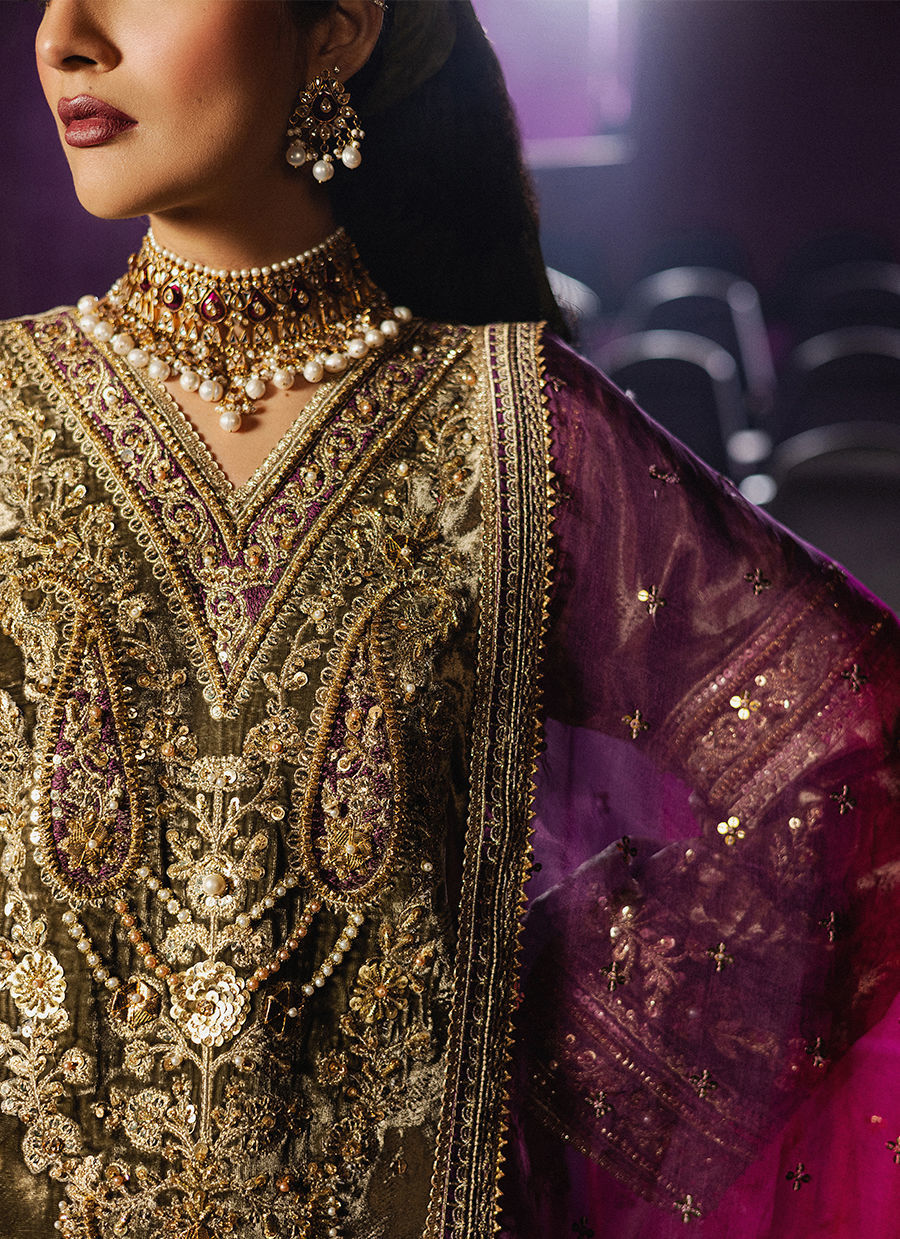 Step into the lush allure of Nisho, where henna-green velvet meets the shimmer of intricate gold embroidery. The shirt is adorned with shimmering embellishments across the neckline, depicting jeweled strands and paisleys cascading down the front. The sleeves feature Mughal-inspired floral motifs and geometric patterned borders, creating an enchanting spectacle. A block-printed shalwar with gota kinari detailing adds a playful yet sophisticated flair, while the tie-dyed dupatta in vibrant rose pink and henna green, adorned with a spray of sequins and golden embroidered border, frames the look