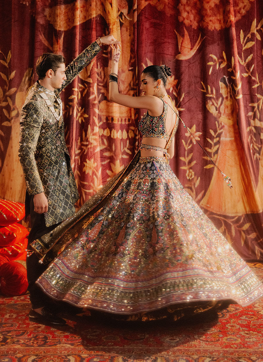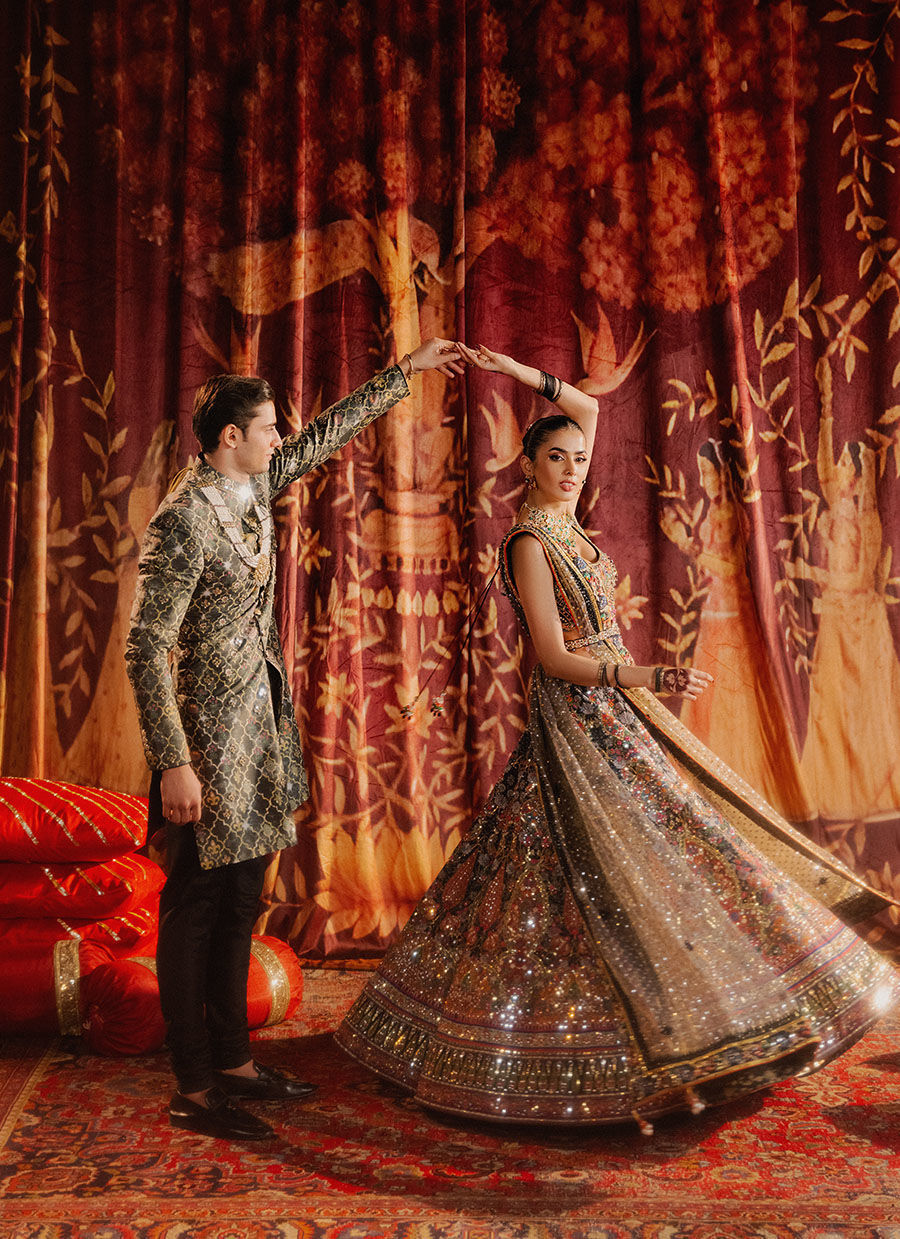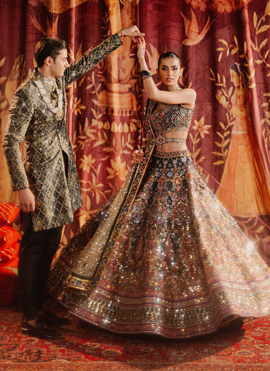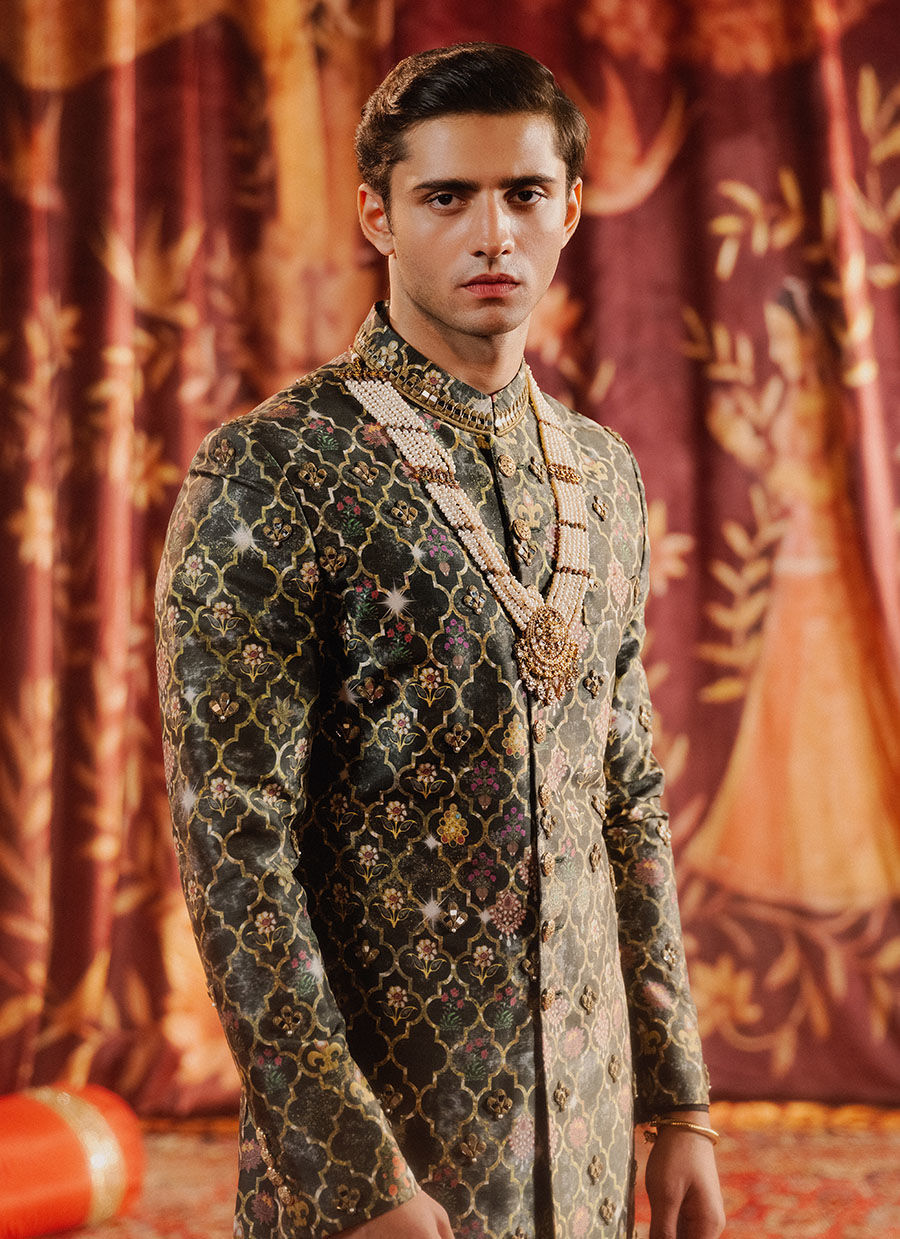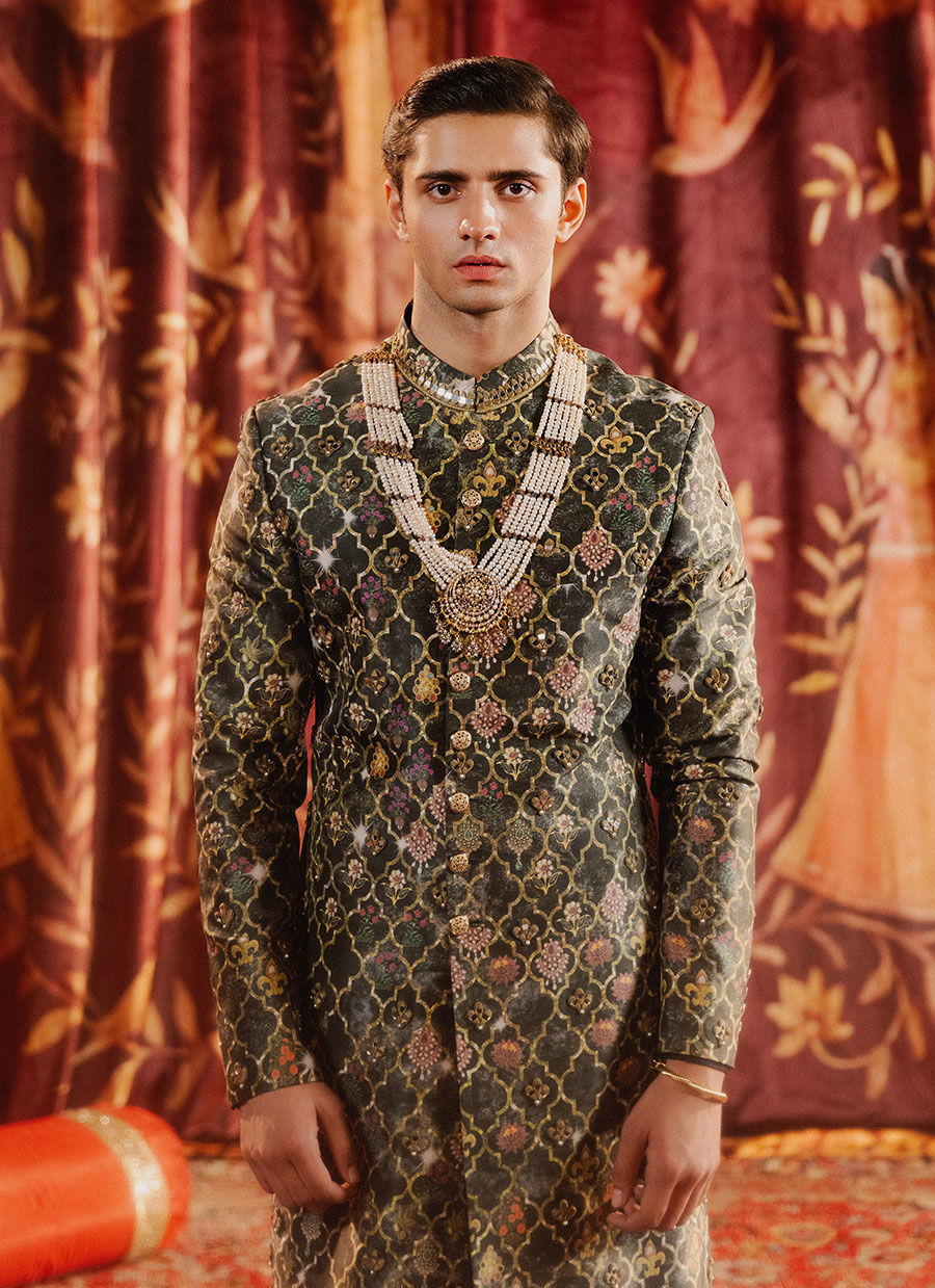 Printed Rawsilk sherwani with distinct mirror detailing, and collar to match.