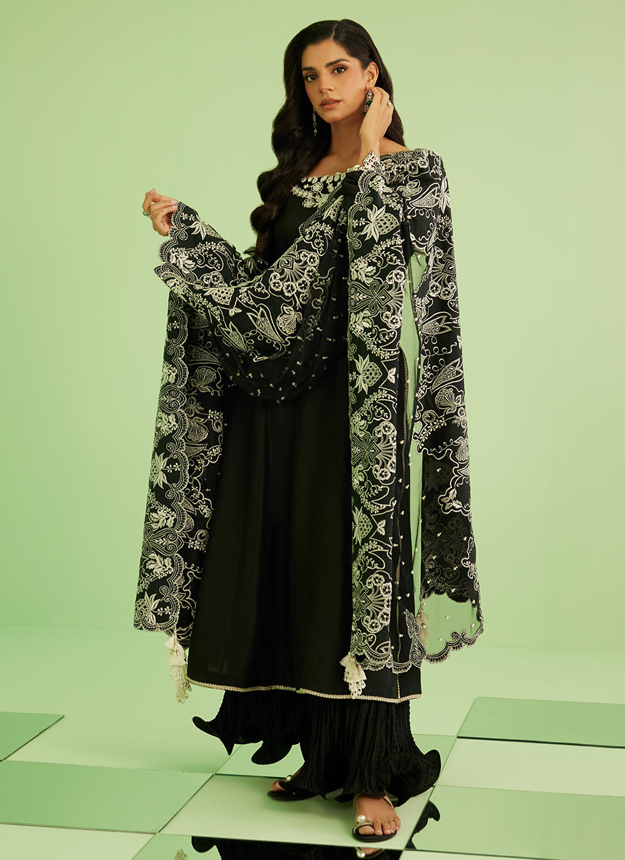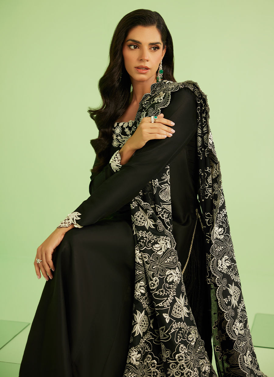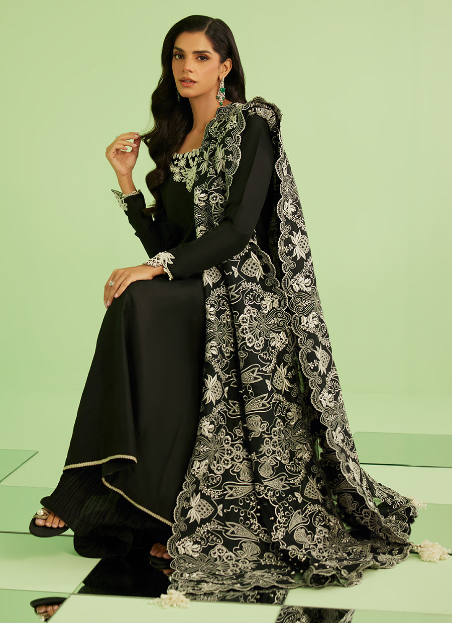 Sanam Saeed embodies effortless sophistication in Noir Élan — a timeless black ensemble designed to make a quiet yet powerful statement. The flowing khalidar silhouette paired with intricate ivory detailing creates a look that is both graceful and striking, perfect for evening elegance and festive wear.