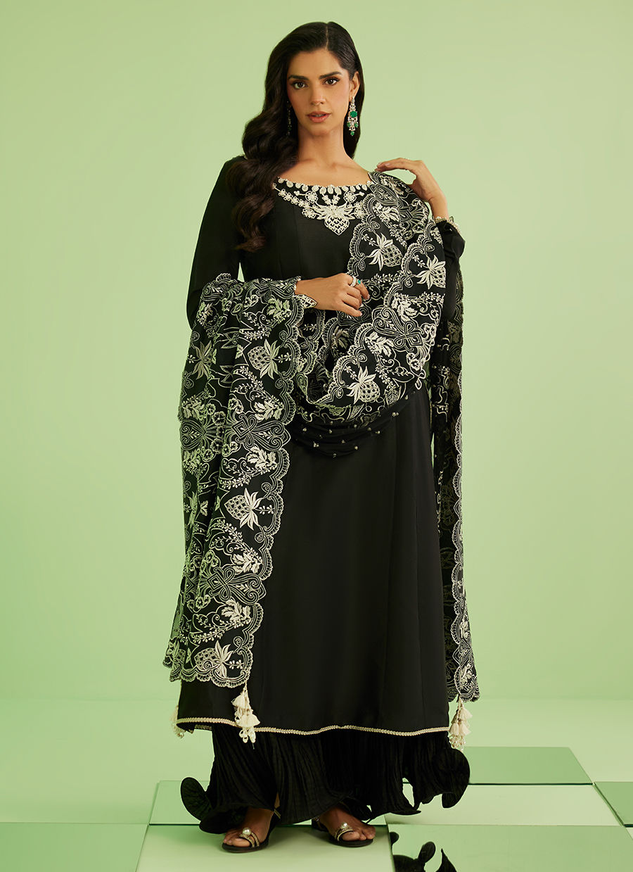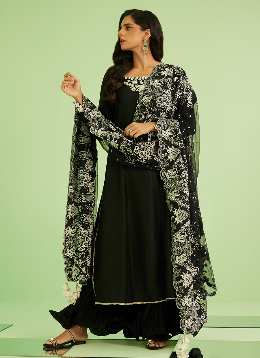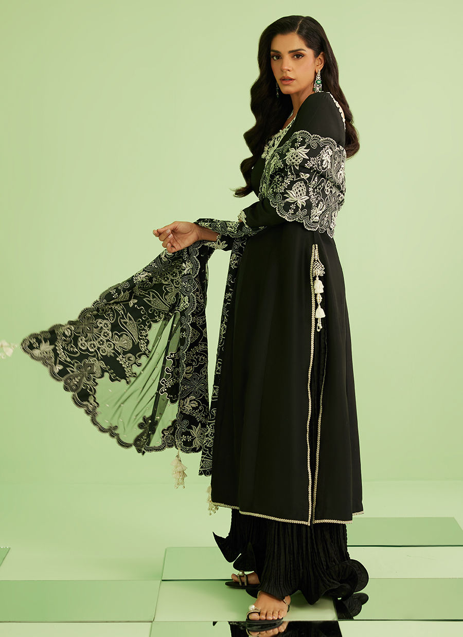 Sanam Saeed embodies effortless sophistication in Noir Élan — a timeless black ensemble designed to make a quiet yet powerful statement. The flowing khalidar silhouette paired with intricate ivory detailing creates a look that is both graceful and striking, perfect for evening elegance and festive wear.