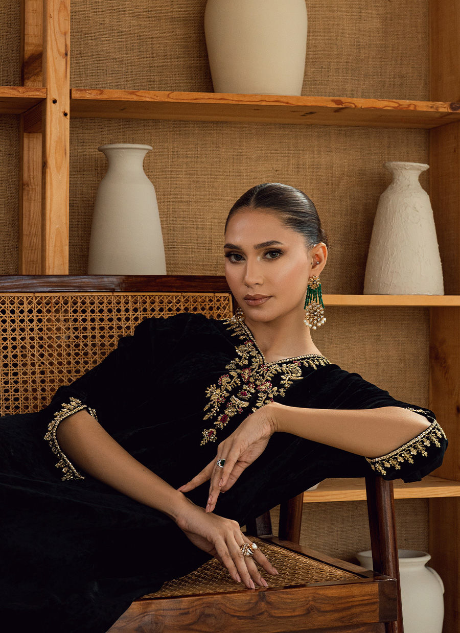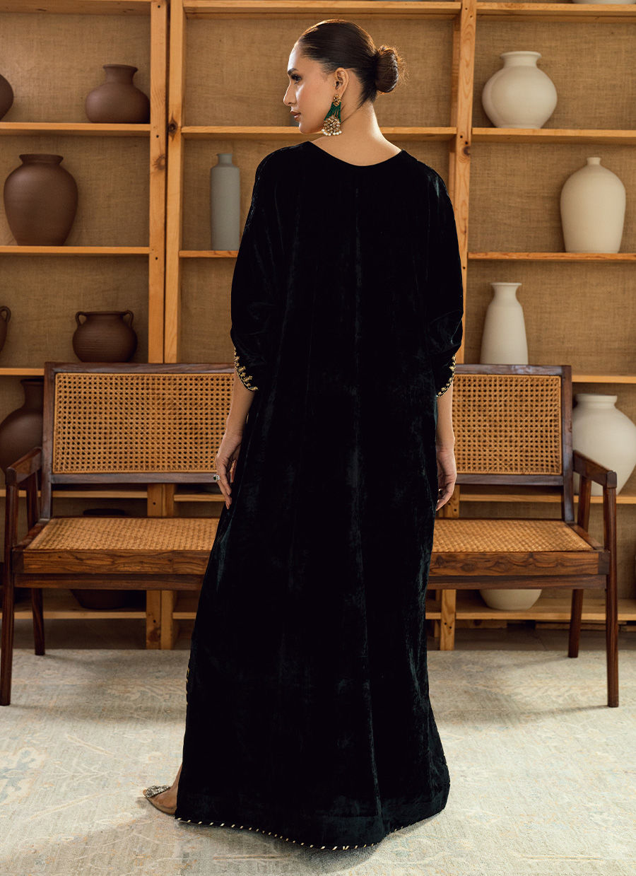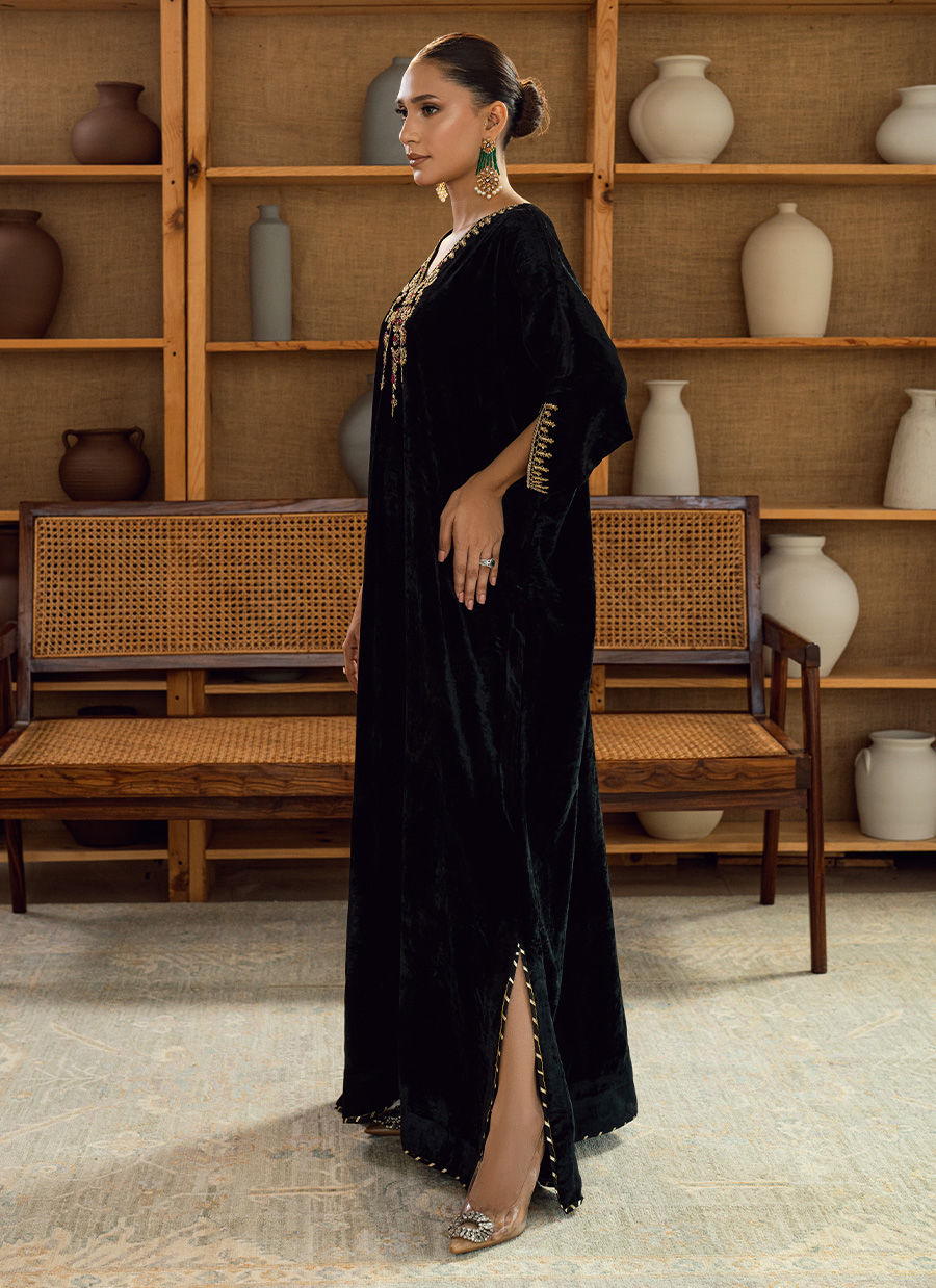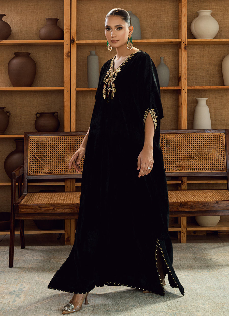 An embodiment of quiet power and refined minimalism, Noir Éclat defines the essence of modern royalty. Crafted in luxurious black silk, this kaftan is a study in understated grandeur—where simplicity commands attention and every detail speaks of mastery. The design features intricate handwork on the neckline, sleeves, and subtle side slits, creating an alluring balance between structure and fluidity. The sleek silhouette enhances its timeless appeal, making it a perfect statement piece for high-profile soirées, formal evenings, or elegant gatherings. With its effortless grace and couture precision, Noir Éclat isn’t just worn—it’s owned. A true power statement for the woman who embodies elegance with authority.
