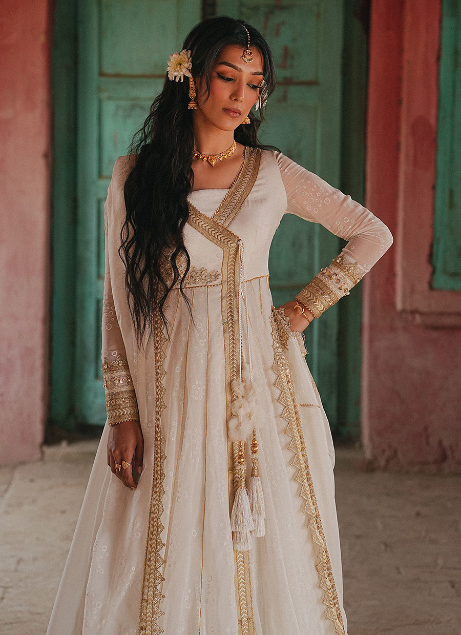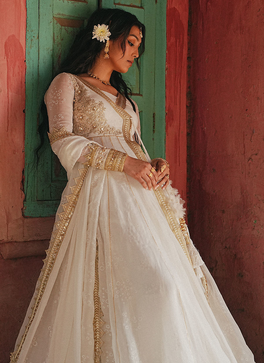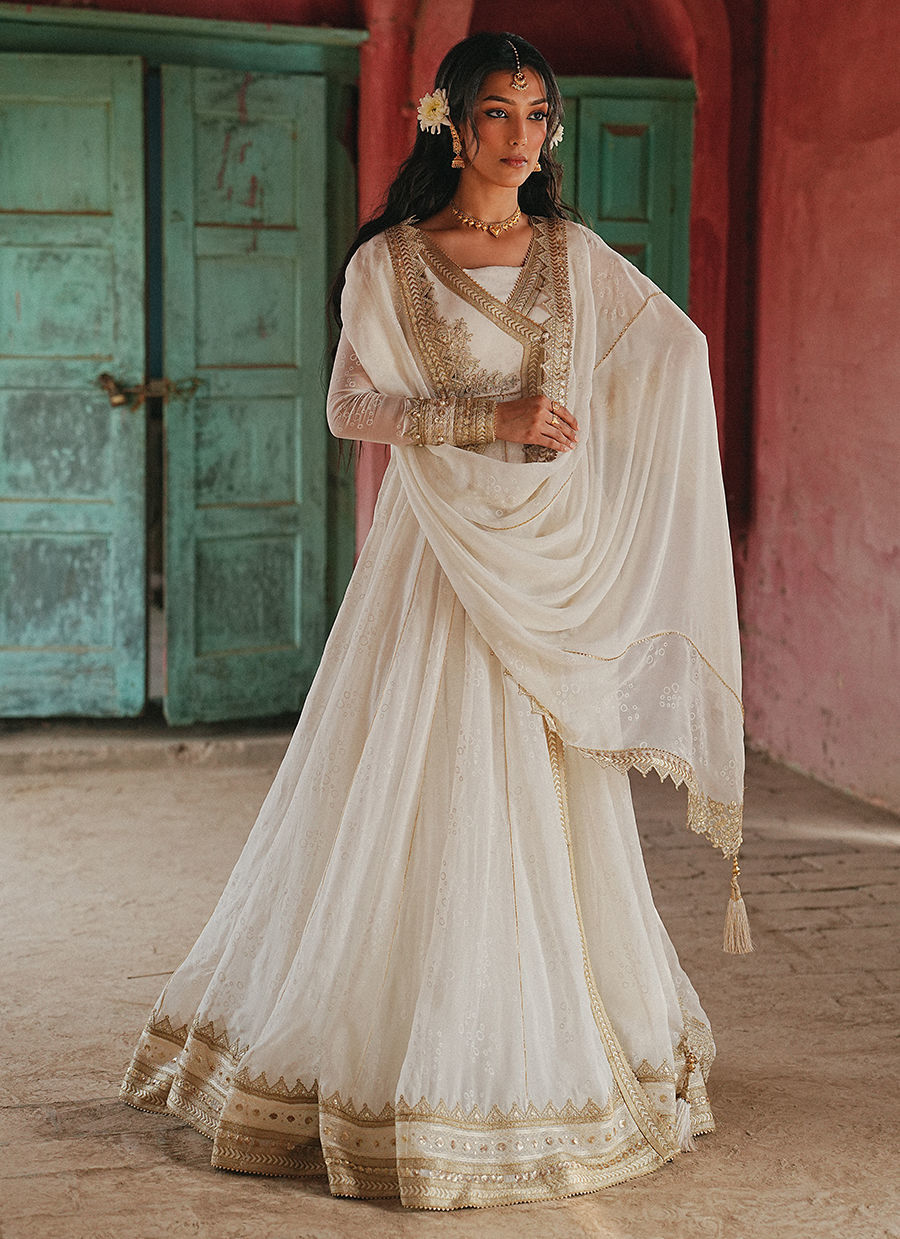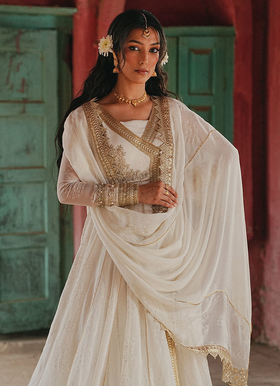 A creamy white chiffon embossed peshwas that captures understated elegance, highlighted by contrasting tilla and sequin borders for a touch of shimmer. The bodice is intricately detailed with delicate dori work and subtle embellished motifs, adding depth and refinement. It is paired with a classic churidar, while a matching embossed chiffon dupatta, finished with a refined border, completes the ensemble with graceful sophistication.