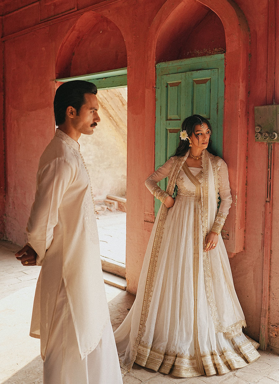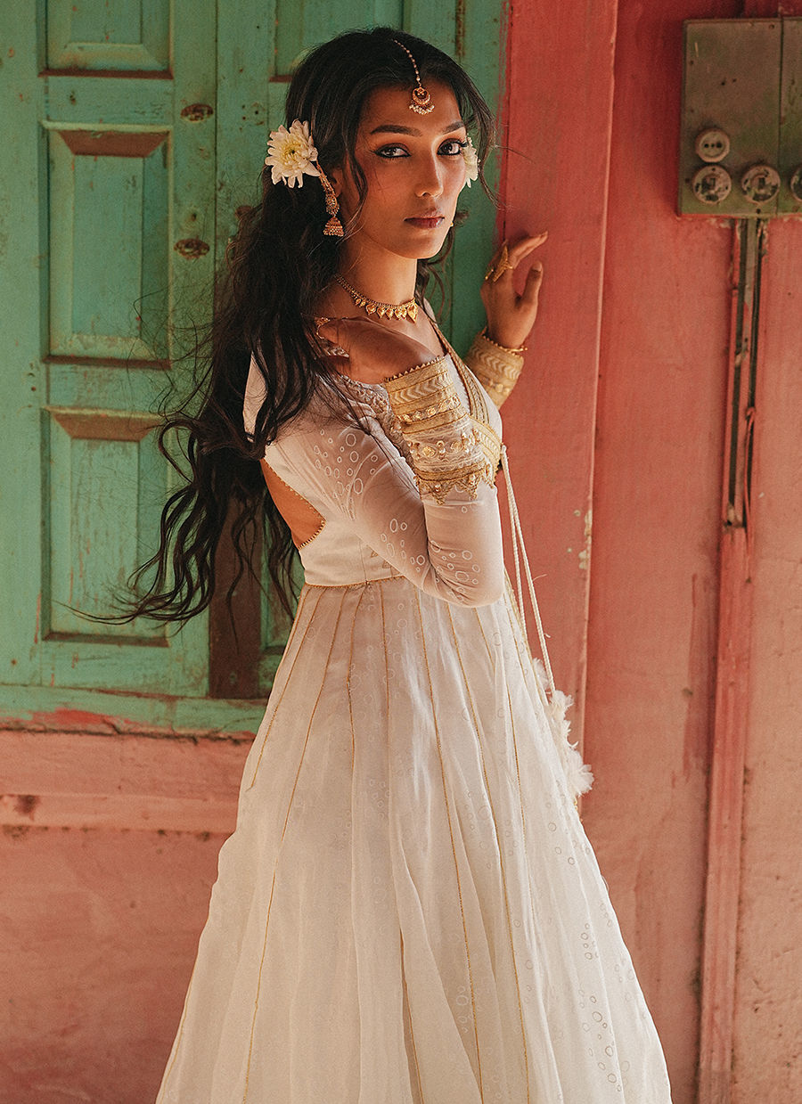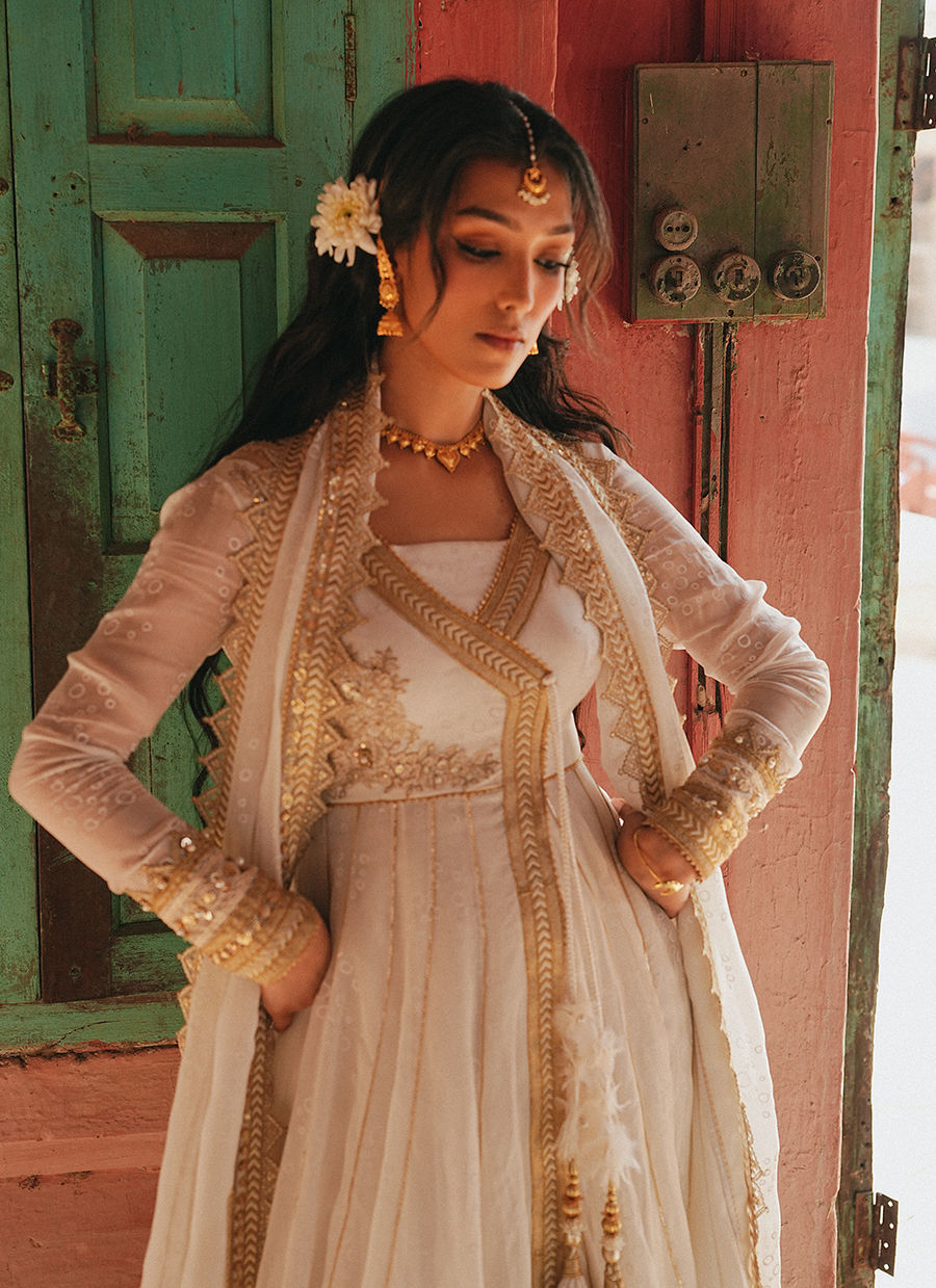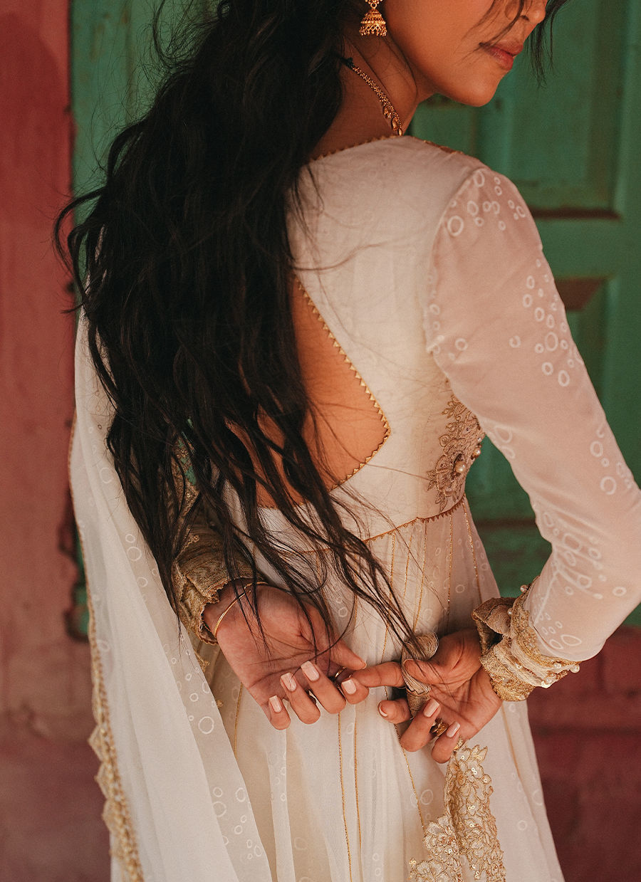 A creamy white chiffon embossed peshwas that captures understated elegance, highlighted by contrasting tilla and sequin borders for a touch of shimmer. The bodice is intricately detailed with delicate dori work and subtle embellished motifs, adding depth and refinement. It is paired with a classic churidar, while a matching embossed chiffon dupatta, finished with a refined border, completes the ensemble with graceful sophistication.
