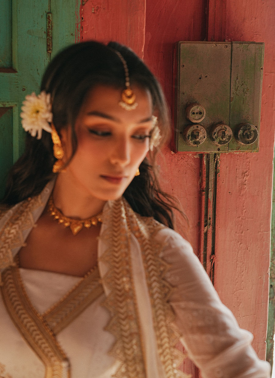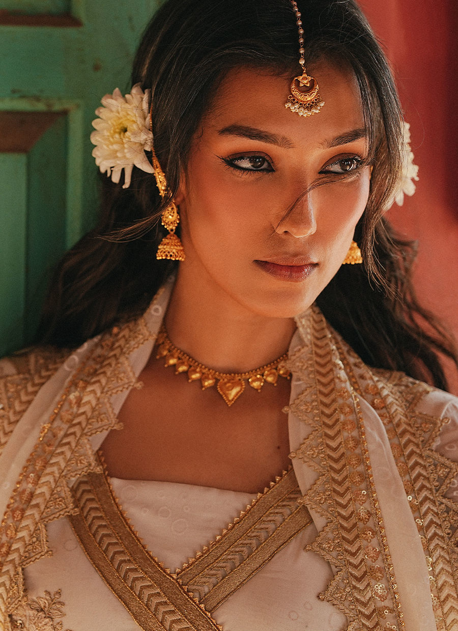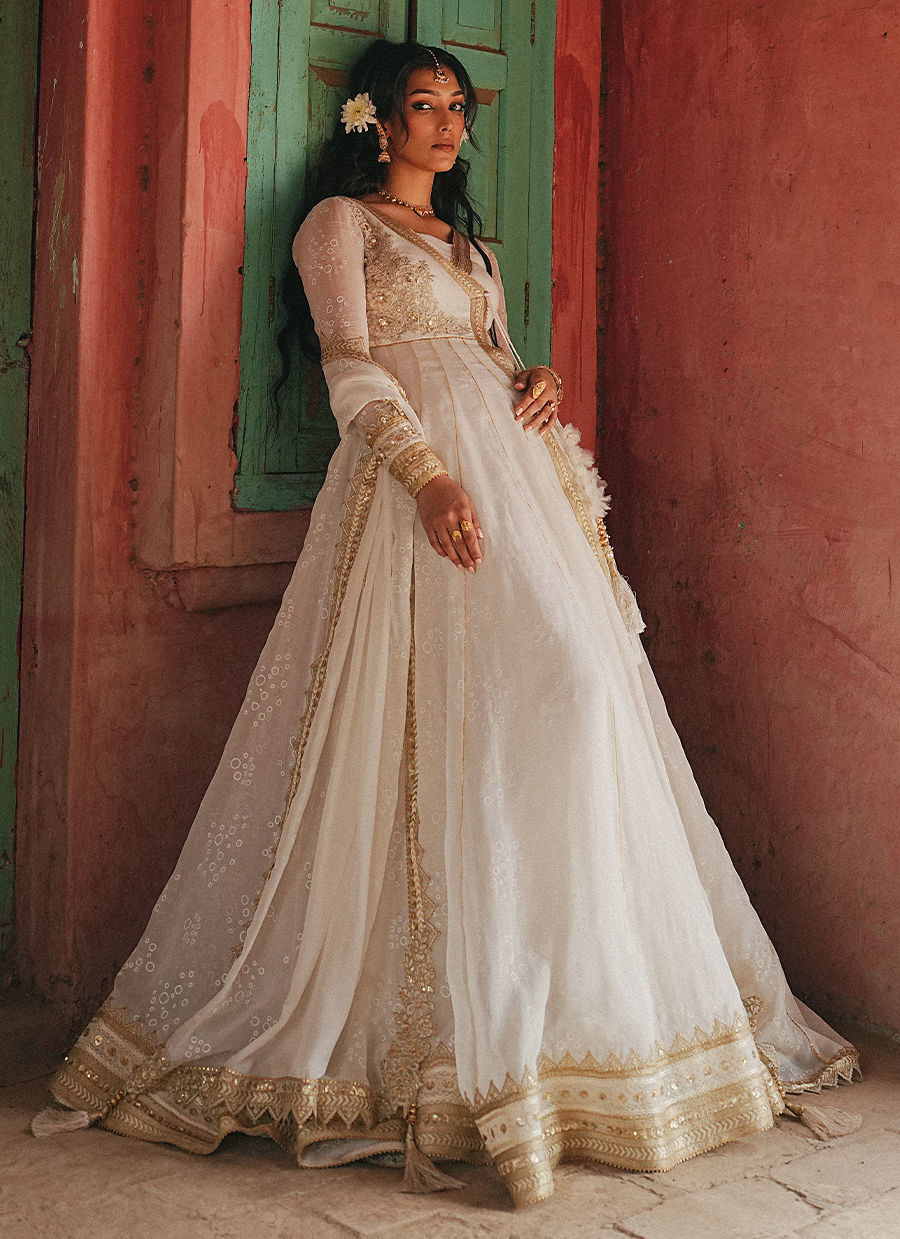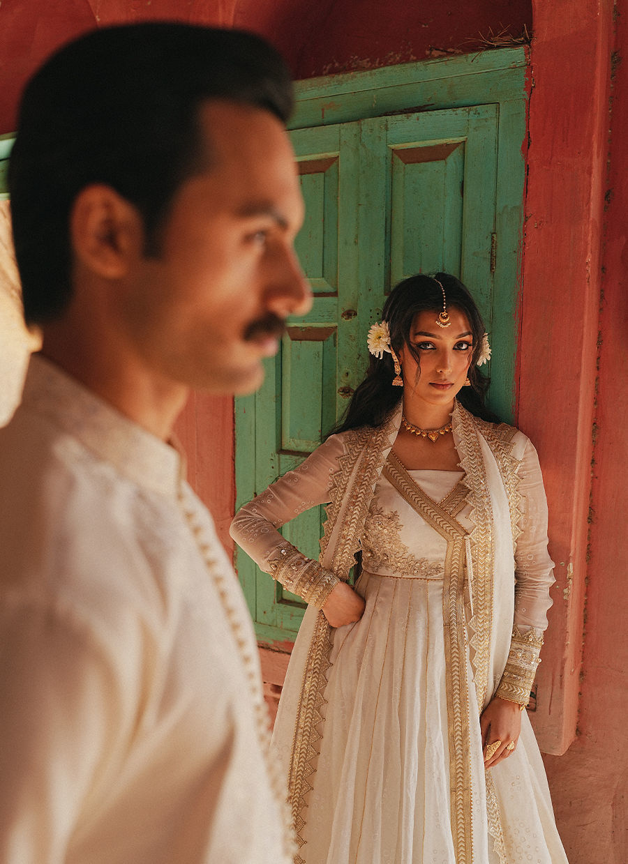 A creamy white chiffon embossed peshwas that captures understated elegance, highlighted by contrasting tilla and sequin borders for a touch of shimmer. The bodice is intricately detailed with delicate dori work and subtle embellished motifs, adding depth and refinement. It is paired with a classic churidar, while a matching embossed chiffon dupatta, finished with a refined border, completes the ensemble with graceful sophistication.