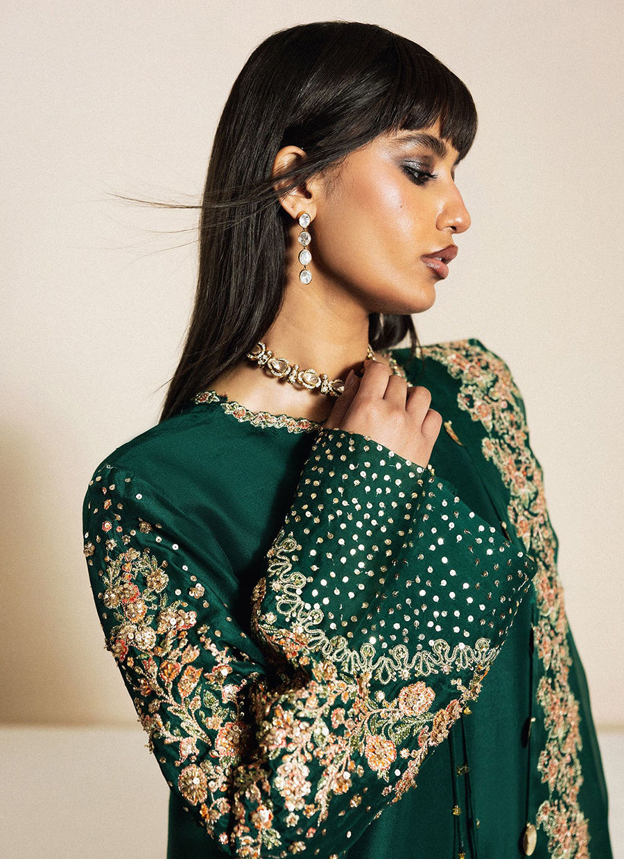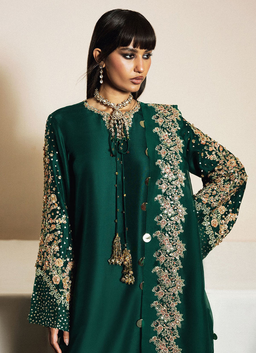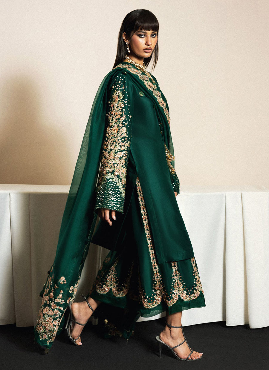 An elegant, deep emerald green ensemble crafted in a sleek, straight silhouette. The raw silk kurta features intricate floral embroidery on the sleeves and is enhanced with hand embellishment and delicate tassel detailing at the neckline. Paired with matching pure raw silk embroidered trousers and a heavily embroidered organza dupatta, Pallou Border is joined with lace; the outfit blends traditional craftsmanship with refined modern grace, perfect for festive and formal occasions.