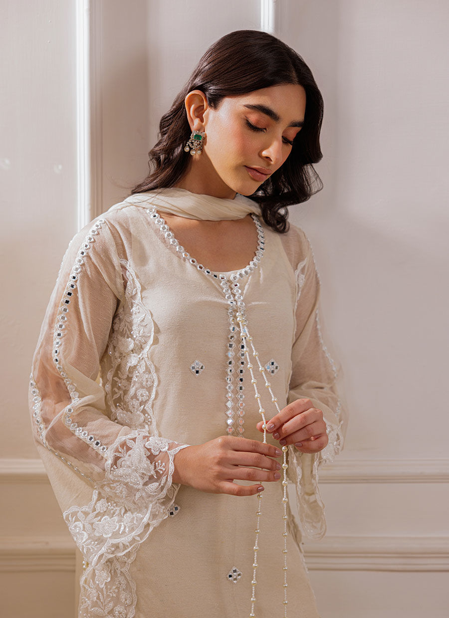 The Noreena beige cotton net shirt is adorned with exquisite mirror work and scalloped cutwork, featuring 3D appliqué cutwork borders with delicate petal detailing on the sides. Handmade pearl tassels hang gracefully from the sides, adding a touch of elegance. The separate slip and mirror work sleeves in organza with bordered detailing complete the look. The ensemble is paired with chiffon dupatta with a cutwork appliqué border and cigarette cotton silk pants for a refined finish.