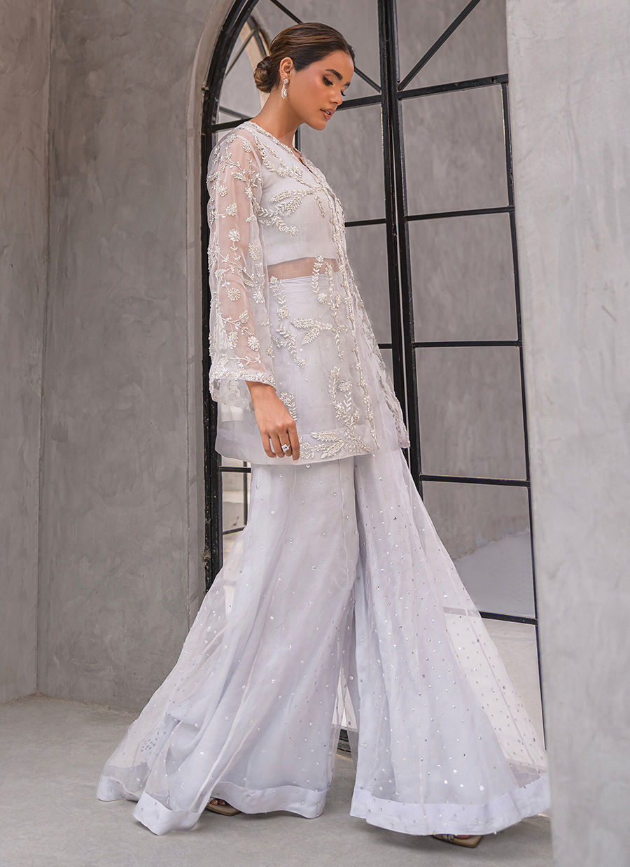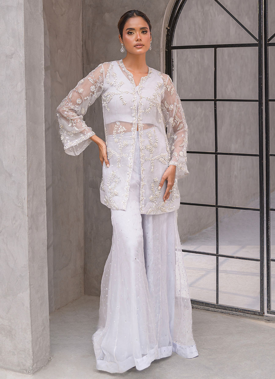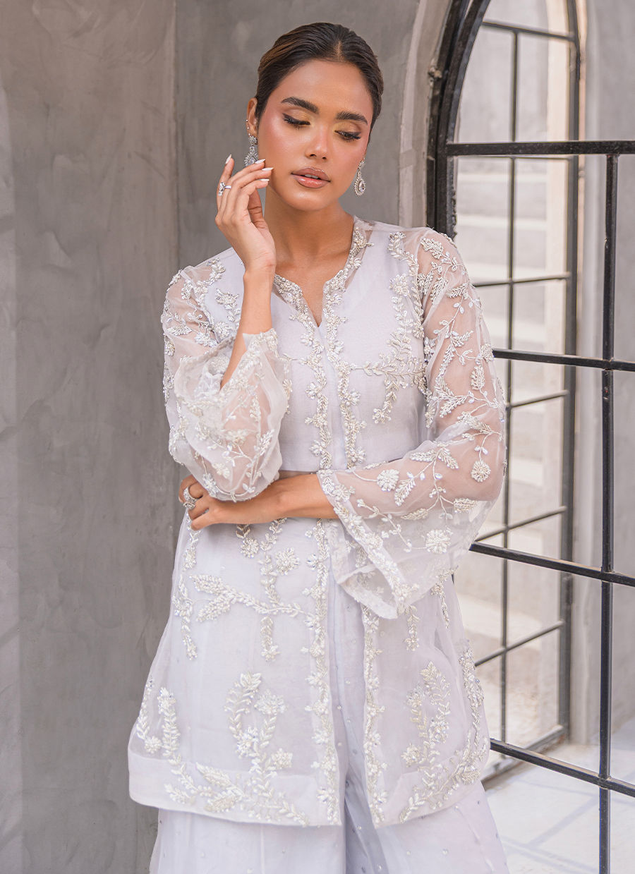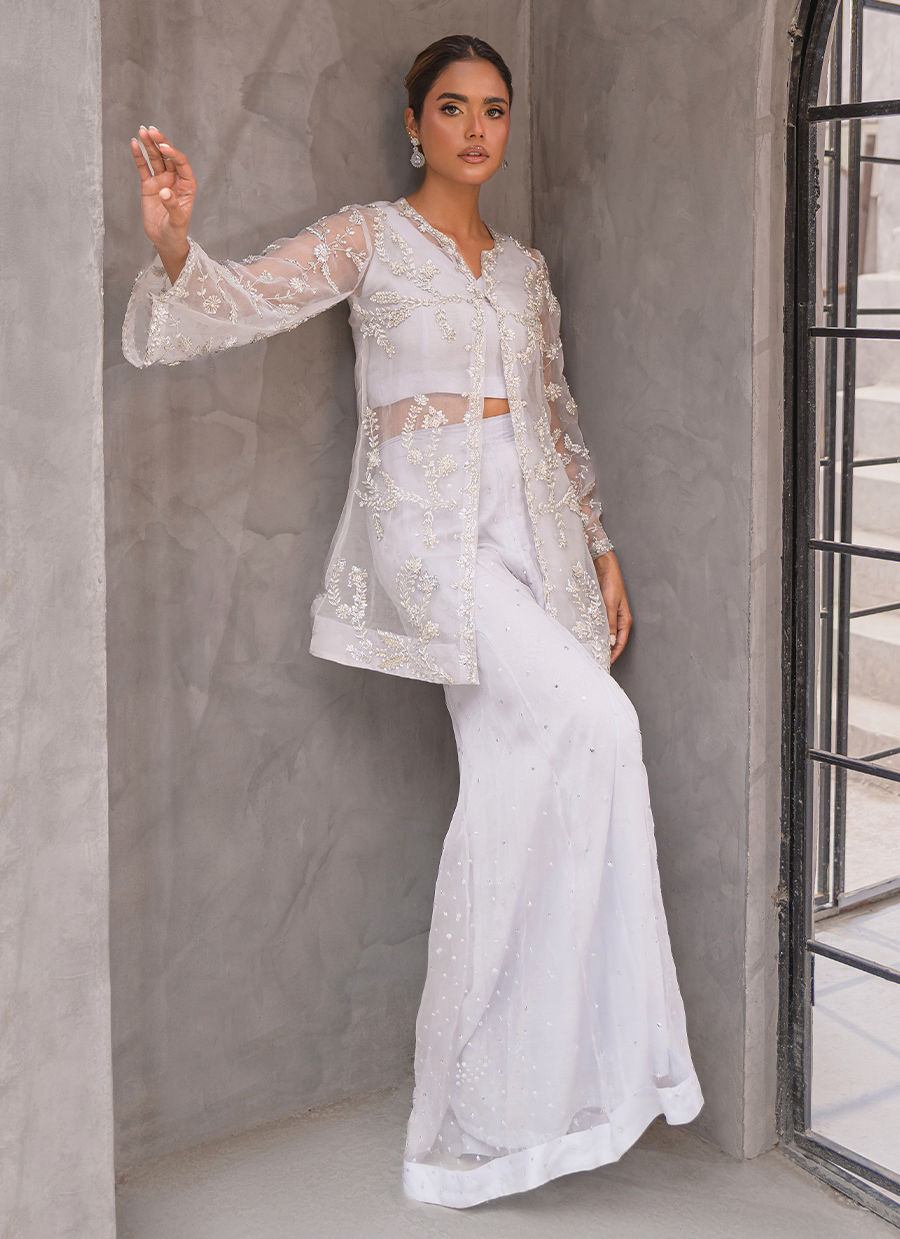 A graceful ivory-white ensemble exuding delicacy and poise. The sheer organza jacket, intricately adorned with pearls, sequins, and silver threadwork, is layered over a tonal inner and wide palazzo pants with subtle shimmer detailing. Light, airy, and radiant, this look is ideal for nikkah ceremonies, receptions, and sophisticated soirées