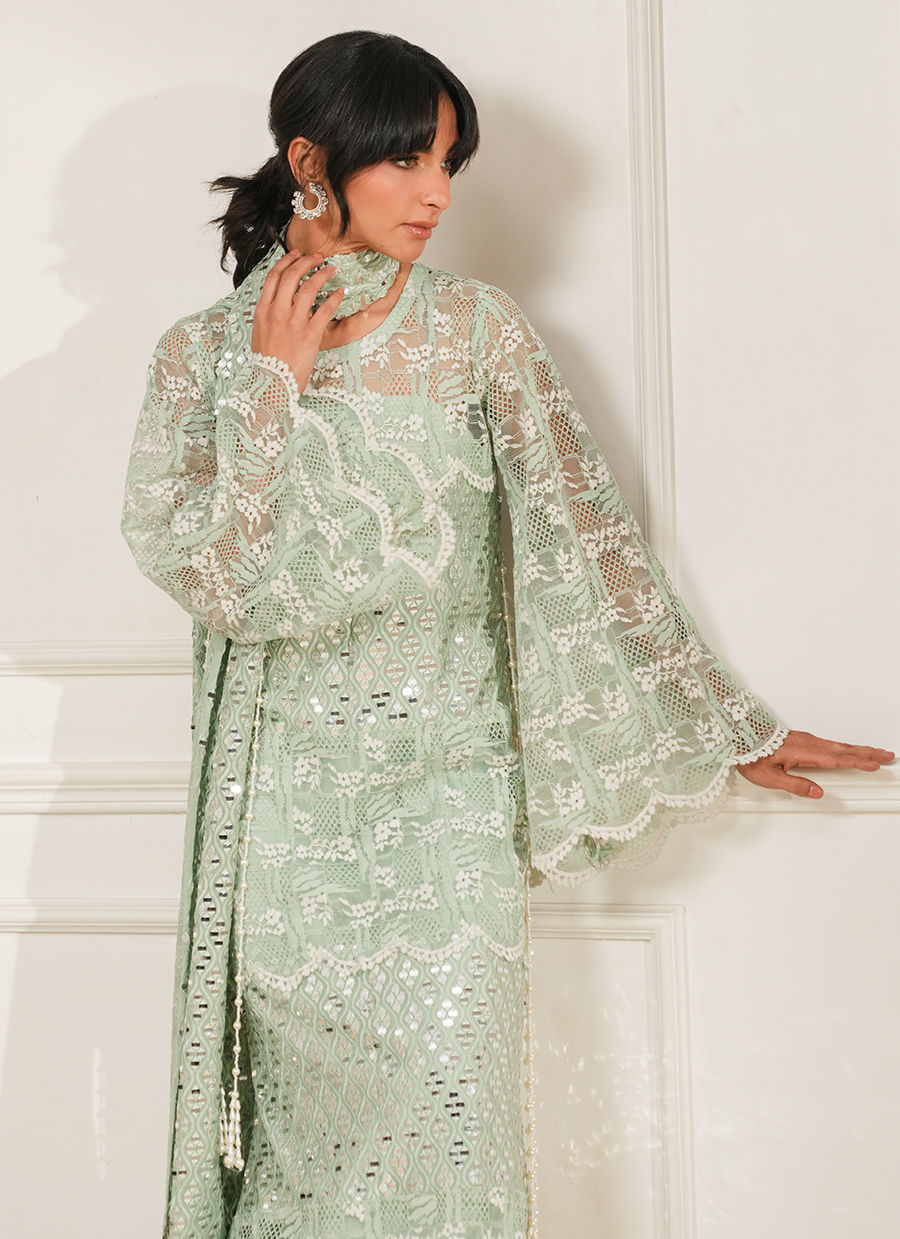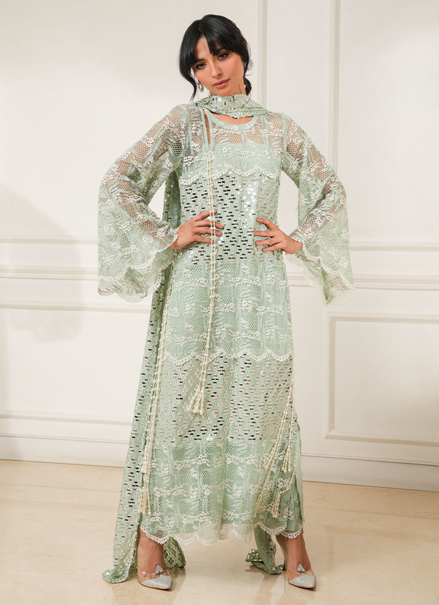 Lace and gorgette chiffon foil work on the shirt and handmade pearls tassels on the side and front