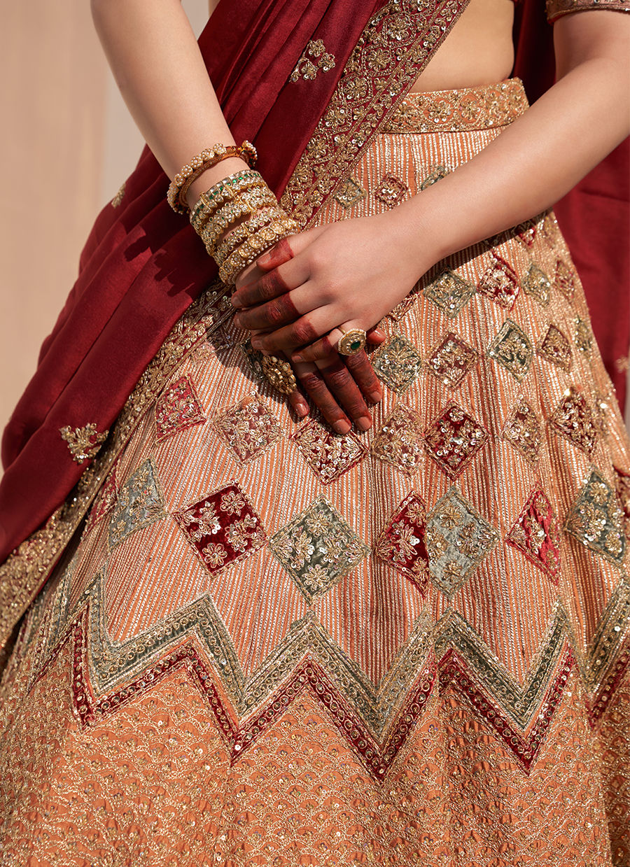 A nude double dupatta lehenga set embroidered with traditional zardozi technique using silken threads, dabka, cutdana, sequins and gota underlayered with multi colored velvet appliques.