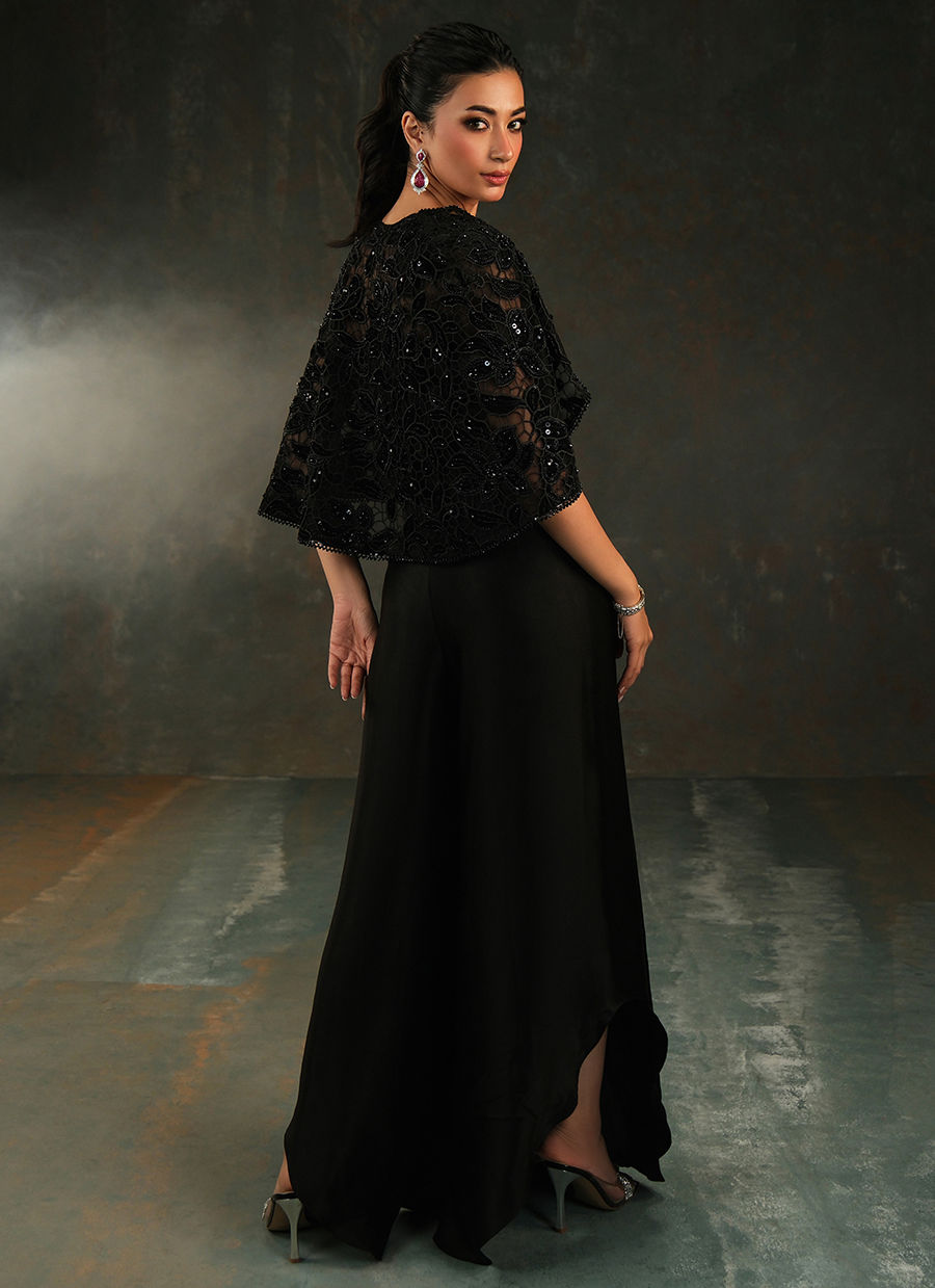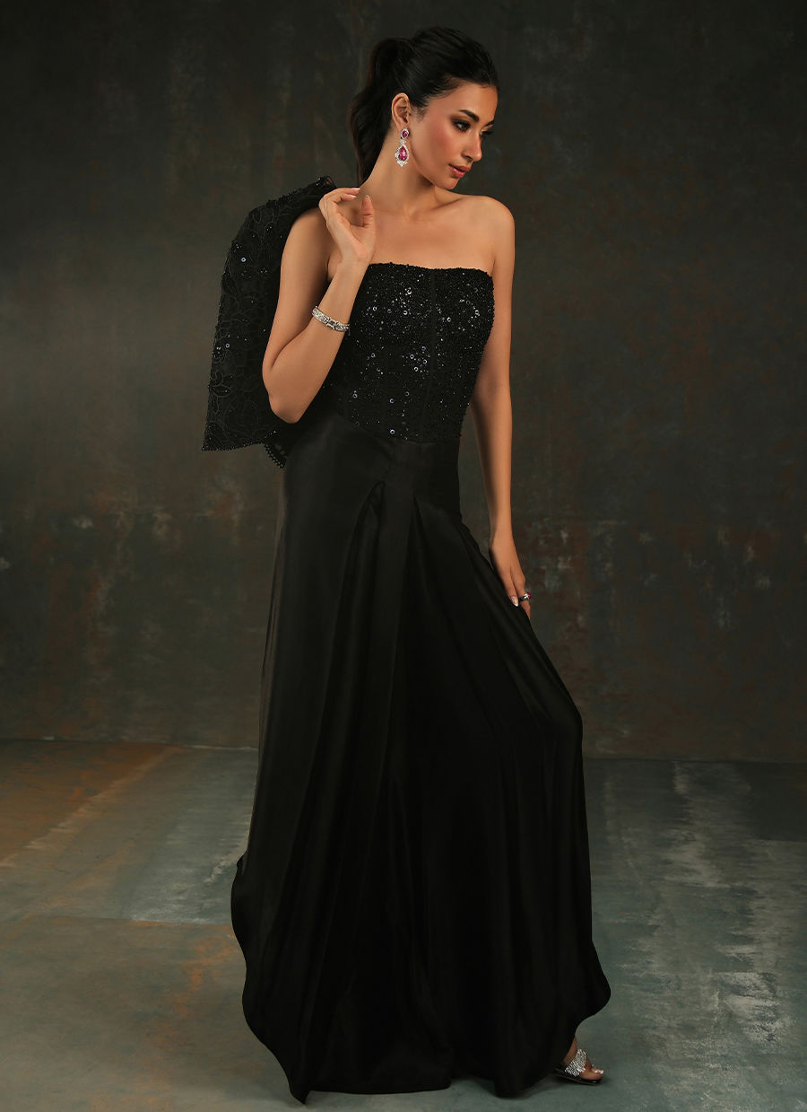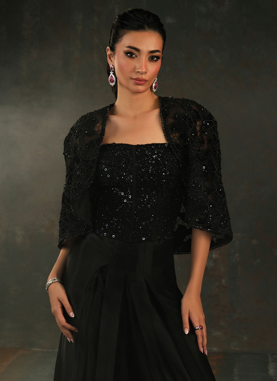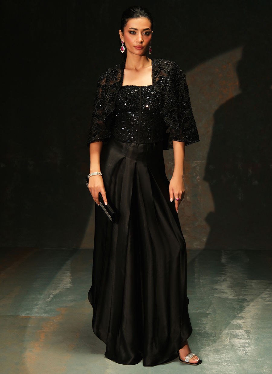 Elevate your evening style with this striking black ensemble, featuring a hand-embroidered velvet-appliqué jacket paired with a sequined and crystal-embellished bustier. The pure satin pleated skirt-pants offer graceful movement with a modern edge, creating a look that is both timeless and powerful. Effortlessly glamorous and refined, this outfit is designed to make you feel confident, polished, and unforgettable.
