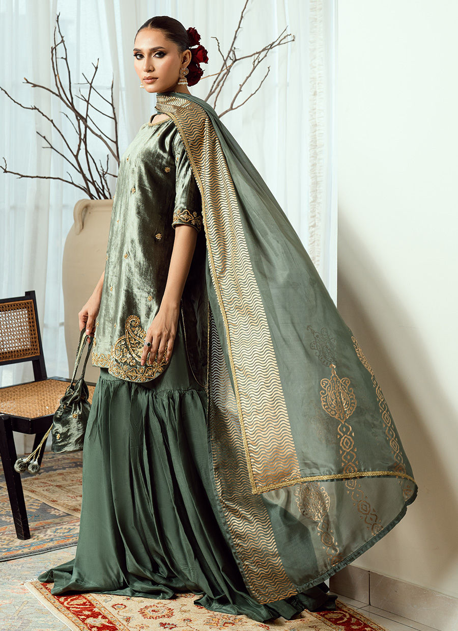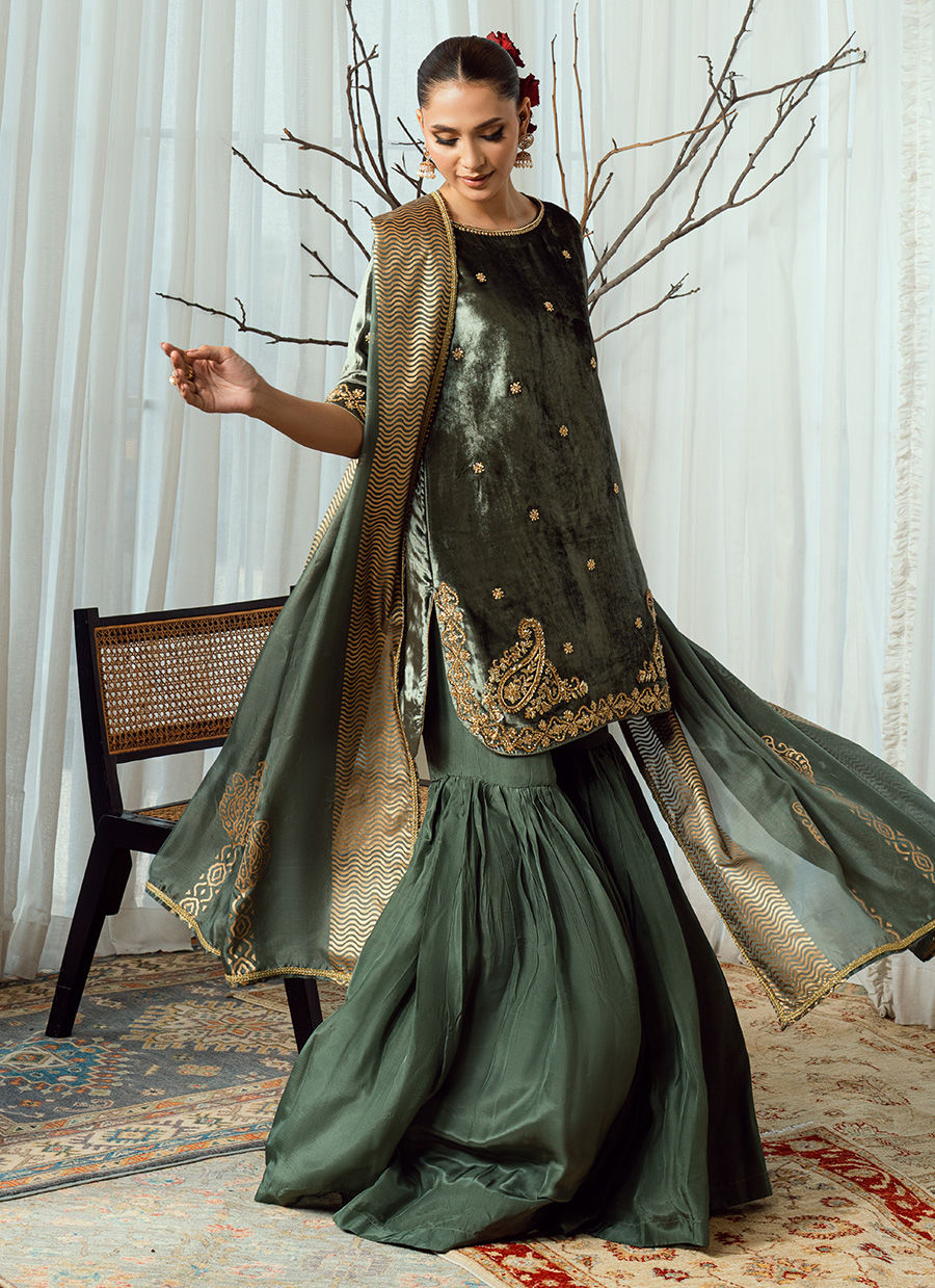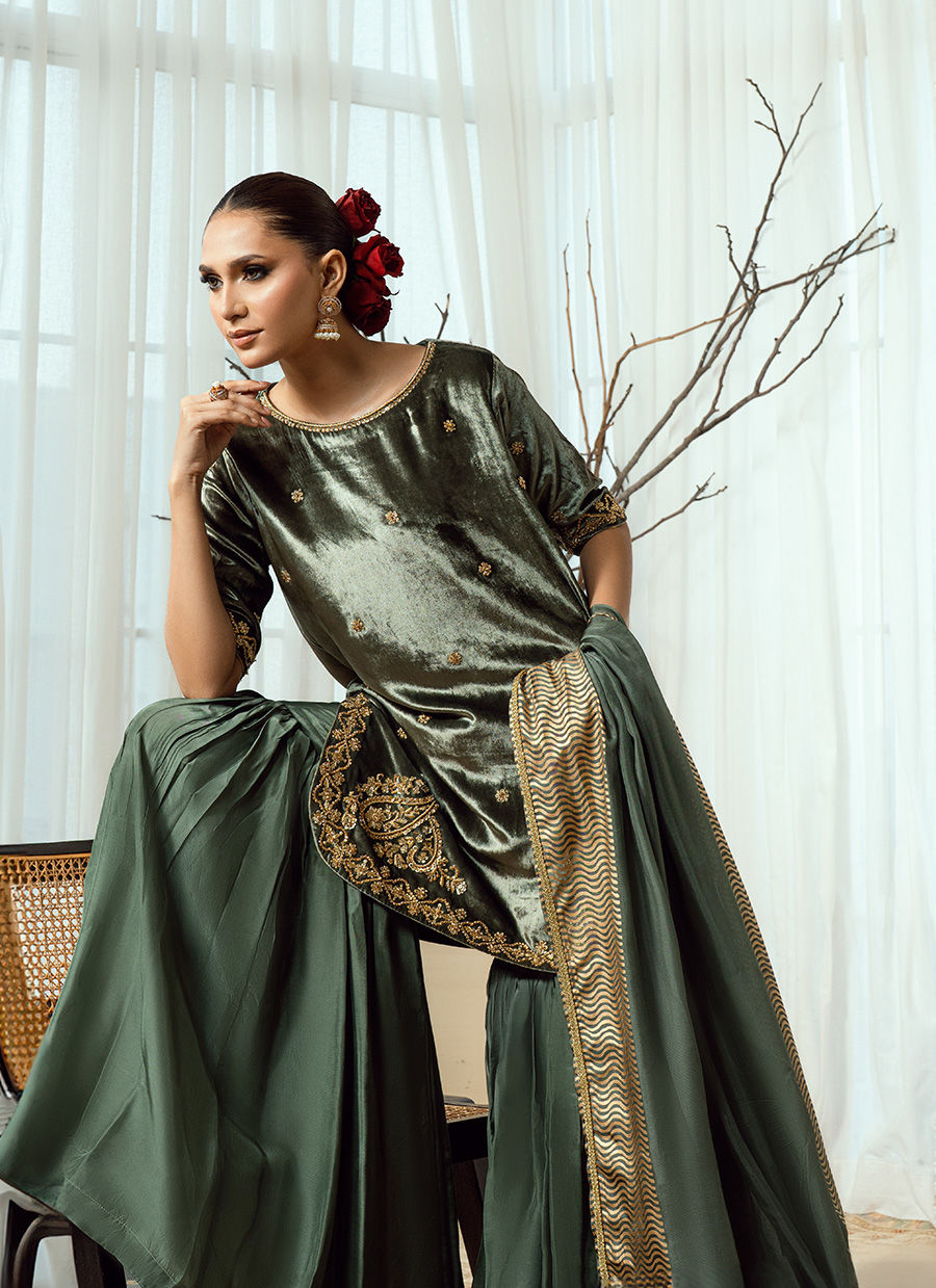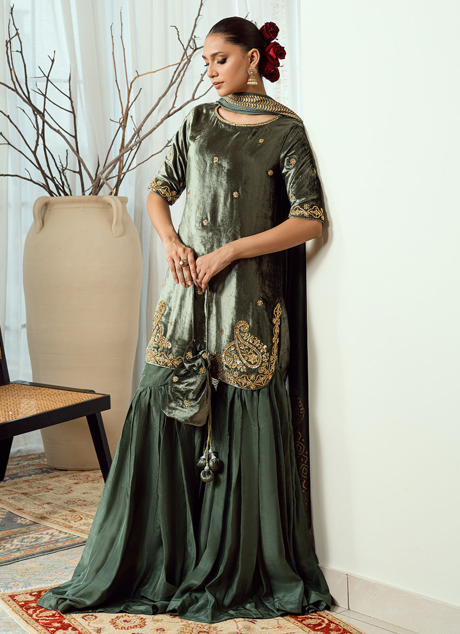 A statement of serene strength and refined luxury, Olive dynasty embodies understated elegance at its finest. The olive-green velvet shirt is delicately detailed with hand-embellished work along the daman and sleeves, where every stitch reflects precision and artistry. Paired with an intricately crafted pouch / purse, this ensemble exudes an elevated charm that feels both regal and contemporary. The rich tone of olive carries a quiet depth — grounded, sophisticated, and effortlessly chic — making it one of the most striking pieces of the collection. Perfect for evenings that demand presence without extravagance, Olive Mirage stands as a testament to timeless grace and modern refinement.