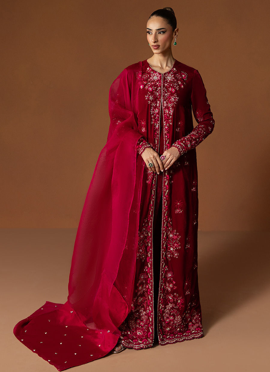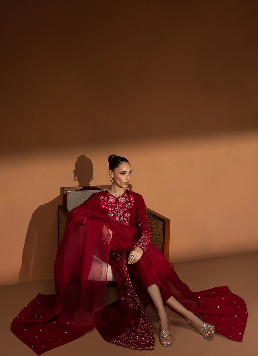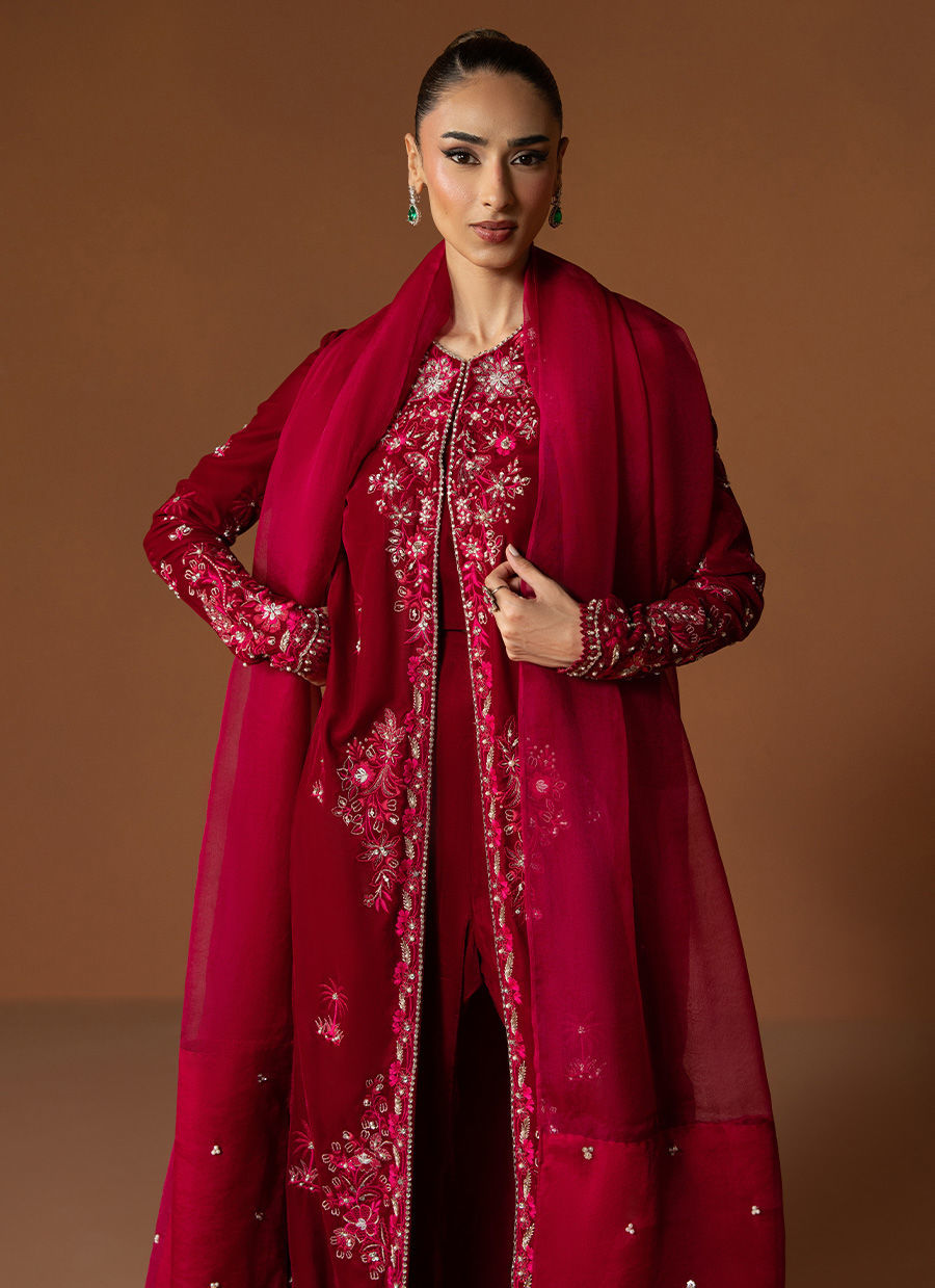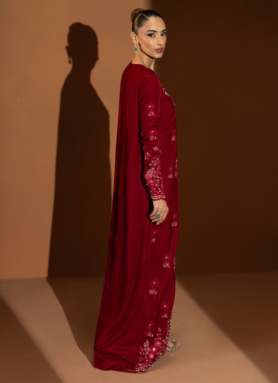 Rendered in a rich wine hue, Opal is a full-length, front-open velvet gown adorned with intricate embellishments along the front and cuffs, glistening with delicate detailing. Paired with sleek cigarette pants, this look is effortlessly sophisticated—a perfect choice to embrace the warmth and grace of winter festivities.
