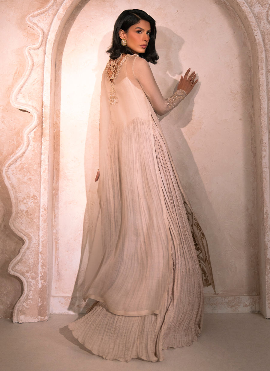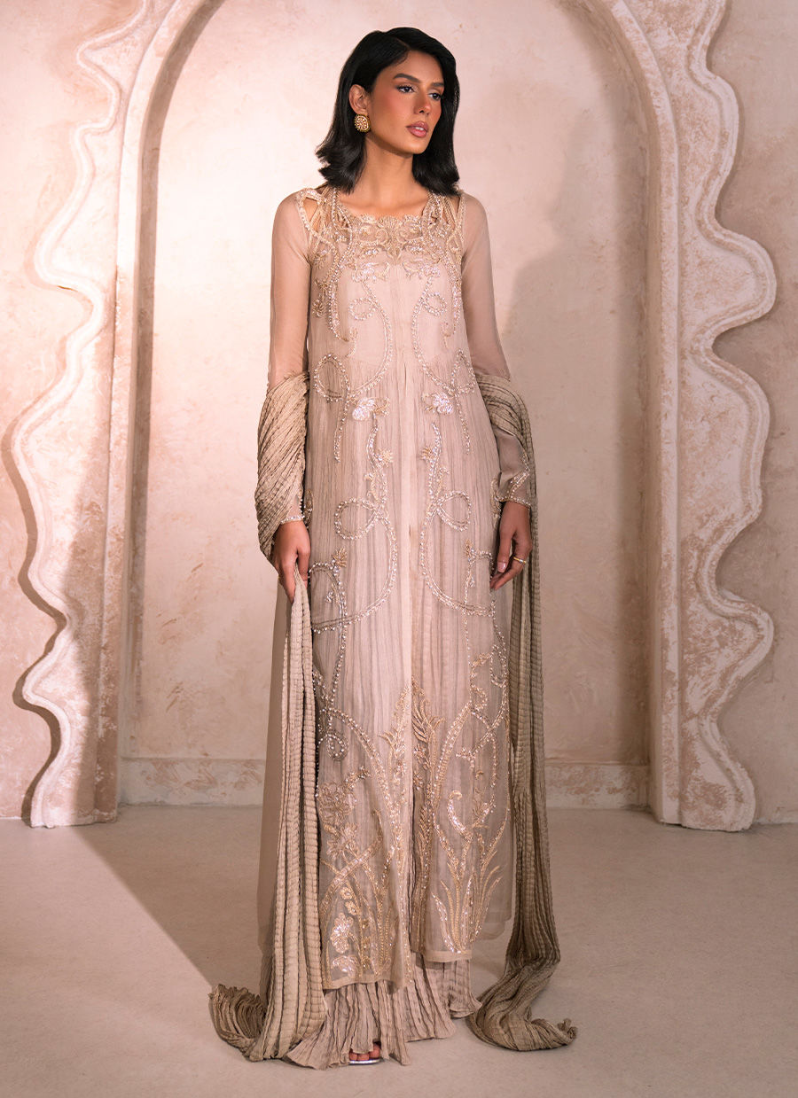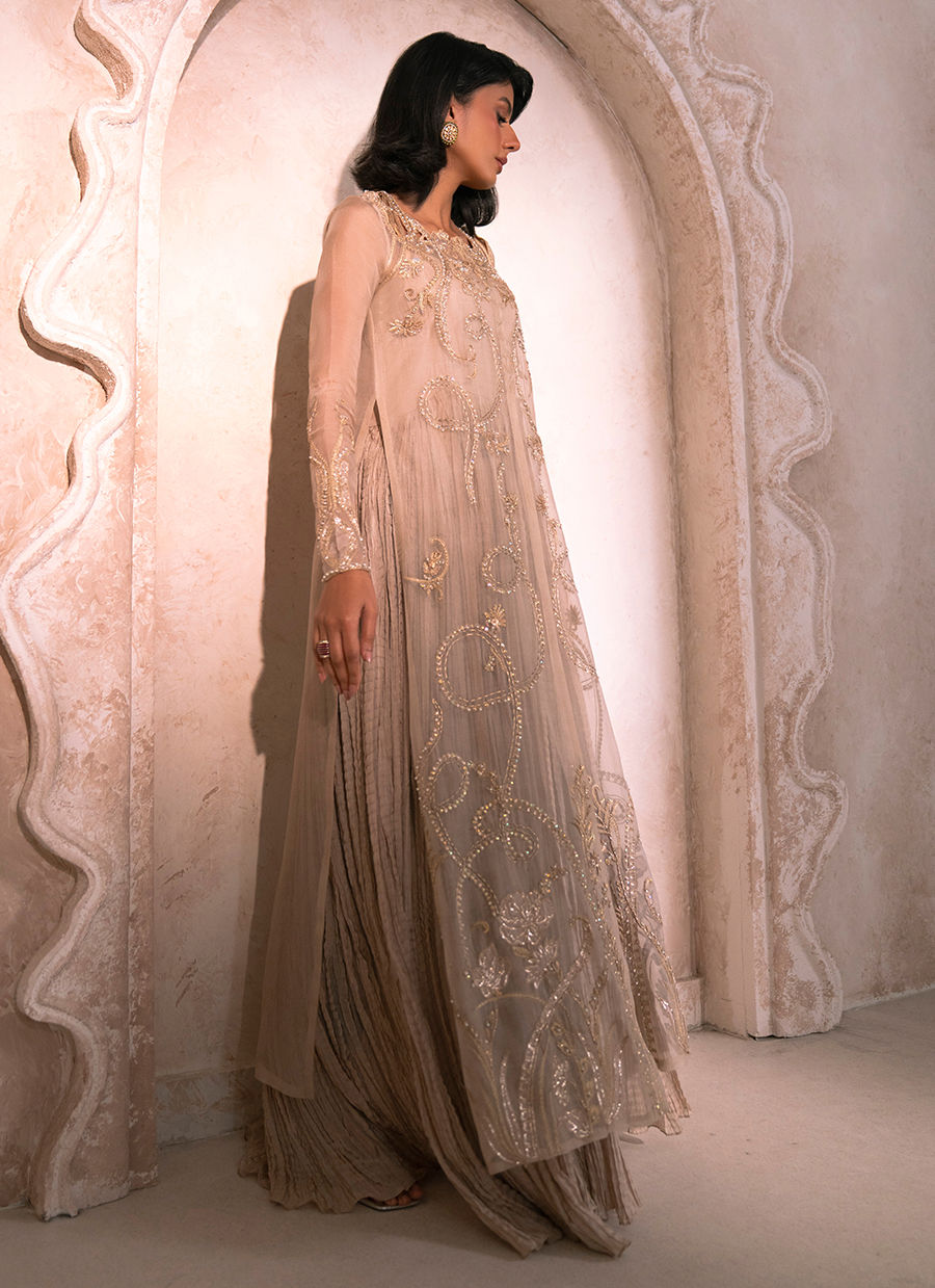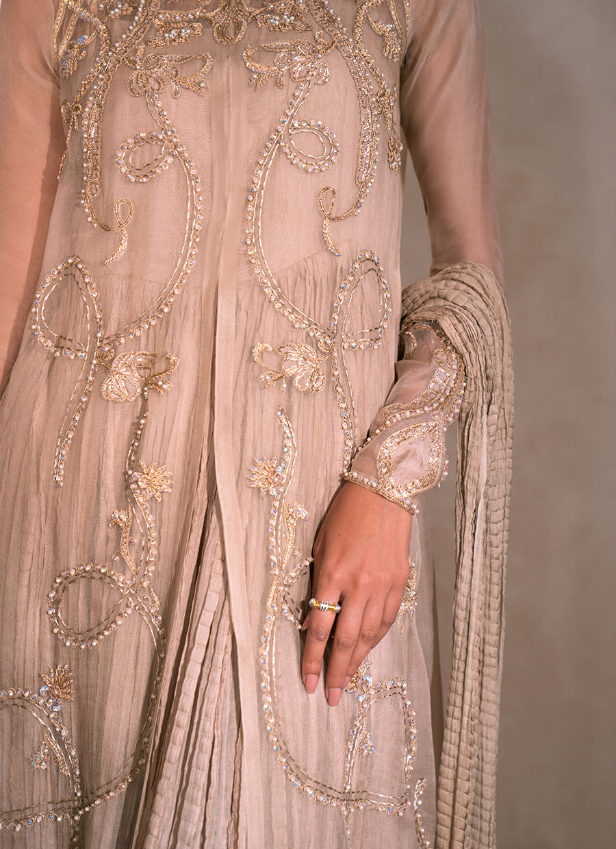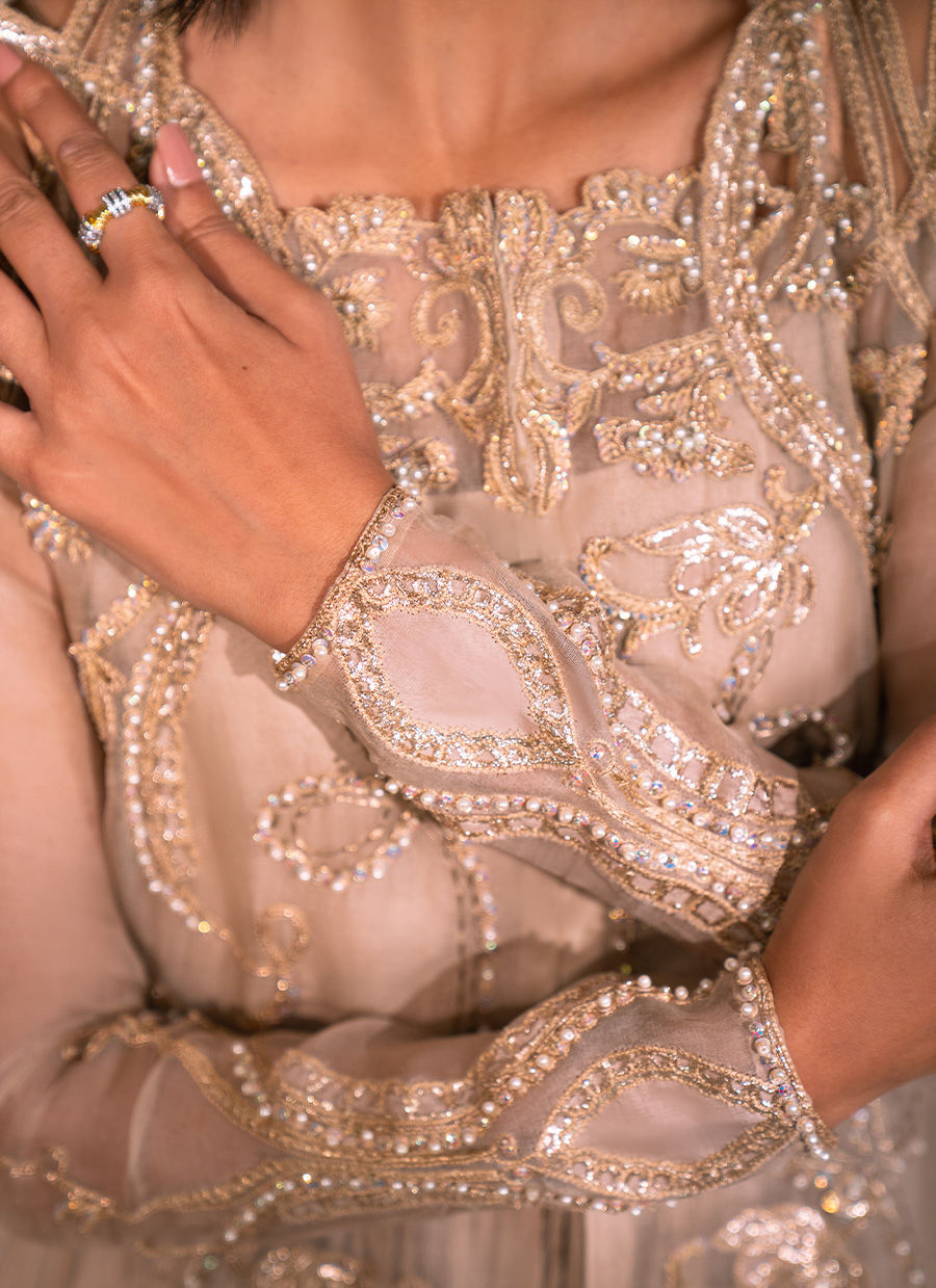 A refined tan pure organza gown, meticulously adorned with intricate cutwork detailing along the front and back neckline. The shoulders are delicately embellished with hand-crafted floral motifs, featuring sequins, pearls, resham, and nakshi dabka, gracefully cascading across the gown panels. The sleeves mirror this artisanal craftsmanship, enhancing the ensemble’s opulent appeal. A long crushed silk inner slip lends effortless movement, volume, and a fluid, regal silhouette. The look may be completed with an optional crushed silk dupatta and tailored trousers, adding a timeless layer of sophistication and understated grandeur.