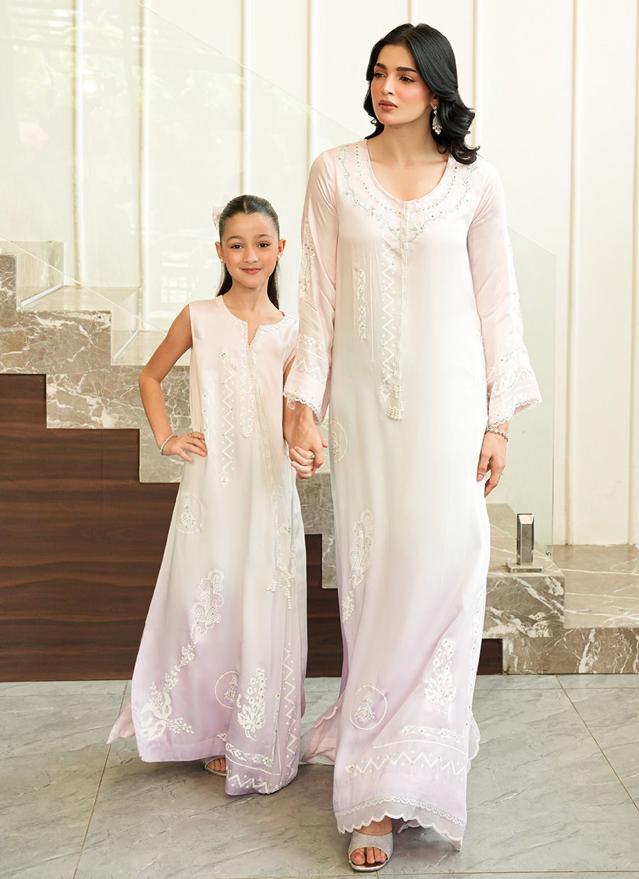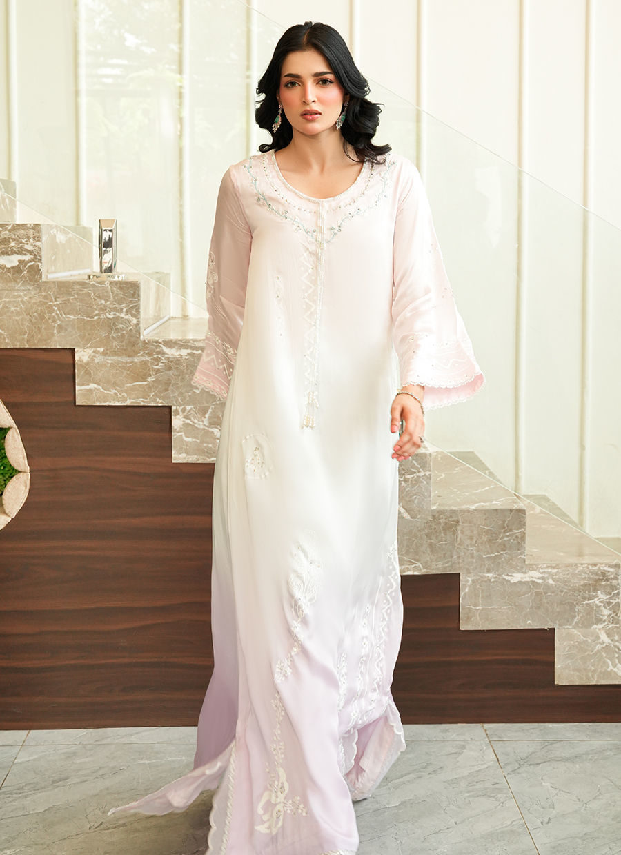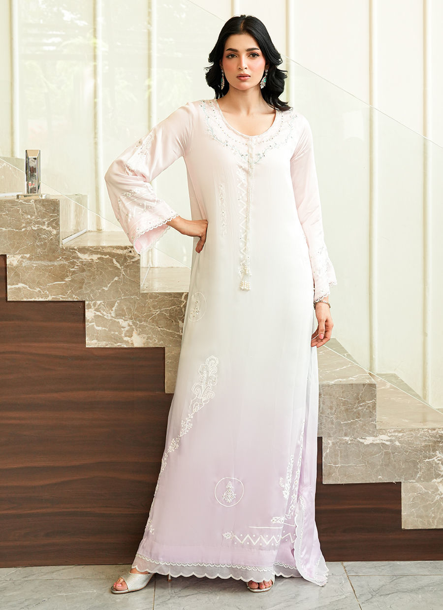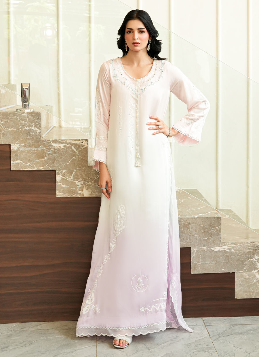 An elegant ombré-shaded silk kaftan, adorned with intricate block print detailing and a finely embroidered neckline. Elevated with delicate pearl hangings, the silhouette flows with effortless ease capturing a refined balance of artisanal craftsmanship and contemporary sophistication.