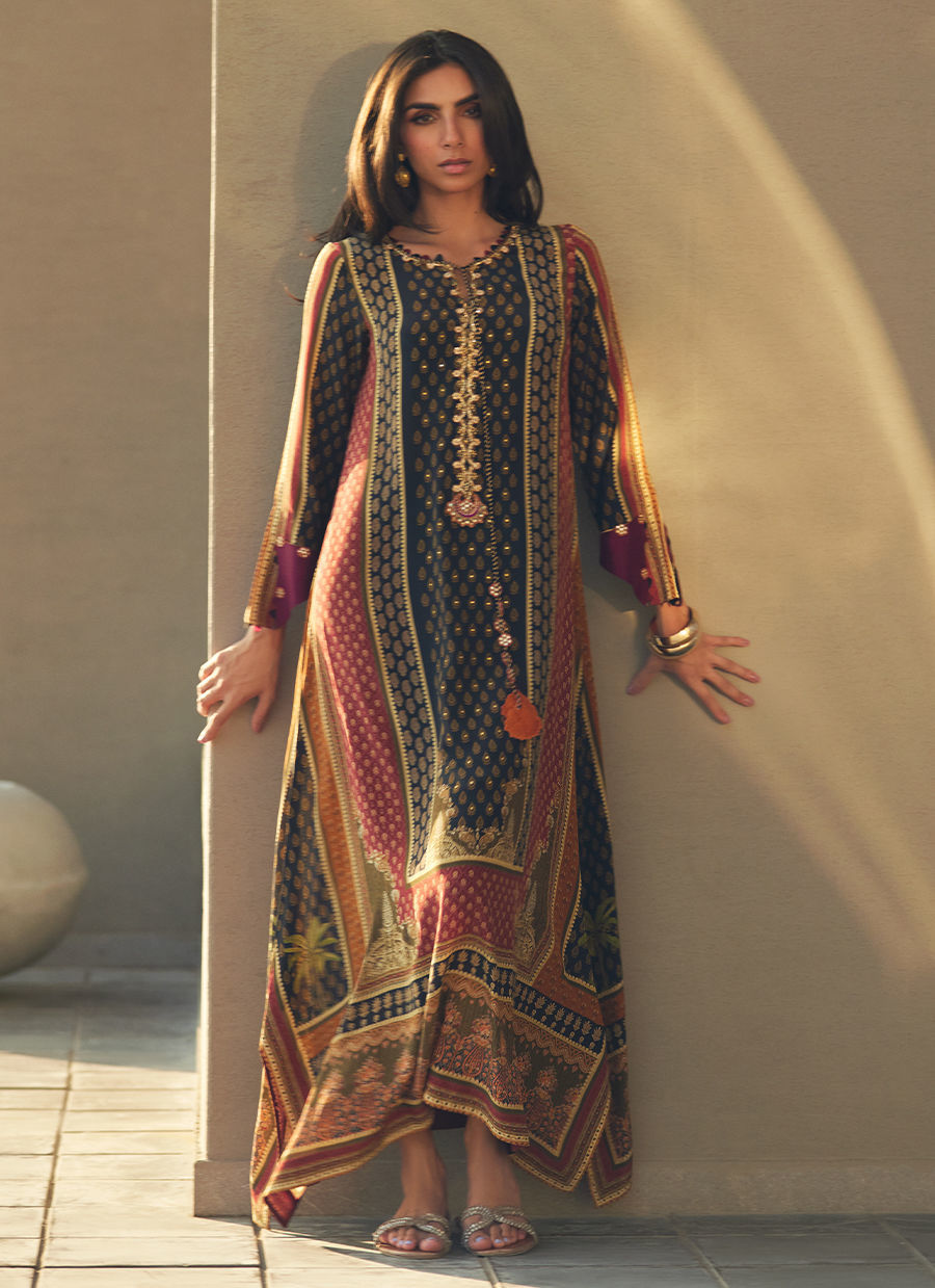 A masterclass in understated elegance, this printed crepe kaftan is elevated with a raw silk embroidered border around the neckline and sleeves. The design is further adorned with hand-made crystal flowers and a delicate 3D motif that hangs gracefully from the neckline, adding a subtle shimmer. Impeccably tailored and gracefully flowing, this kaftan is perfect for occasions that call for sophisticated detailing and effortless style.