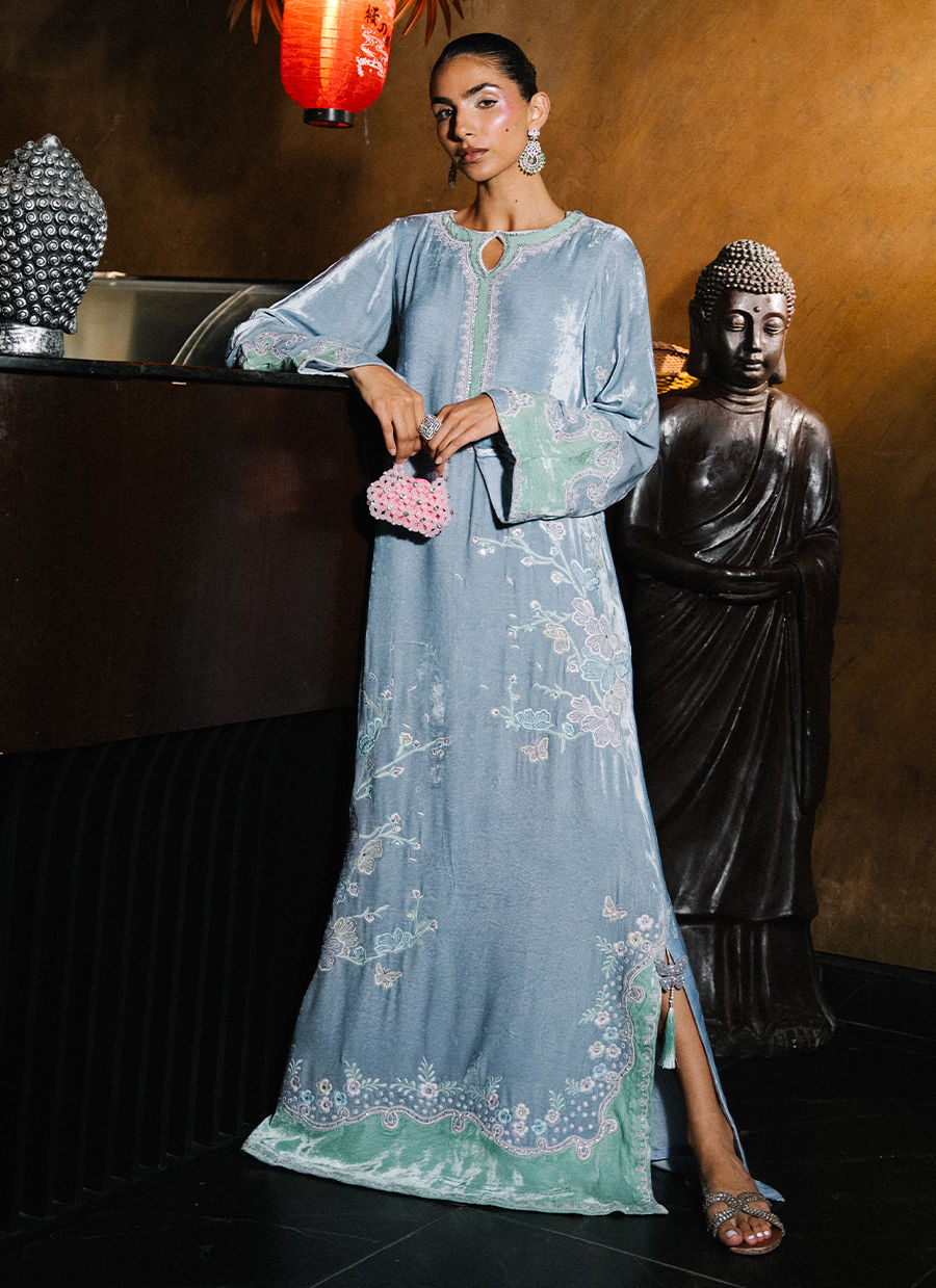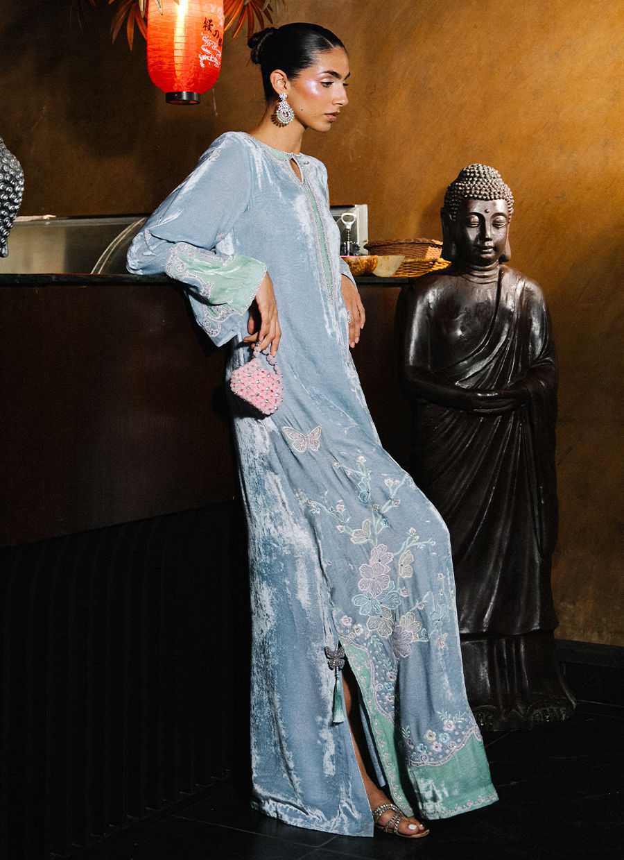 A flowing kaftan silhouette brought to life with delicate pastel Sakura motif embroidery, enhanced with hand-touched crystal stone detailing for a soft, ethereal sparkle. The design features elegant sage green color-blocking that adds a modern contrast, while embellished butterfly tassels adorning the slits lend a whimsical, graceful charm. An effortlessly chic statement piece perfect for refined festive or resort wear.