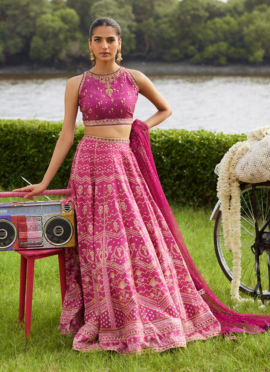 Unapologetically glamorous — this berry pink ensemble brings together contemporary edge and timeless elegance. The raw silk lehenga features a striking digital print framed with shimmering zari borders, creating a captivating play of pattern and sheen. Paired with a sleek halter top, intricately hand-embellished with zardozi and resham detailing, the look radiates confident sophistication.