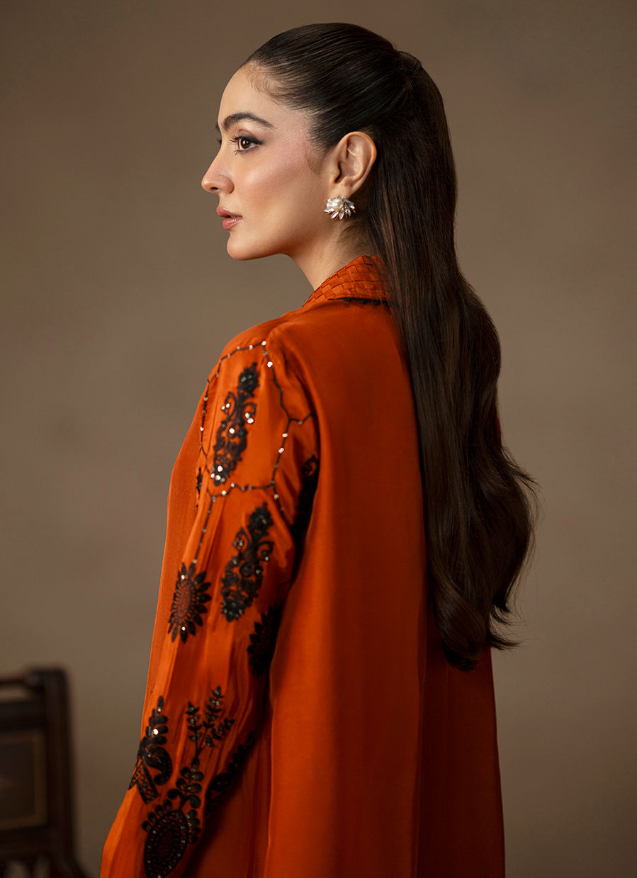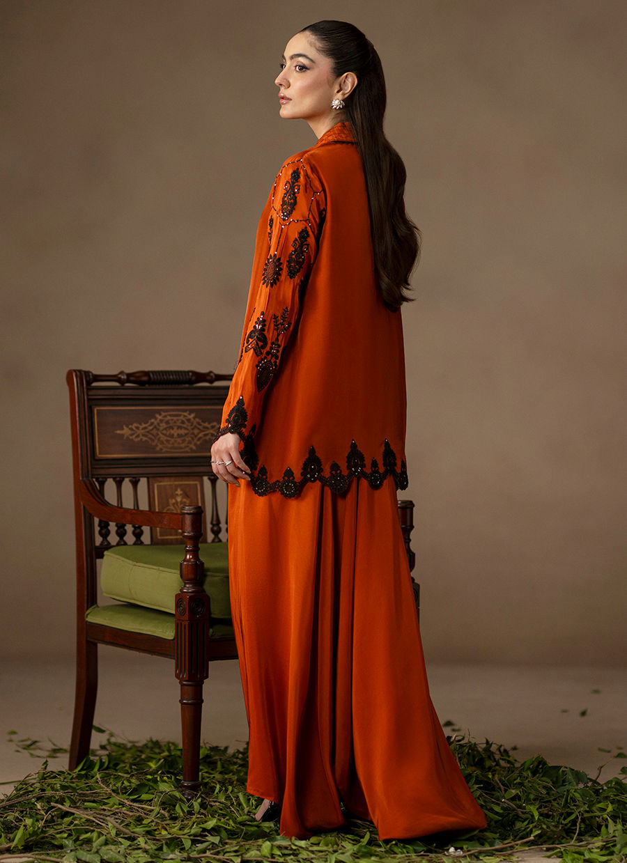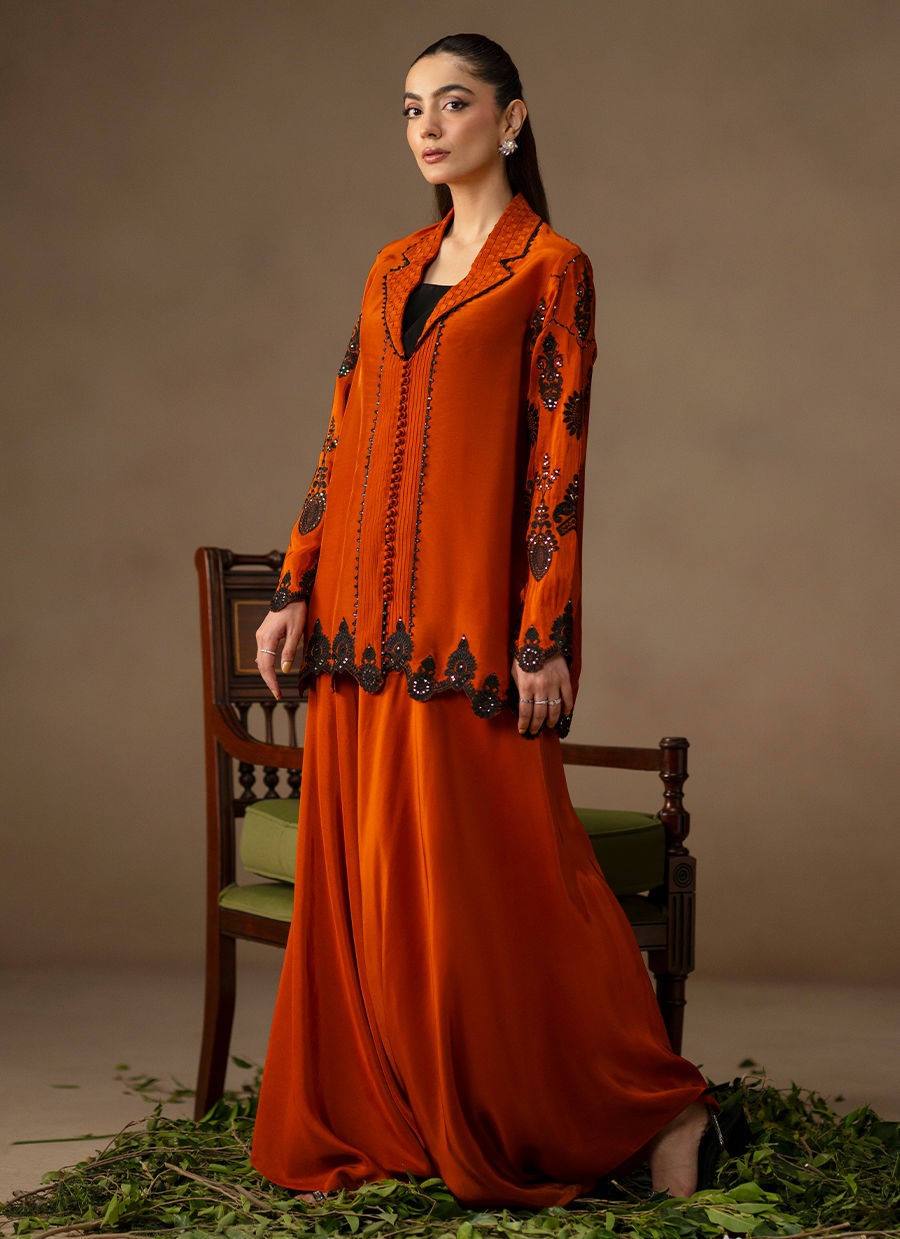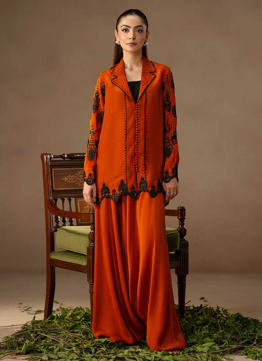 For those who treat coffee runs like fashion moments. When the plan is casual but the mood calls for impact, the Orange ensemble makes the statement. The shacked—half-shirt, half-jacket—is cut in juicy orange and features a woven, revere-style collar stitched into a grid of textured fabric, trimmed in black thread. Black lace appliqués and glittering sequins curl around the sleeves and hem, while pin tucks and loop buttons offer sharp finishing’s. The wide-legged trousers match in tone and ease. An ensemble for when you’re dressing up like you’ve got plans, even if you don’t.