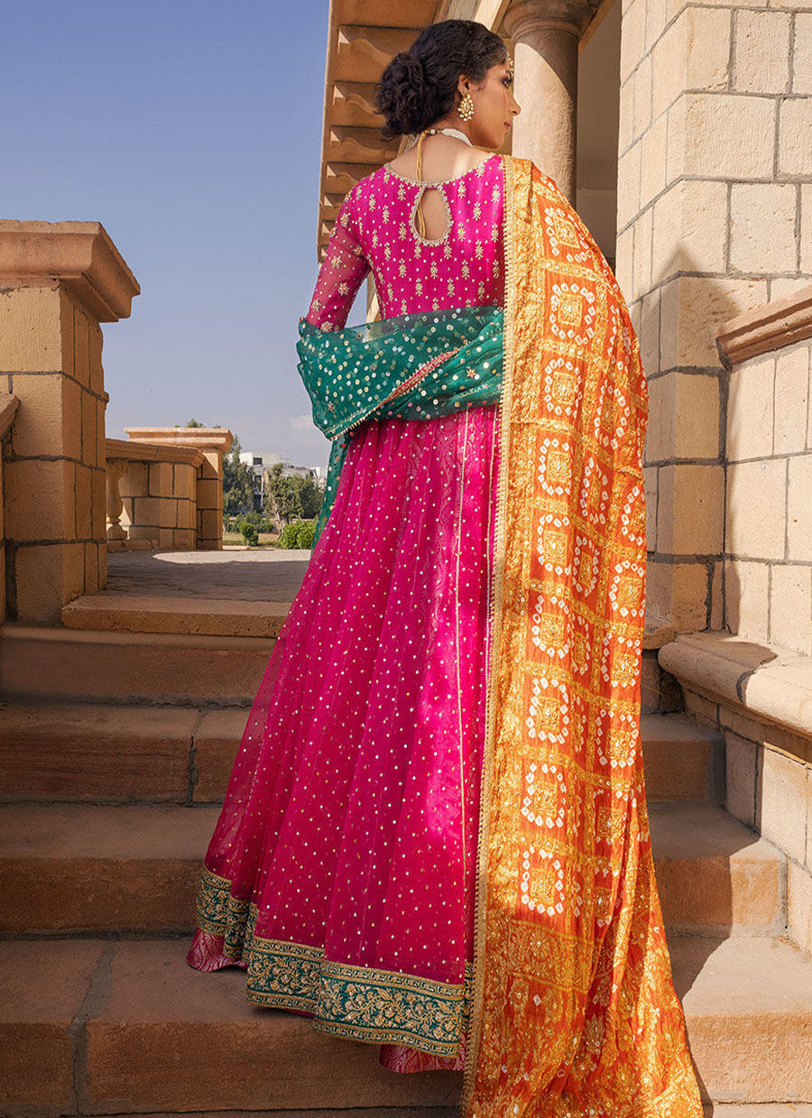 Radiate in this dreamy hot pink Peshwas. This flowy Peshwas is beautifully allured with intricate embellishments on body, followed by sparkling sequence spray all over. Contrasting heavily embroidered border completes the look of the Peshwas. Self jamawar sharara and contrasting green dupatta,with sequence spray all over makes it a simply divine silhouette for festive occasions.