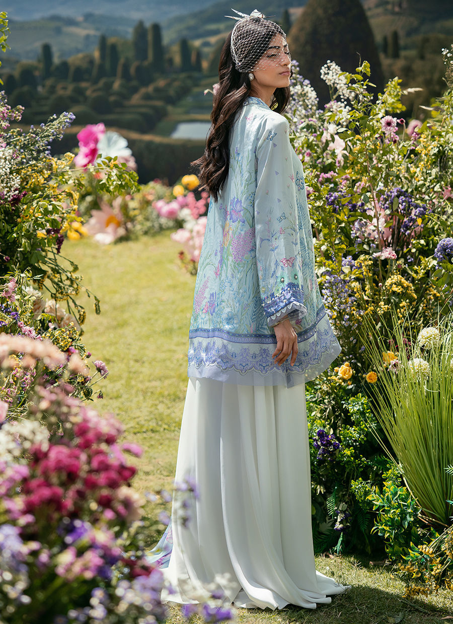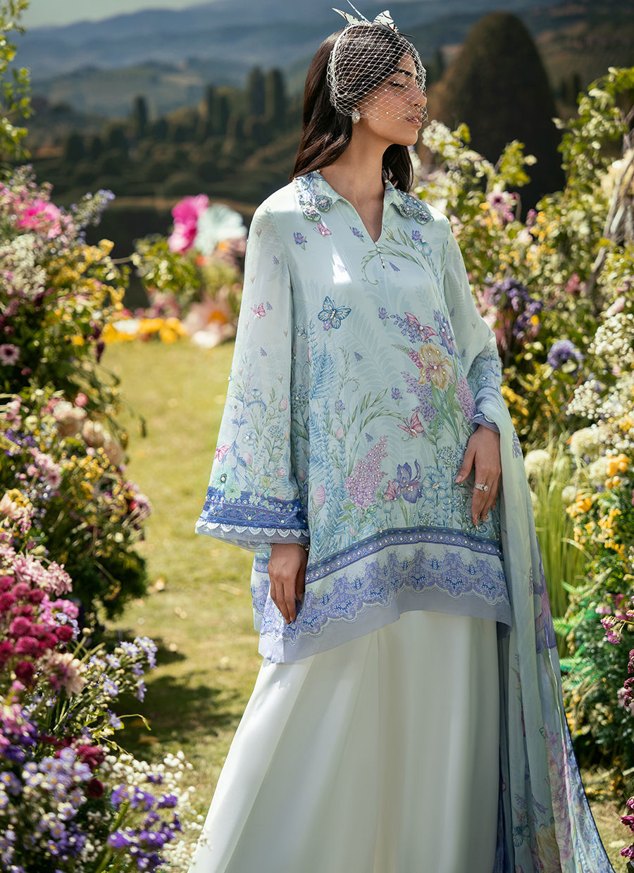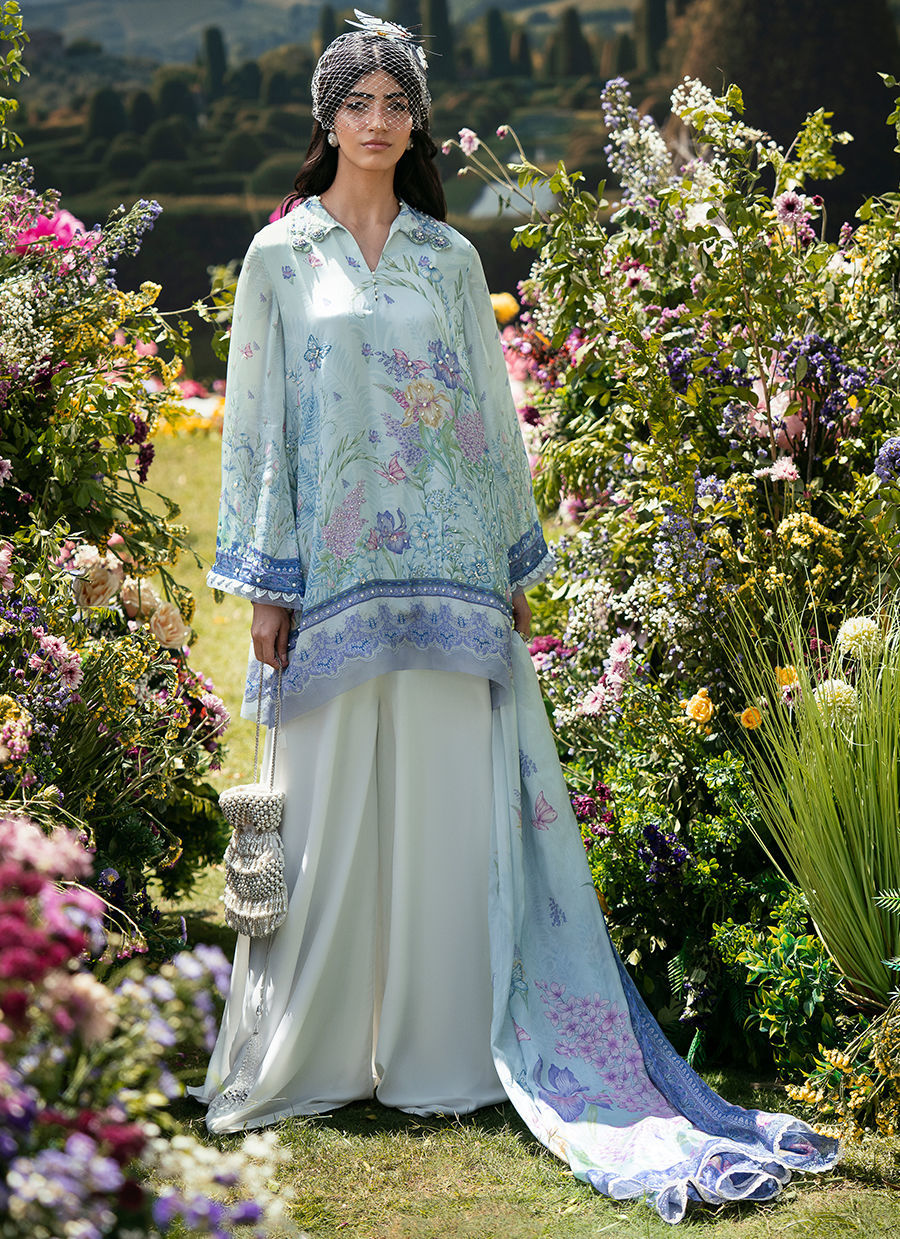 In a vibrant blue print, this short shirt features a classic collared neckline that adds a structured, timeless touch to the silhouette. Paired with Bambi pants, the look balances comfort with modern elegance, while the coordinated dupatta completes the ensemble with a soft, flowing finish. The overall outfit feels fresh, easy, and effortlessly put together.