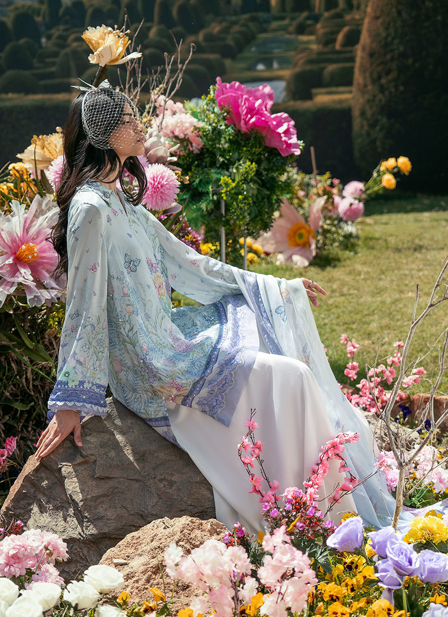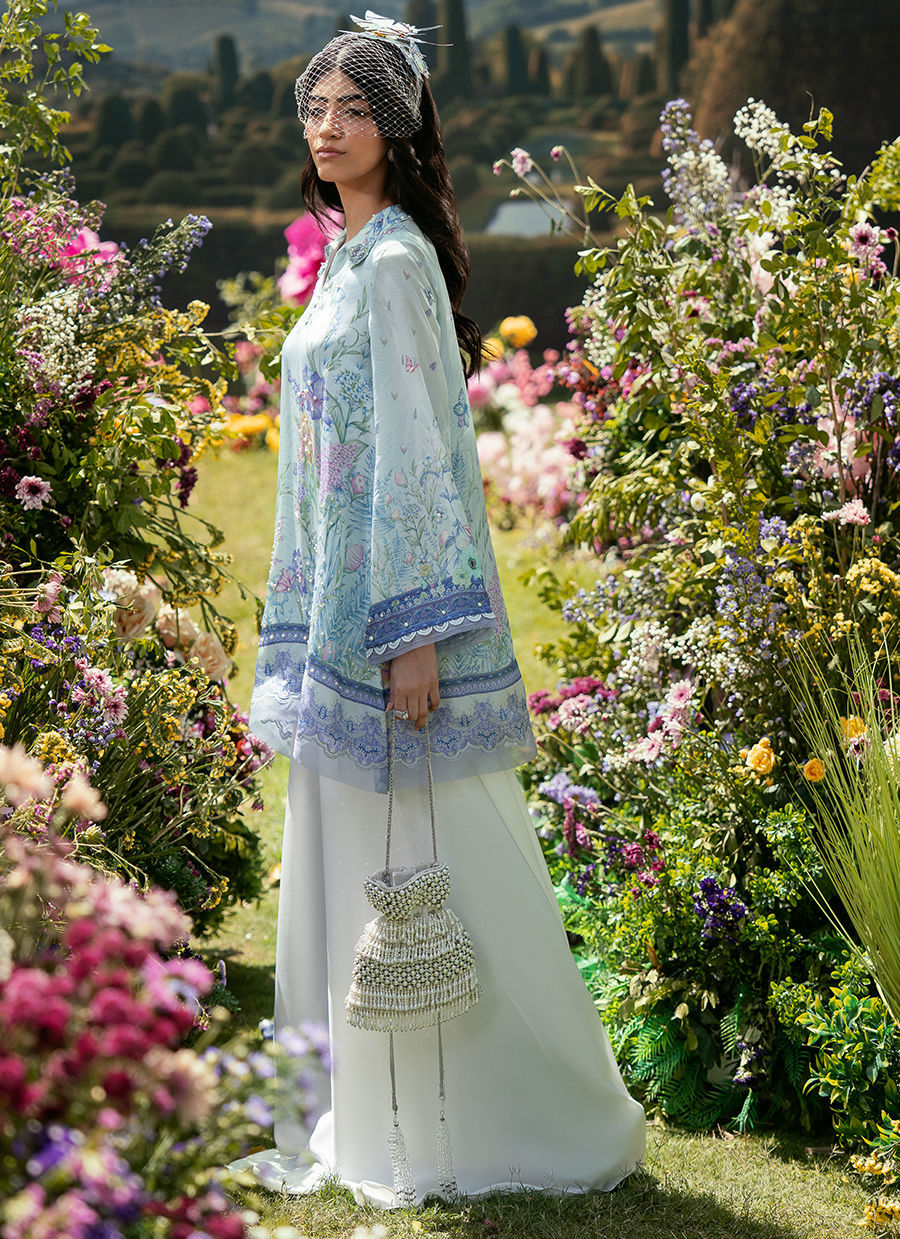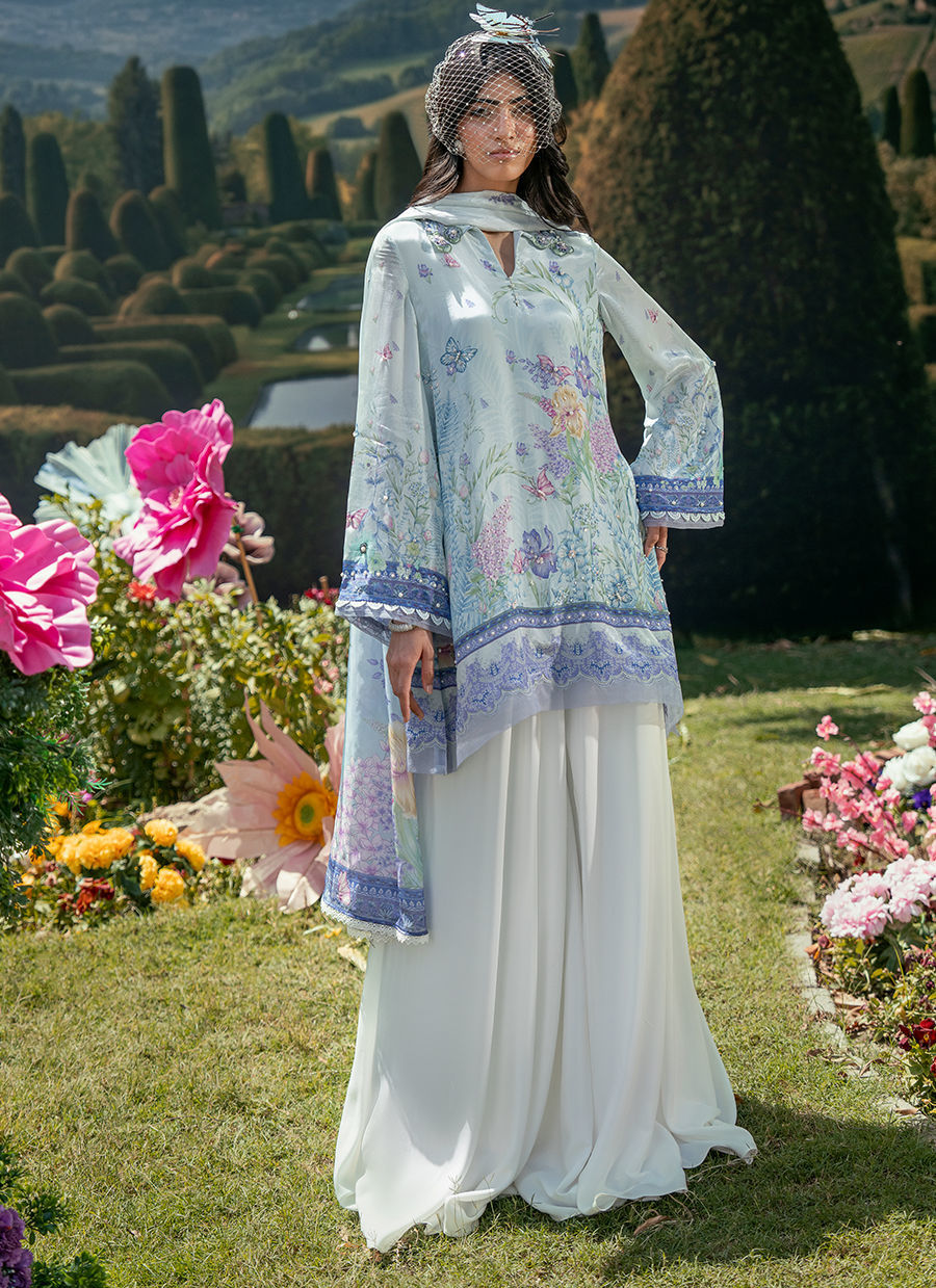 In a vibrant blue print, this short shirt features a classic collared neckline that adds a structured, timeless touch to the silhouette. Paired with Bambi pants, the look balances comfort with modern elegance, while the coordinated dupatta completes the ensemble with a soft, flowing finish. The overall outfit feels fresh, easy, and effortlessly put together.
