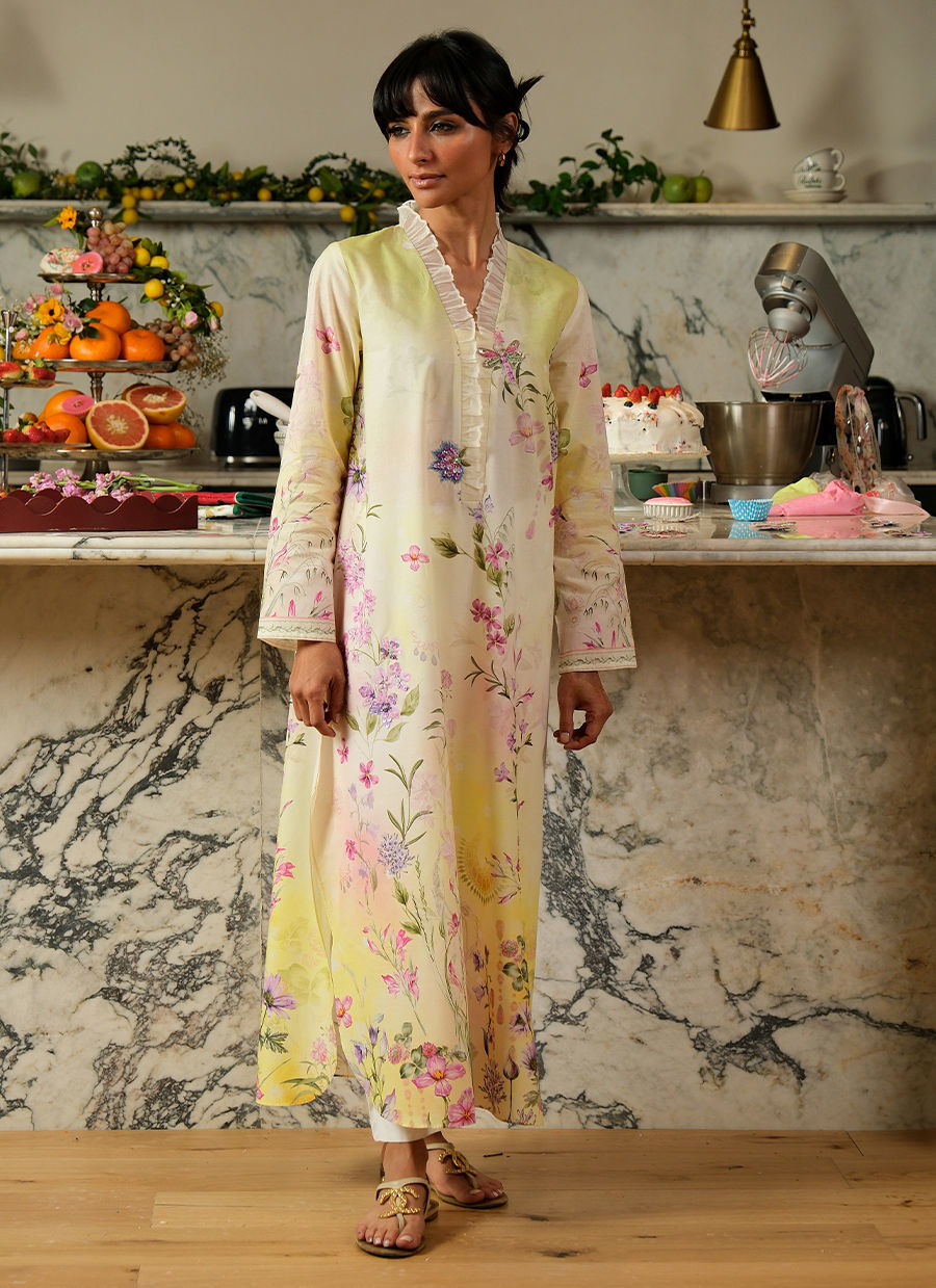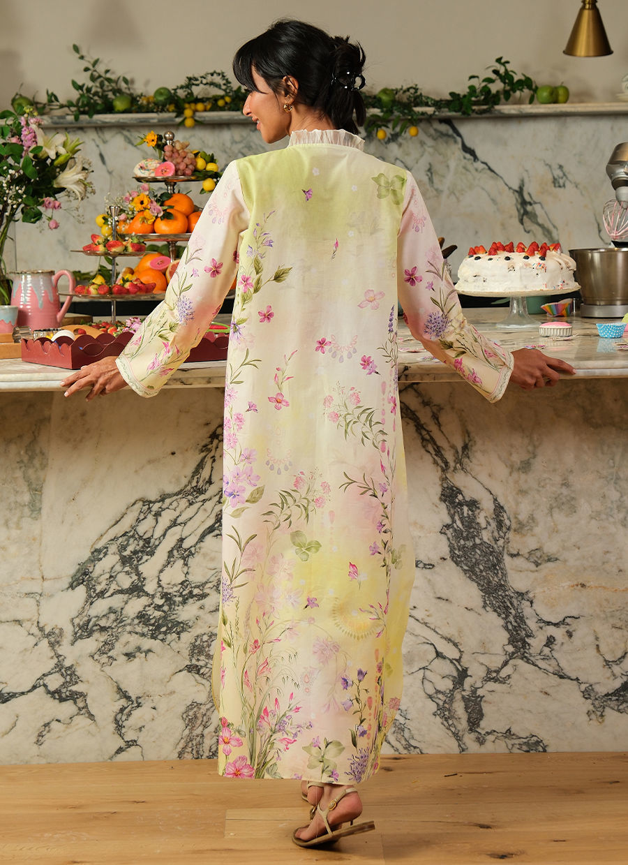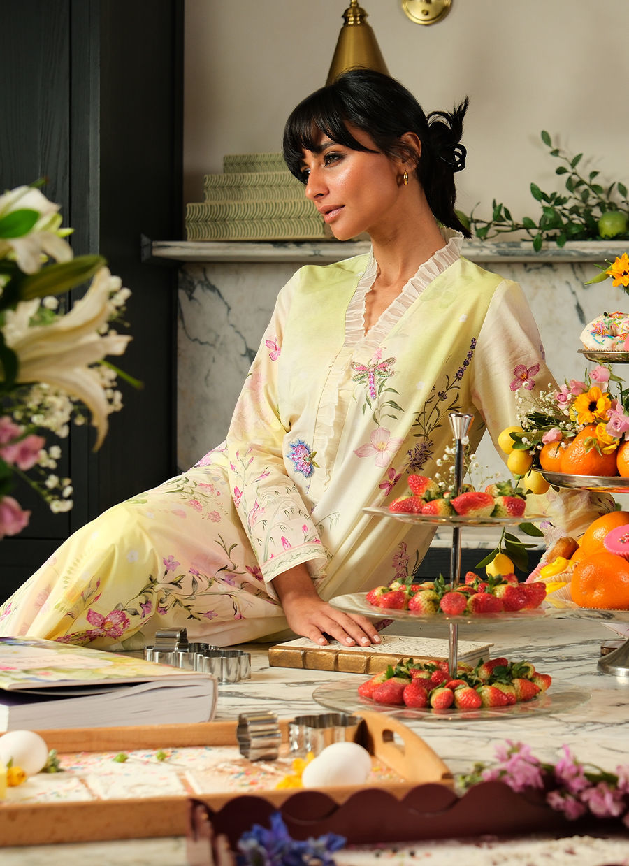 “This airy cotton ensemble features a hand-painted effect, soft ruffled organza neckline, and whimsical hand embroidered dragonfly and floral motifs. Light, graceful, and effortlessly feminine, pastel bloom is designed for easy Ramadan days and sunlit spring moments.”