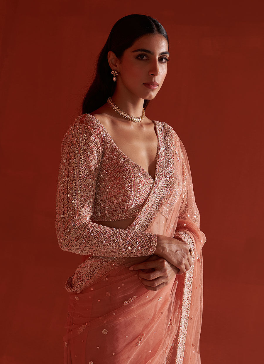 A pastel orange net saree embroidered with sequins, pearls and crystals.