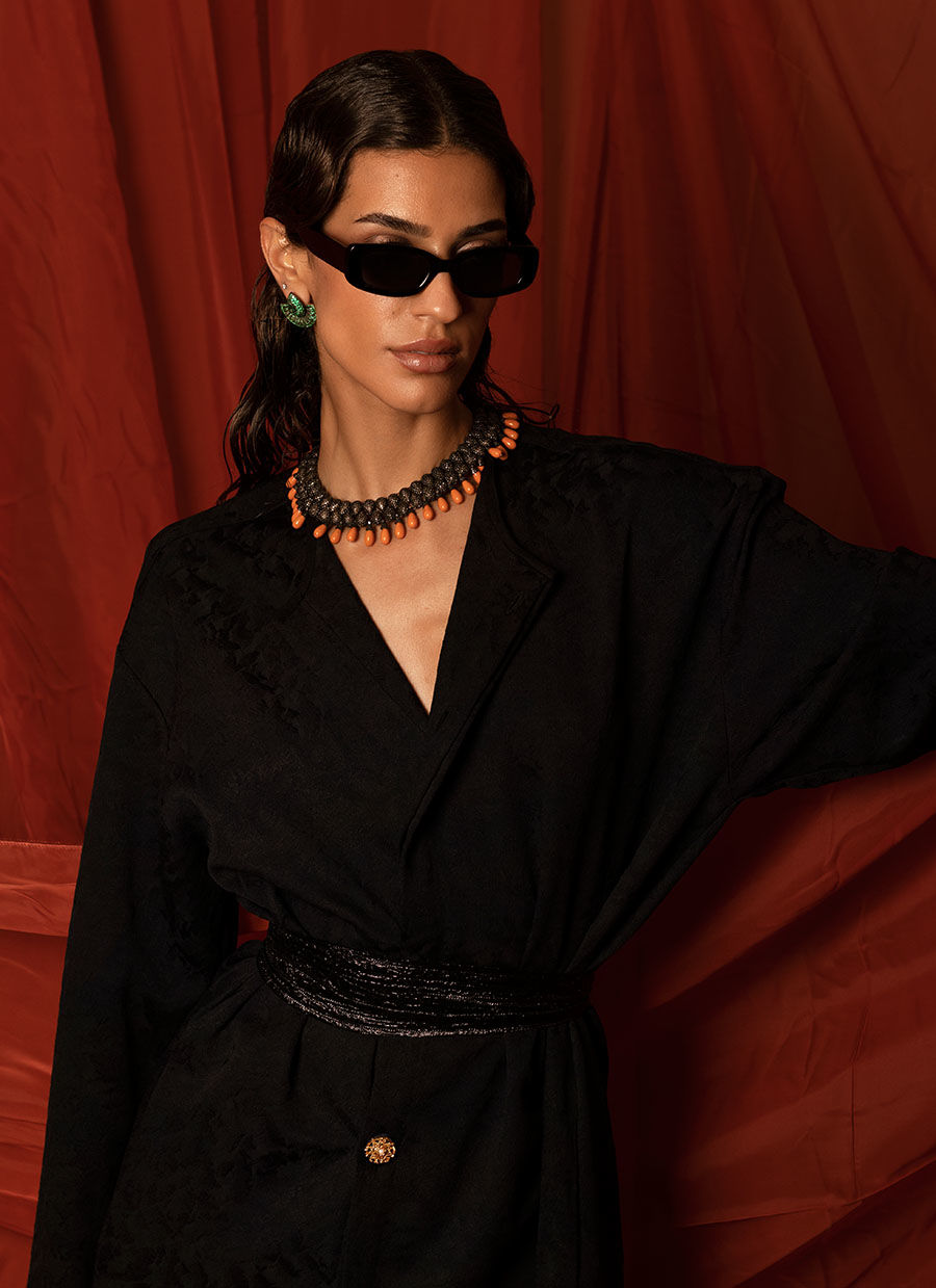 PATTERNED BROCADE Abaya. Long belt. Belt finished with hand made buttons. V-neckline