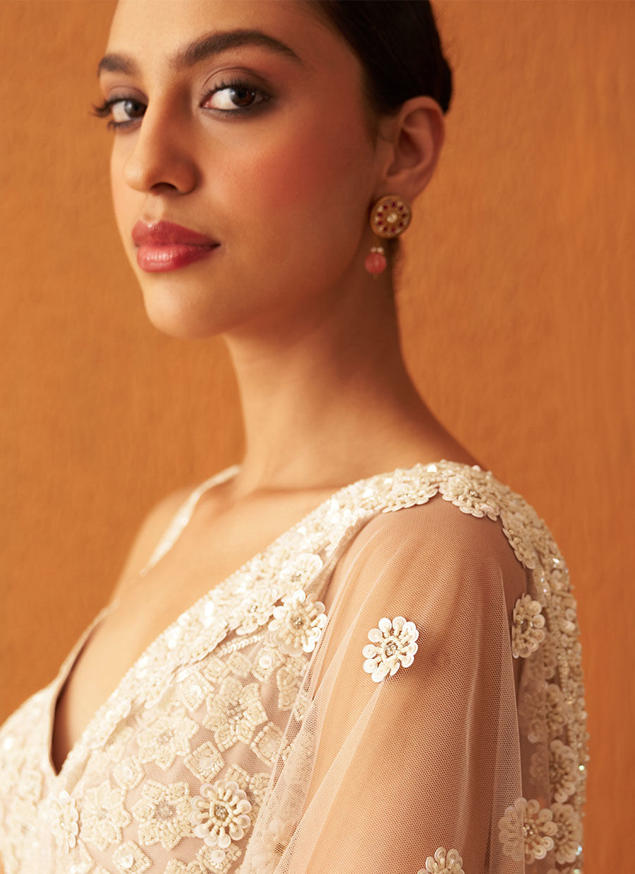 A peach net saree embroidered with ivory sequins, cutdana and crystals.
