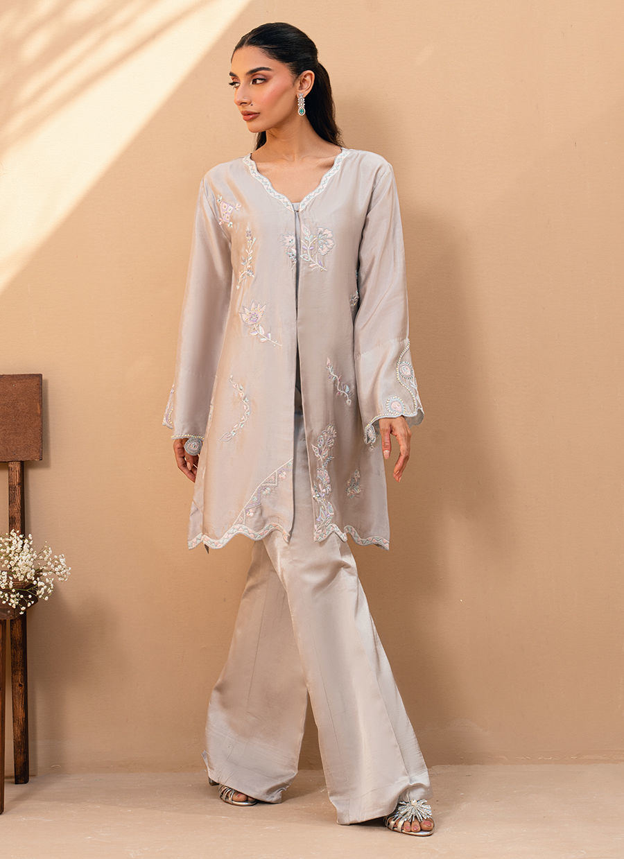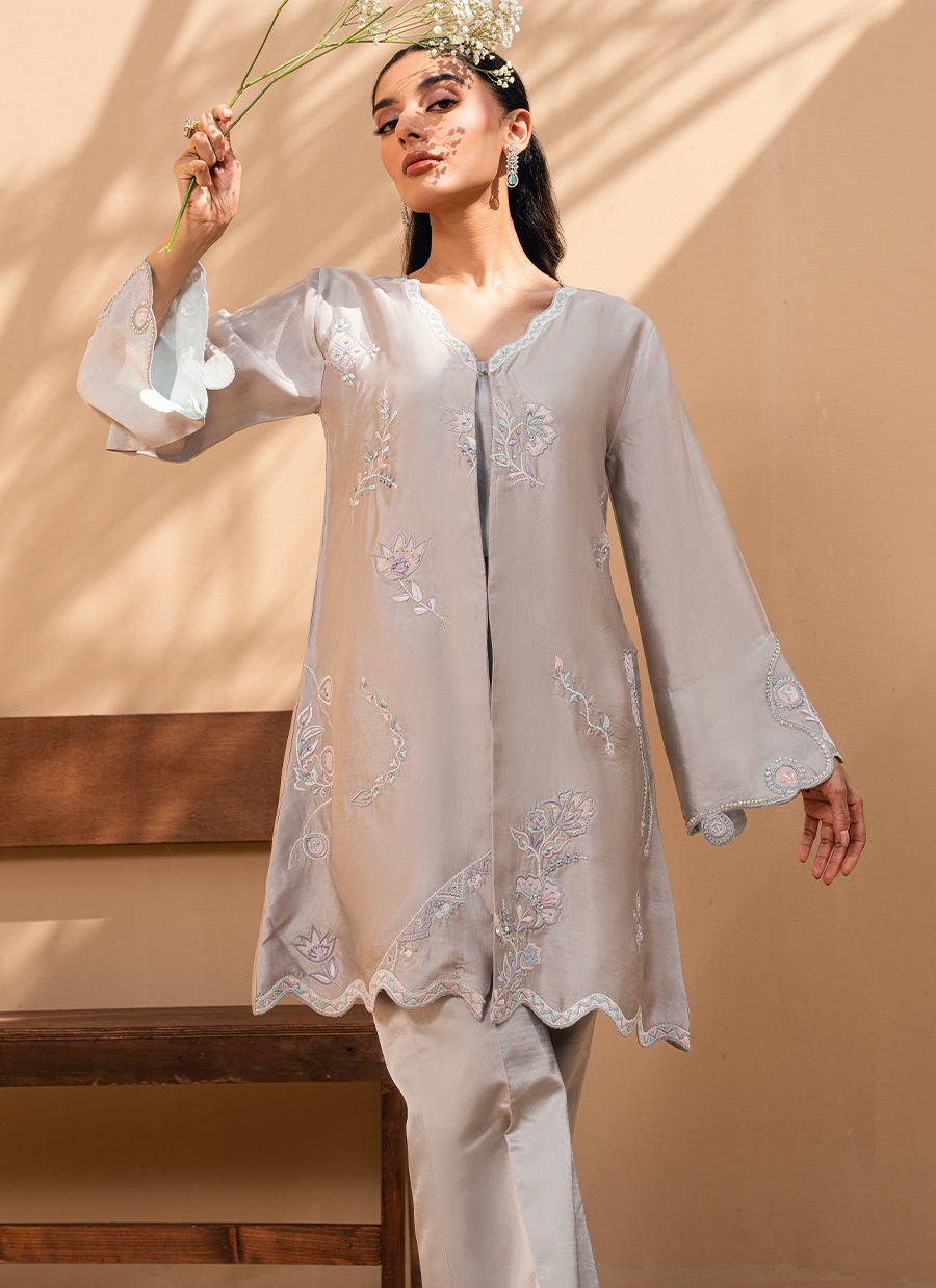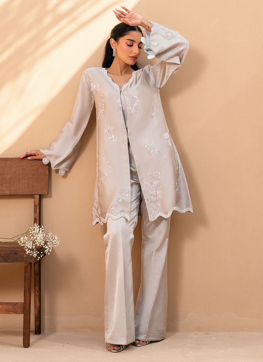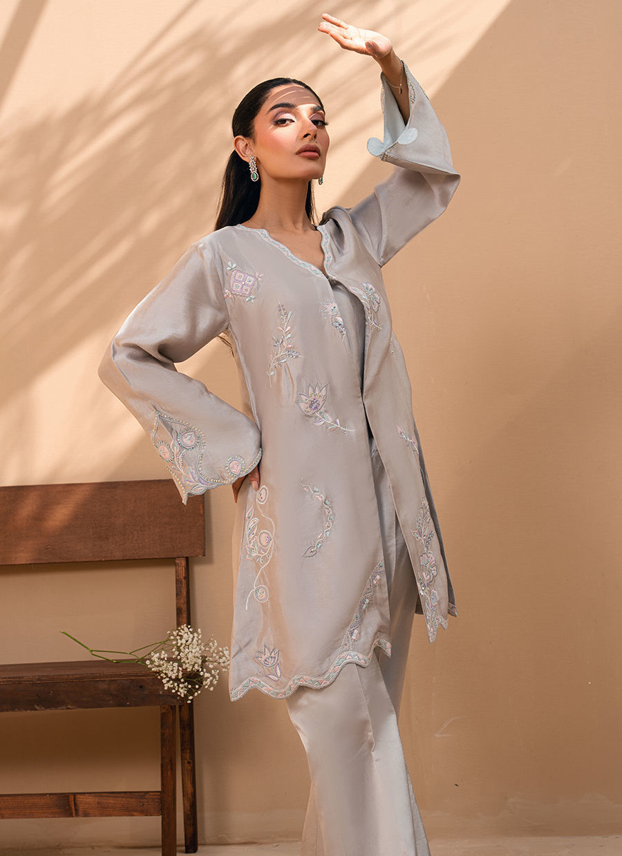 Soft, serene, and effortlessly feminine, this pearl-grey ensemble is a celebration of subtle craftsmanship. The straight-cut shirt is adorned with delicate pastel floral embroidery, complemented by scalloped edges along the hem and sleeves for a gentle, romantic touch. Paired with tailored bell trousers, the look is clean, modern, and timeless. Perfect for daytime festivities or intimate gatherings, this ensemble embodies quiet luxury with floral finesse.