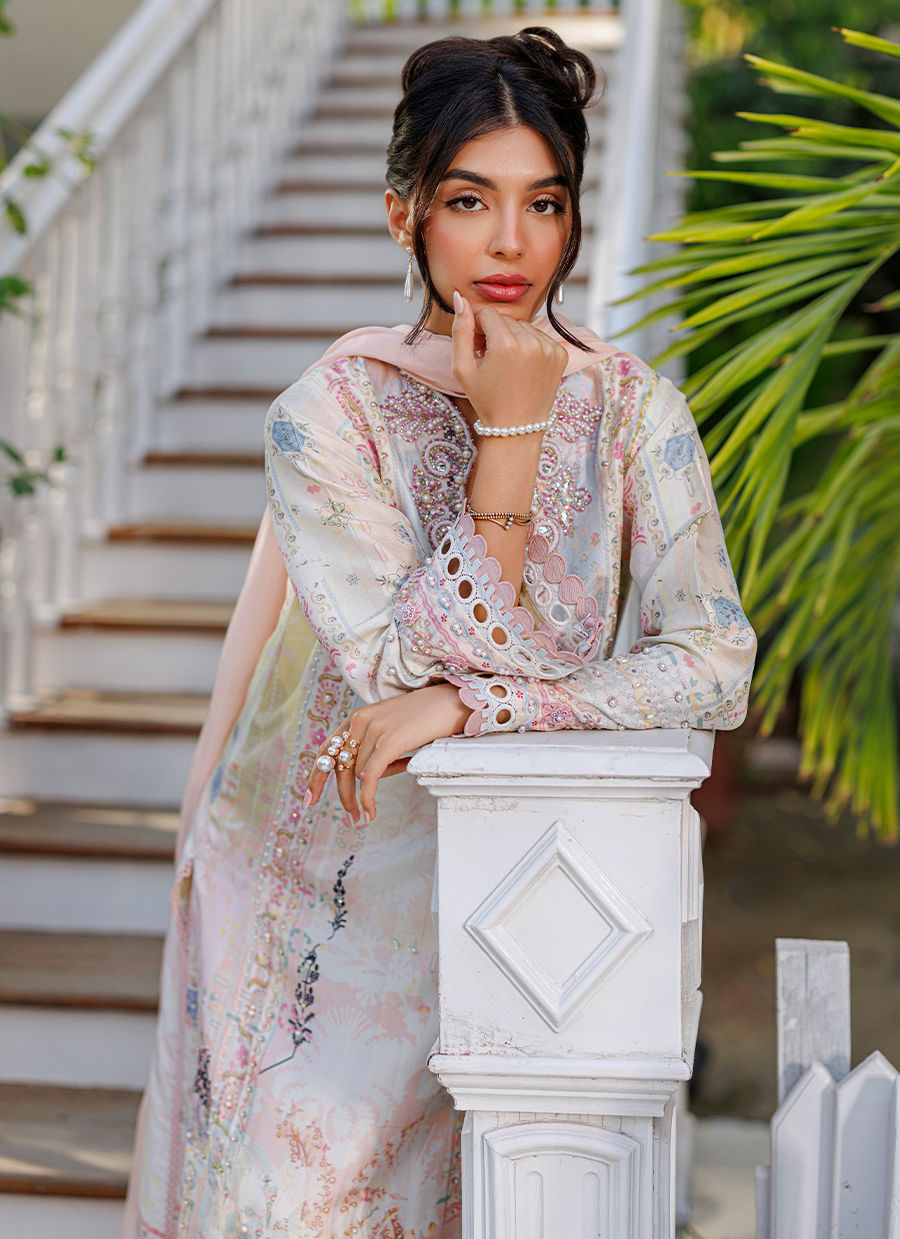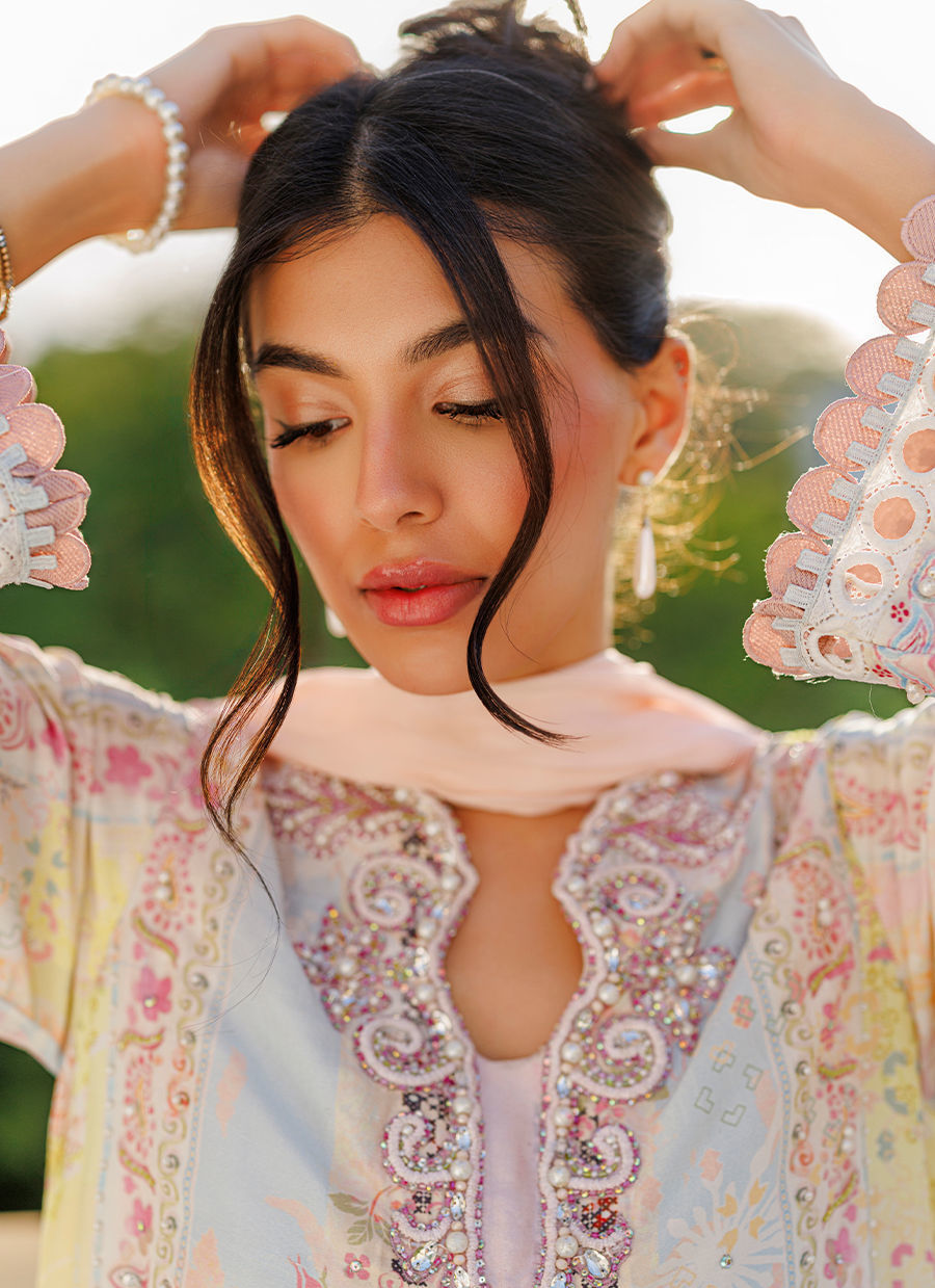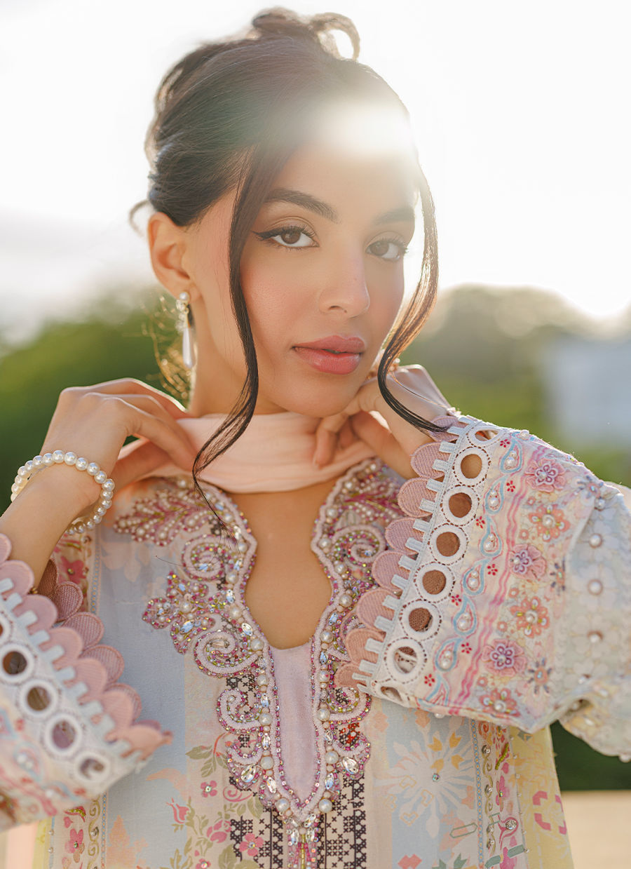 A timeless long raw silk shirt featuring an intricately embellished neckline with delicate hand detailing spread across the silhouette. The sleeves and shirt border are finished with refined lace work, adding texture and elegance. It is paired with an izar adorned with matching lace accents and complemented by a dupatta detailed with lace. *Model is 5'5" and is wearing a size extra small.