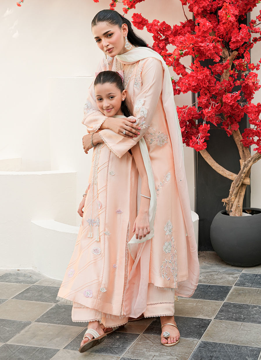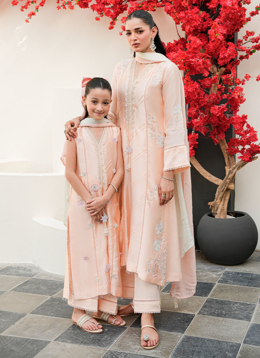 A refreshing pastel yellow mommy and me ensemble, adorned with delicate floral embroidery in soft blue and blush tones, enhanced with refined scalloped detailing. Paired with fluid wide-leg trousers, the silhouette flows with understated grace balancing effortless sophistication with a touch of playful charm.