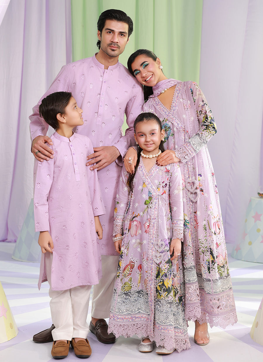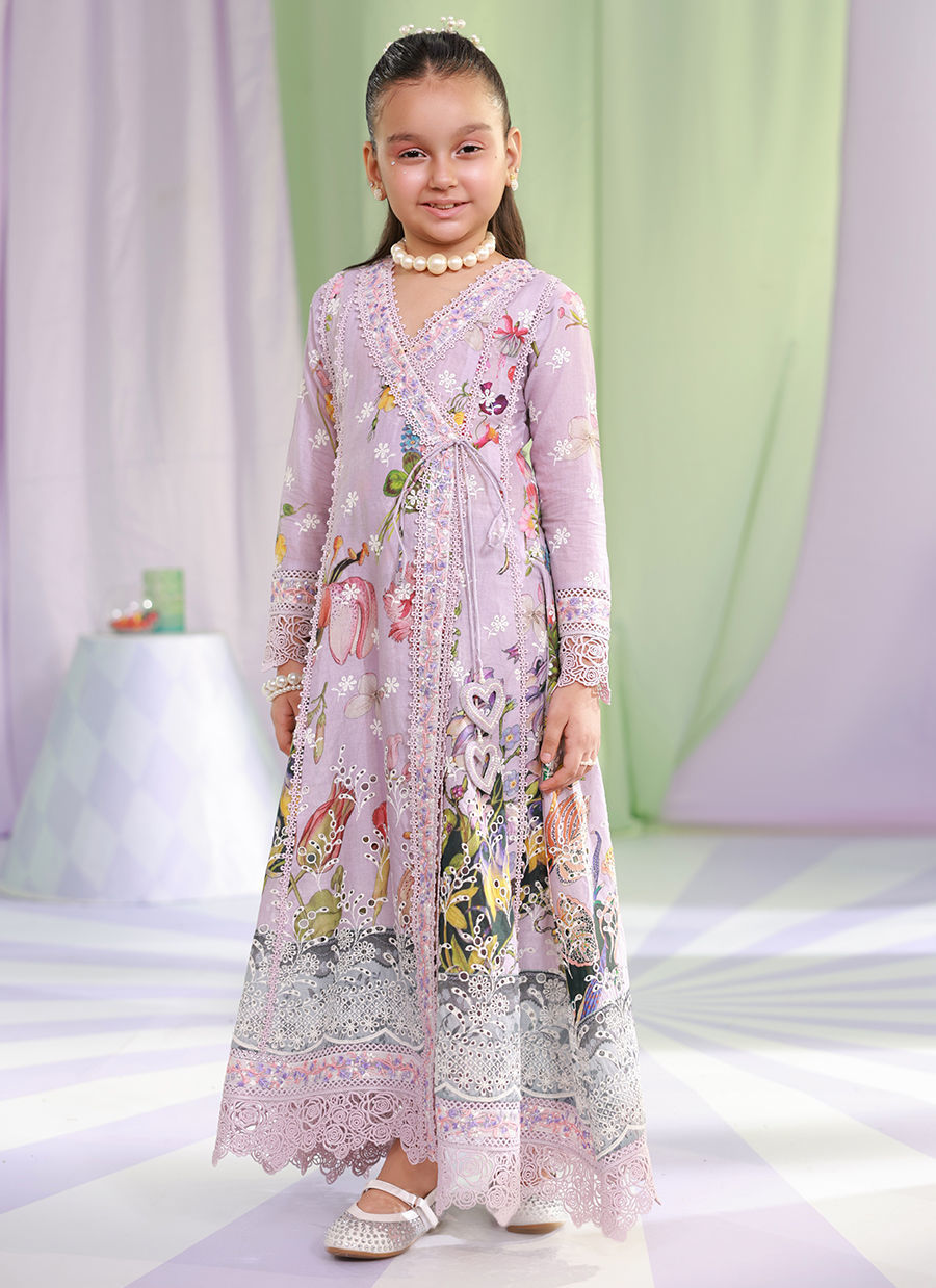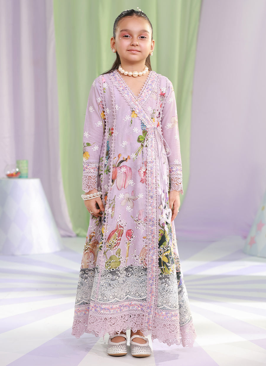 A Lilac printed schiffli angarkha, intricately adorned with embroidery and delicate cutwork lace throughout. Accented with charming heart-shaped embellished tassels, and paired with straight lilac cotton pants and a medium silk dupatta with lace edging, creating a refined and feminine ensemble.