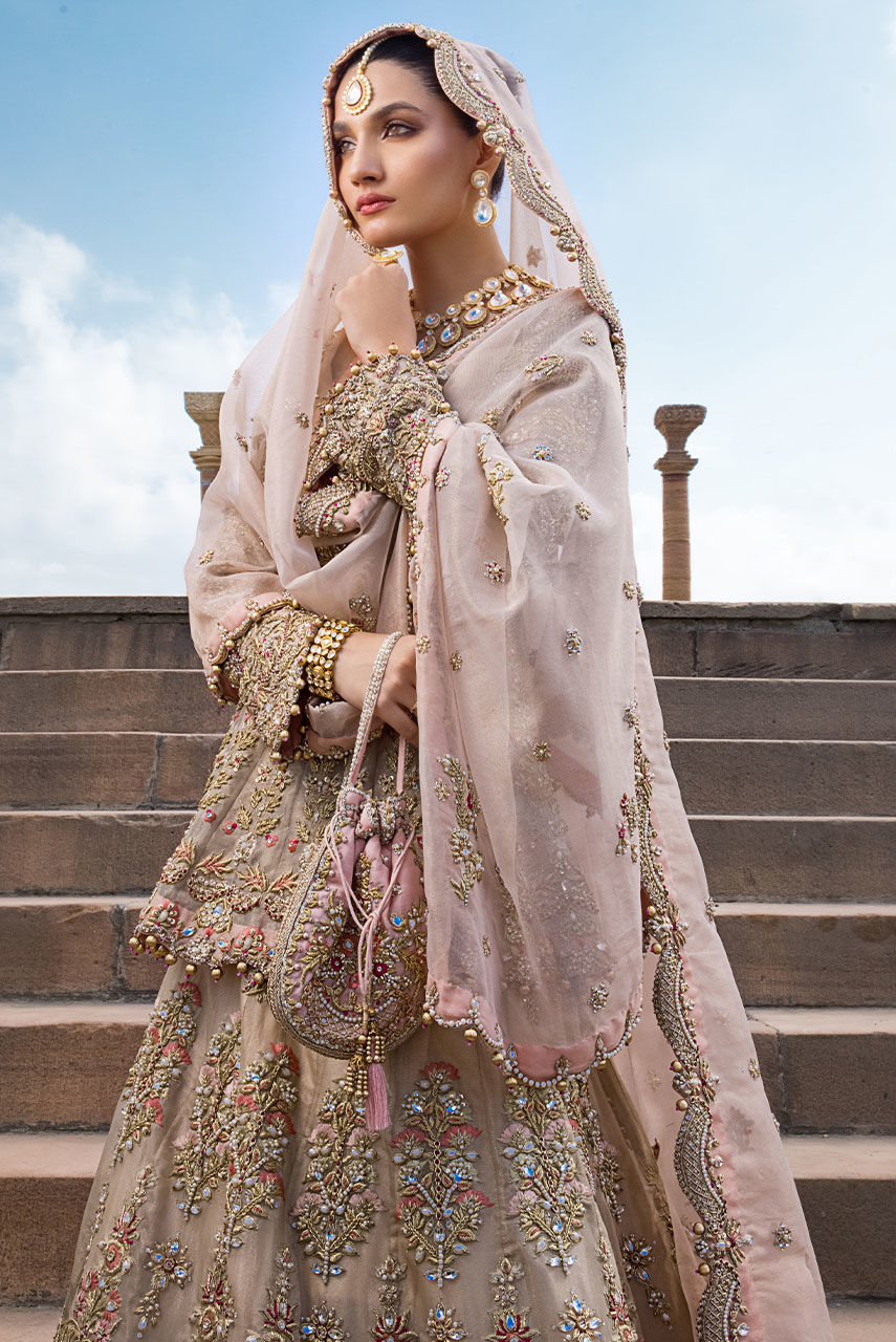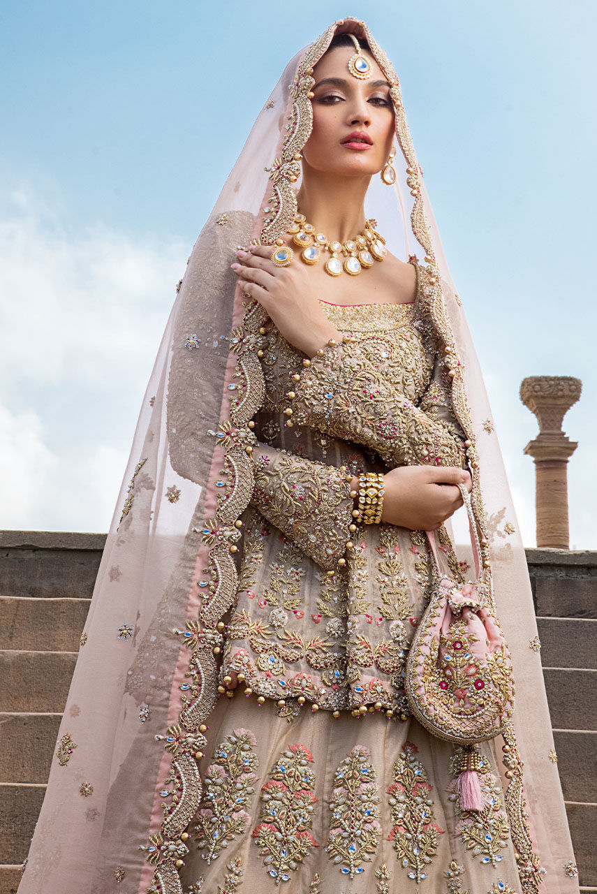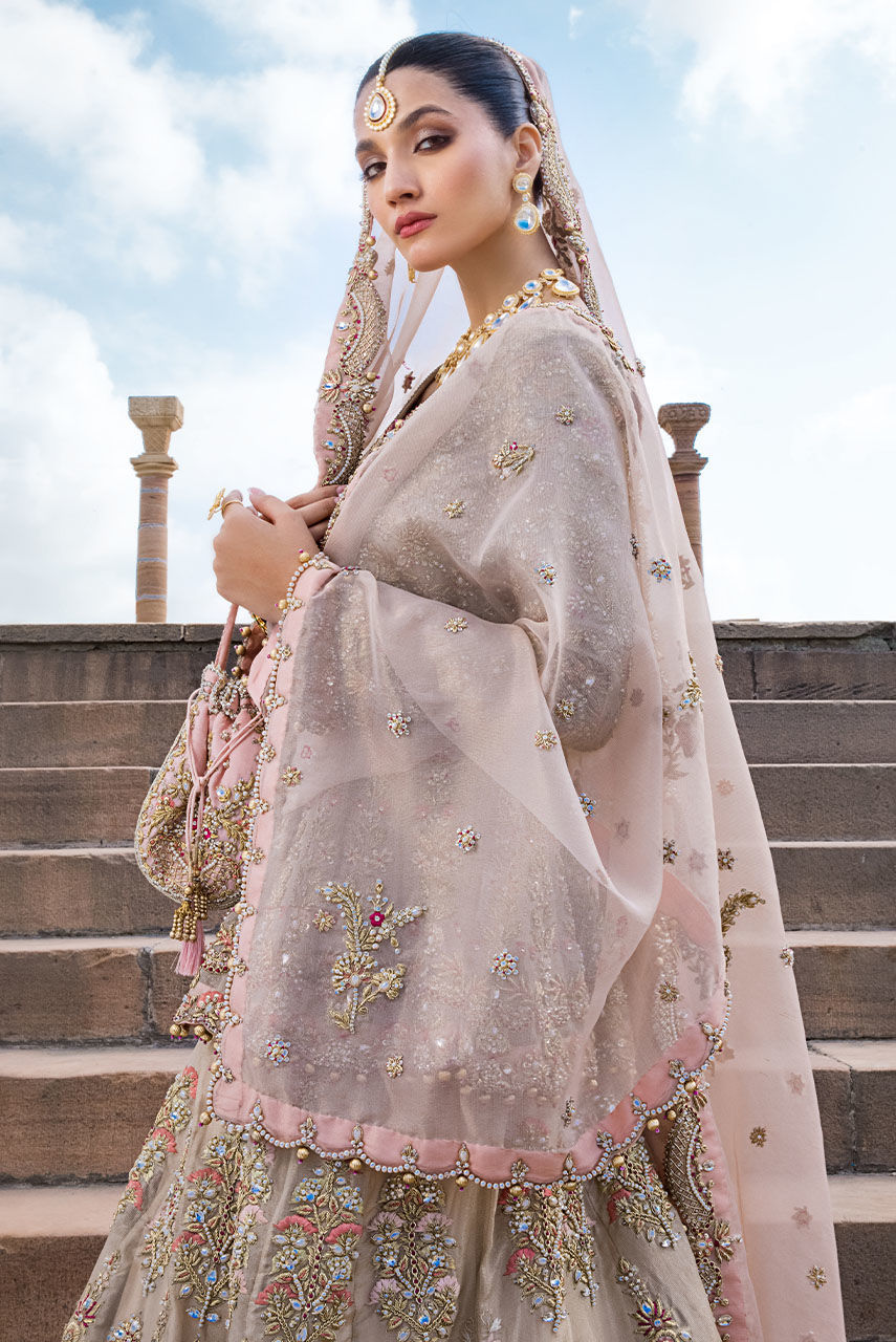 Our ethereal bridal with breathtaking details in shades of gold, blush pink and fuchsia. The maysuri choli and lehnga are extensively hand worked in resham, zardozi, crystals, pearls and french knot. Paired with a blush pink dupatta with hand worked scallop in zardozi, resham and crystals. Additional dupatta is in net hand worked in sheesha and pearls