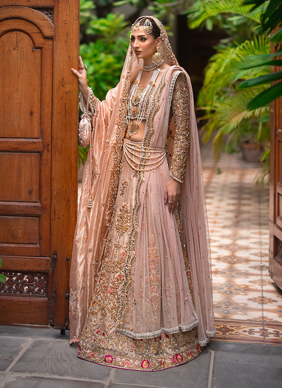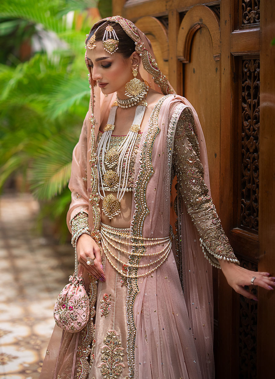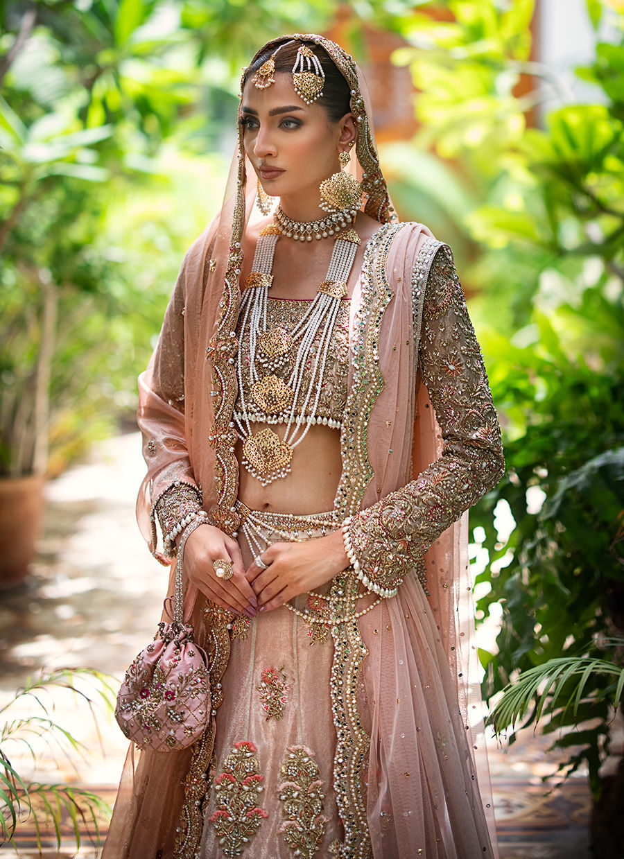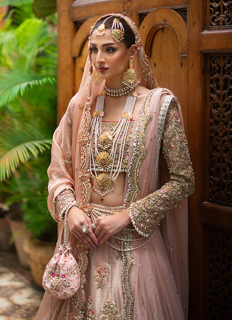Our ethereal bridal with breathtaking details in shades of gold, blush pink and fuchsia. The maysuri choli and lehnga are extensively hand worked in resham, zardozi, crystals, pearls and french knot. Paired with a blush pink dupatta with hand worked scallop in zardozi, resham and crystals. Additional dupatta is in net hand worked in sheesha and pearls