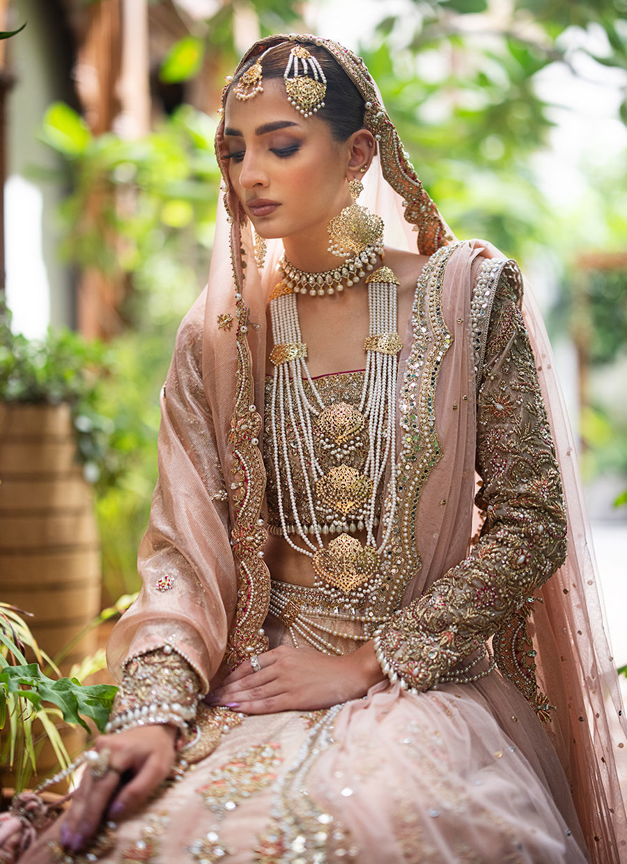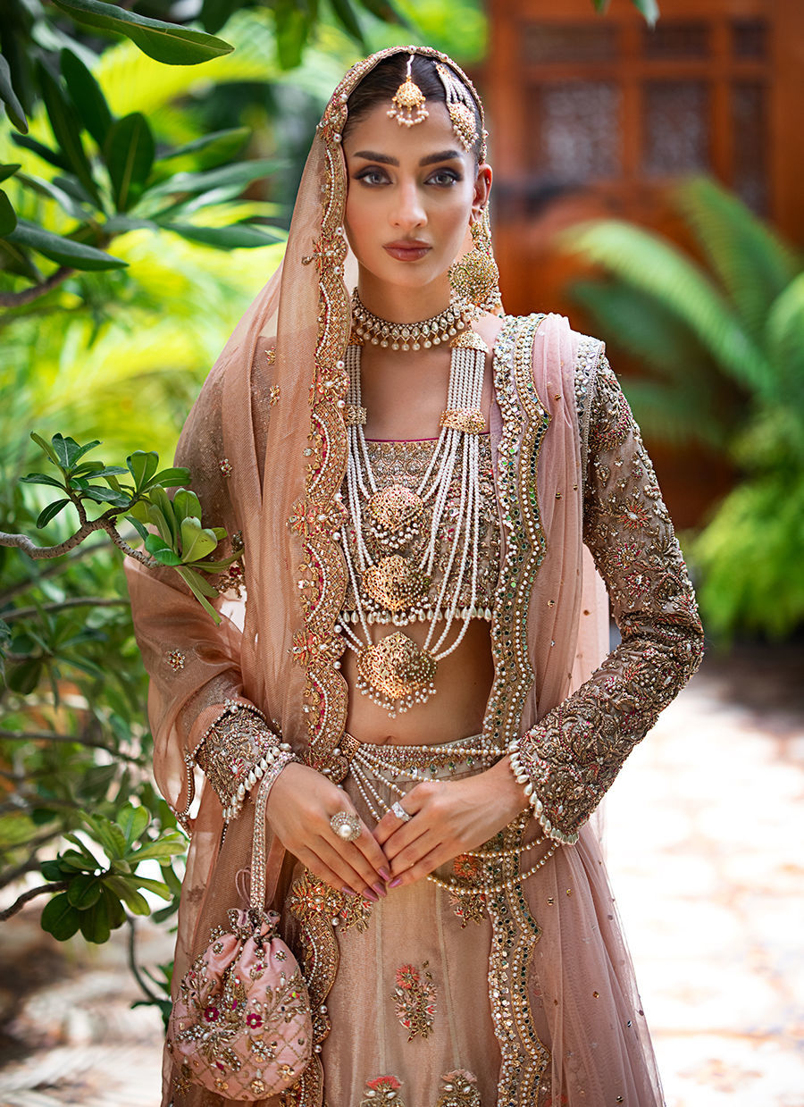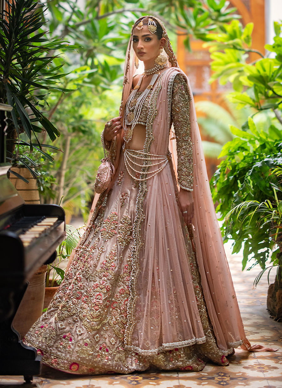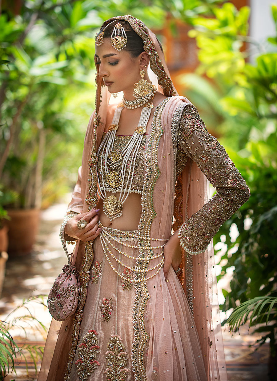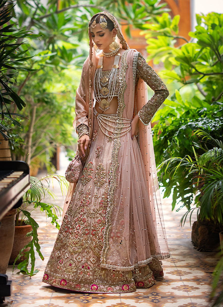 Our ethereal bridal with breathtaking details in shades of gold, blush pink and fuchsia. The maysuri choli and lehnga are extensively hand worked in resham, zardozi, crystals, pearls and french knot. Paired with a blush pink dupatta with hand worked scallop in zardozi, resham and crystals. Additional dupatta is in net hand worked in sheesha and pearls