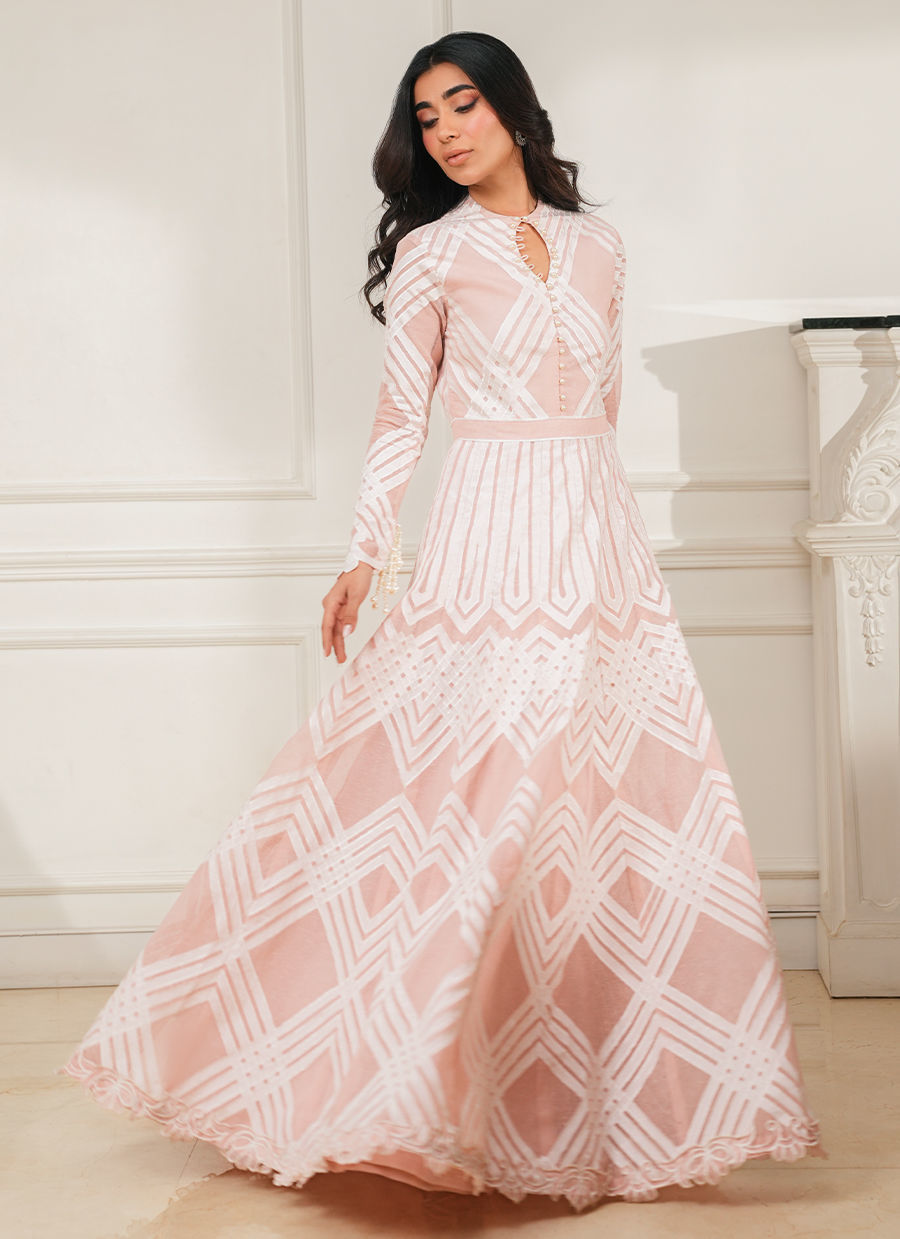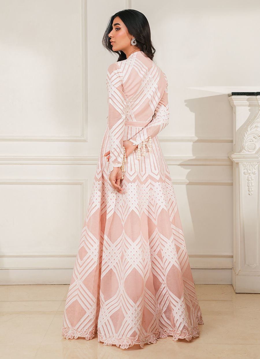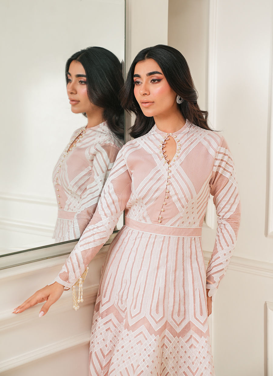 Kora cotton peshwas adorned with handmade appliqué cutwork all over, finished with pearl tassels on the sleeves and a delicate cutwork border along the hem.