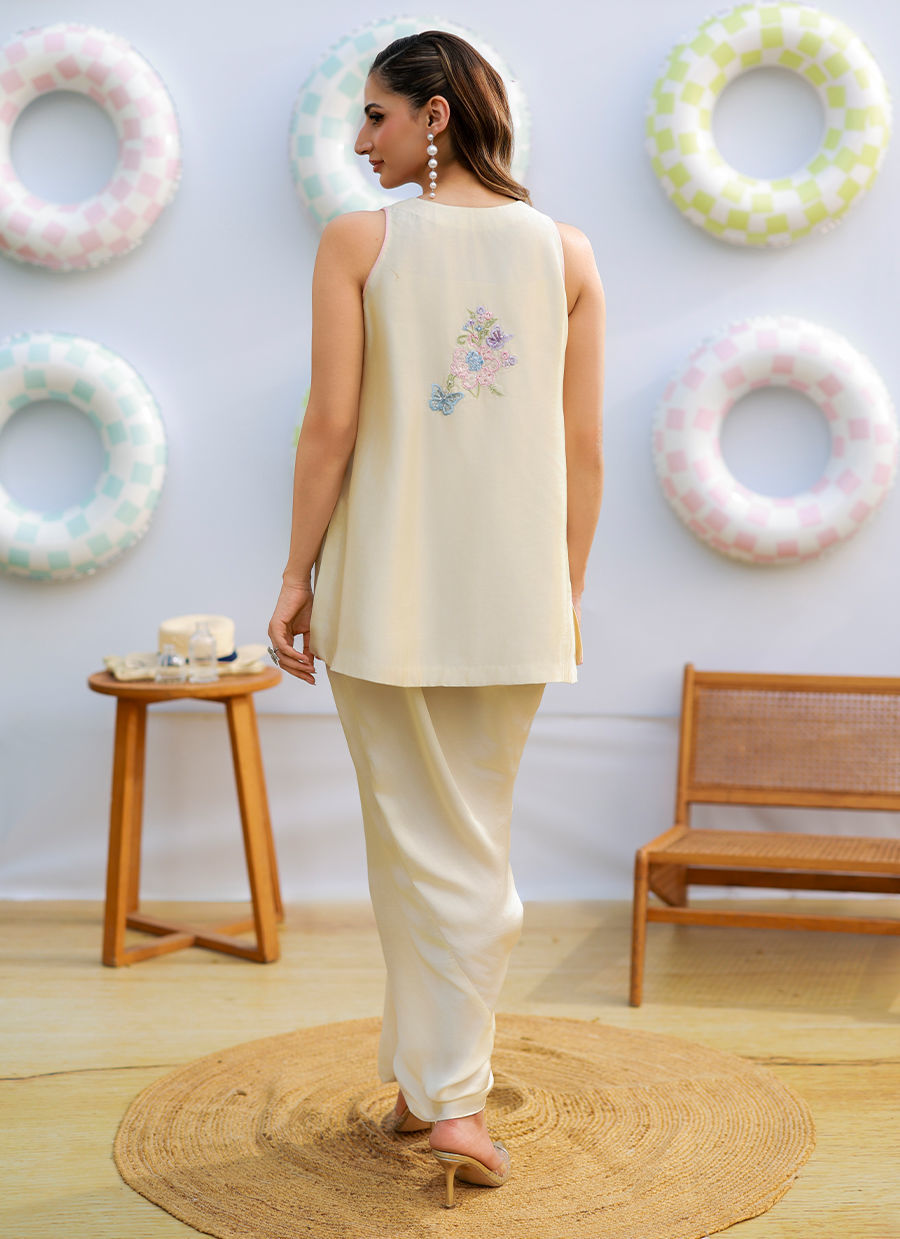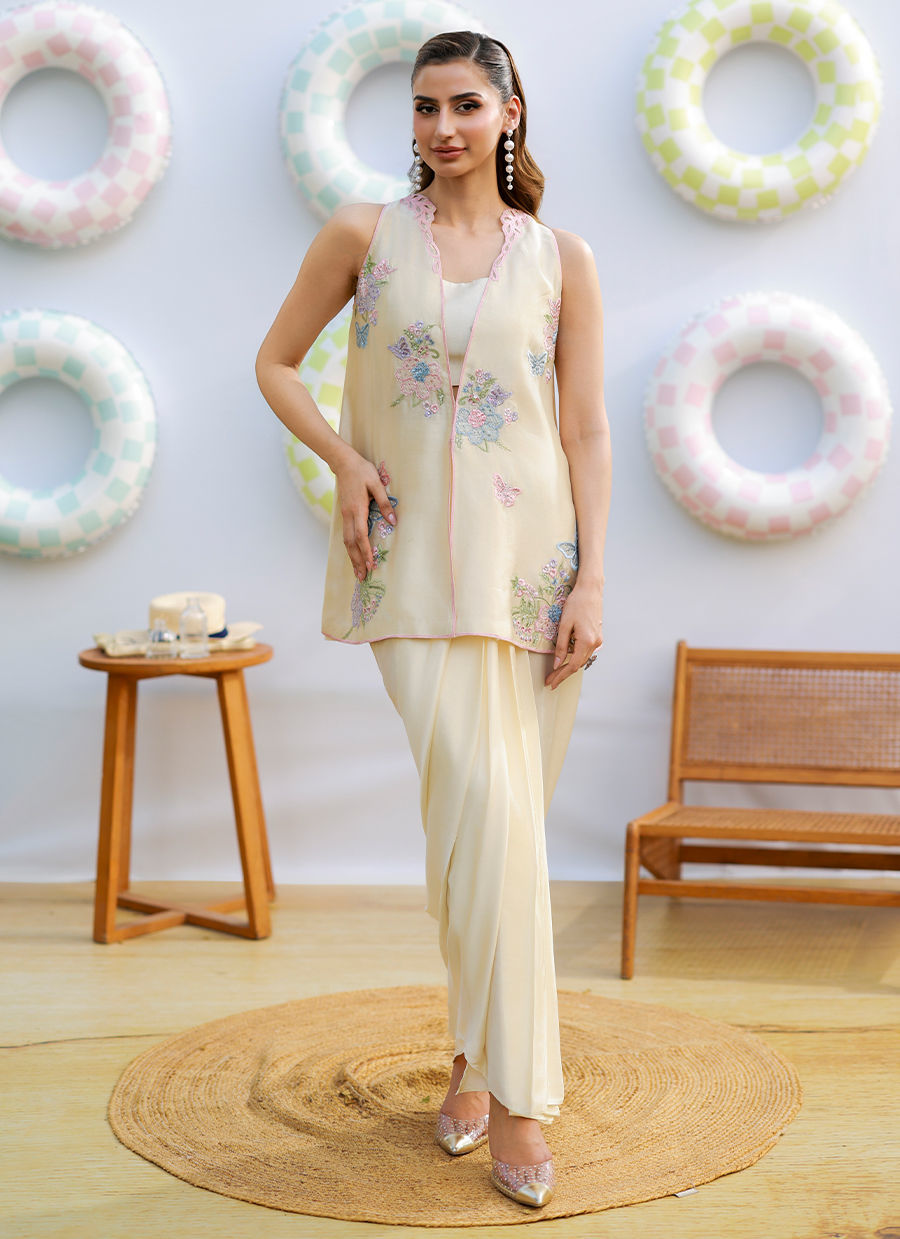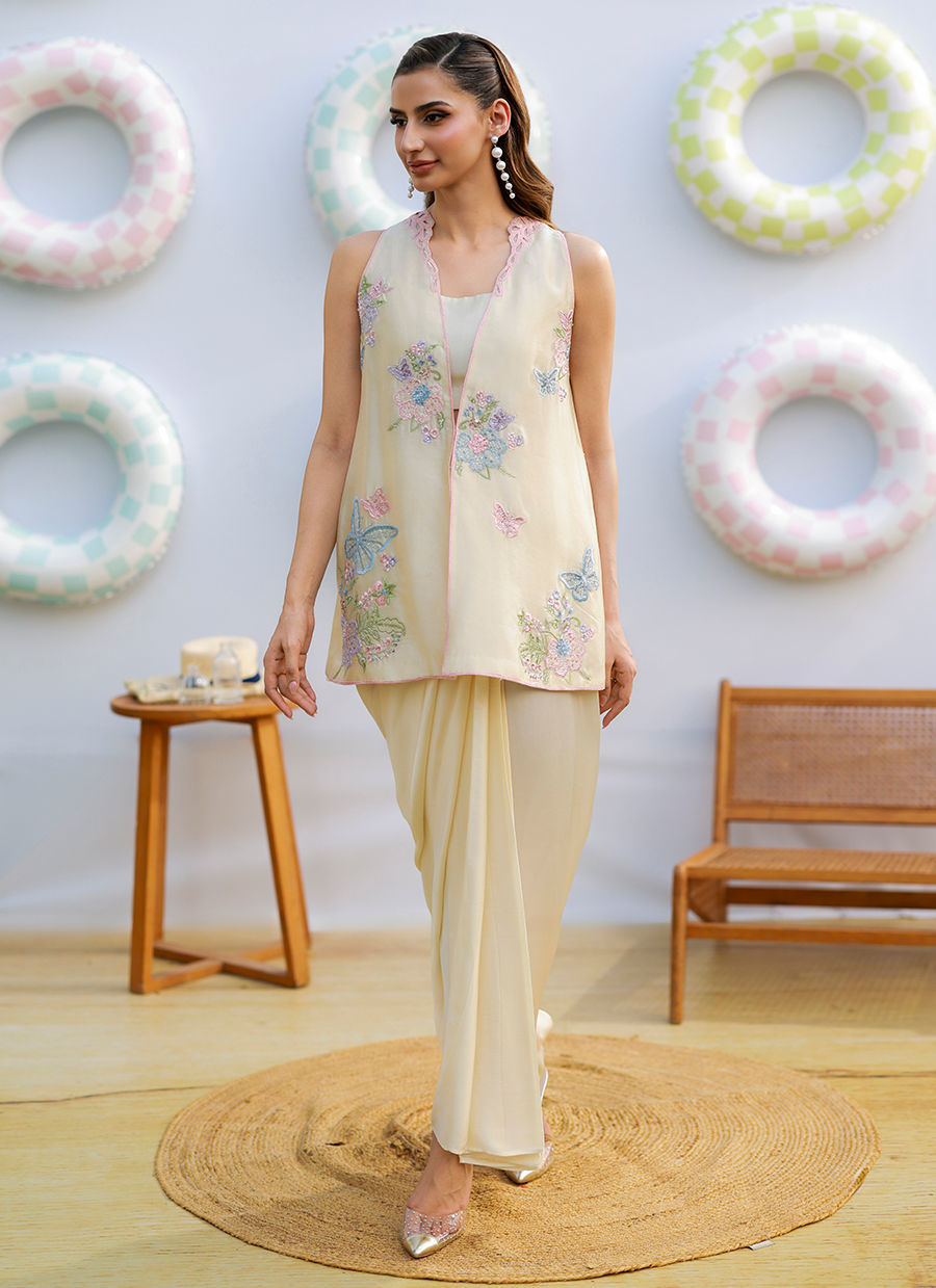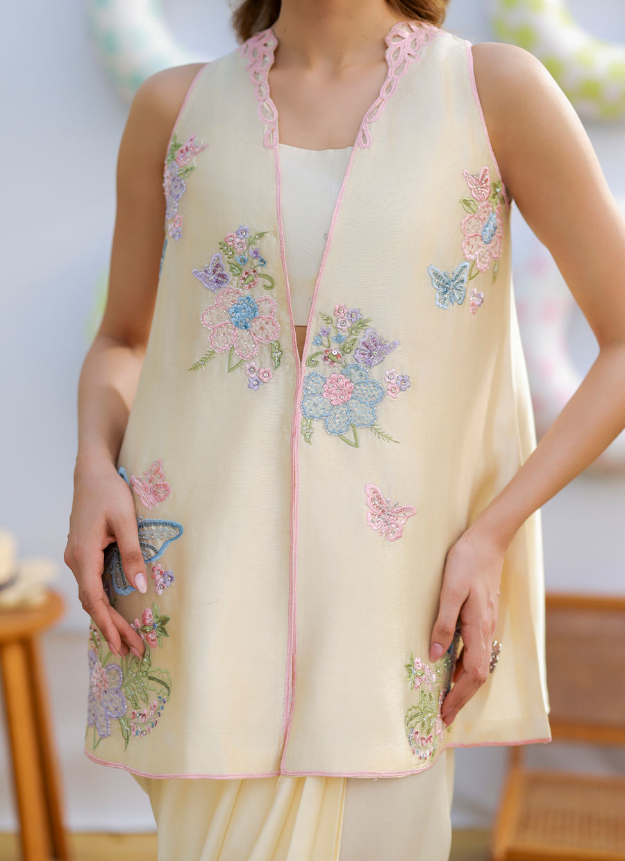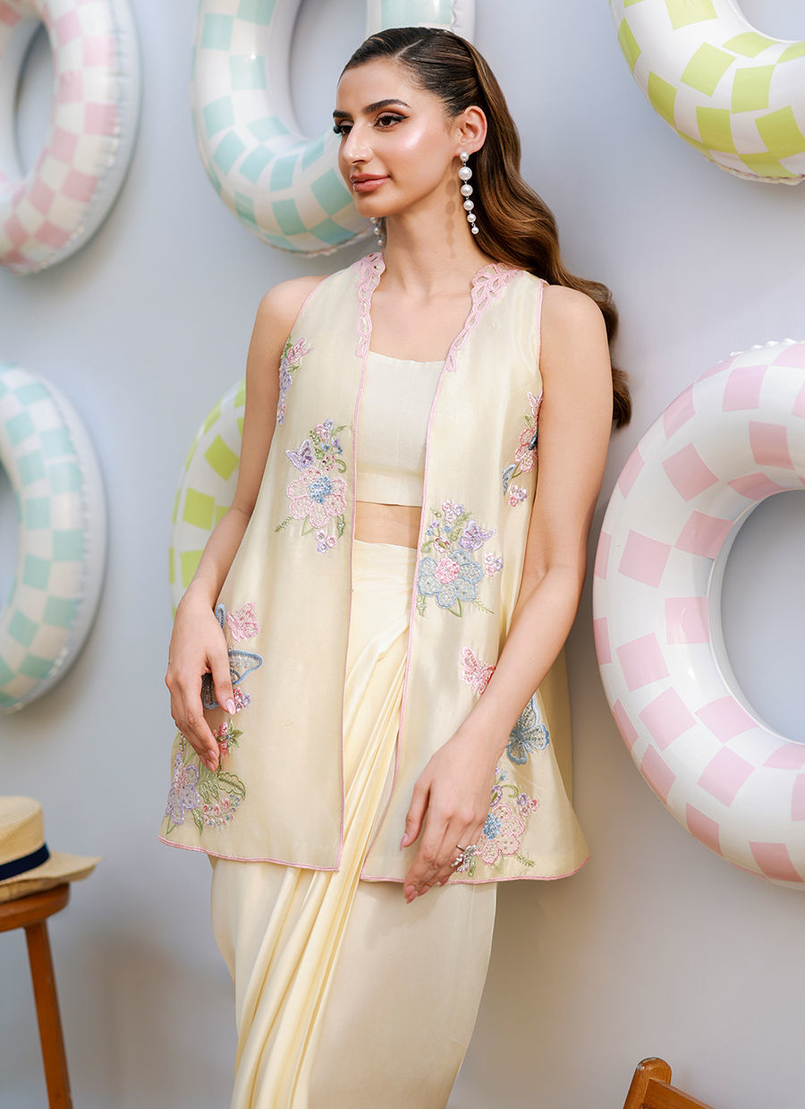 A butter yellow short jacket in sheesha silk paired with a pleated skirt, featuring pastel embroidery for an elegant and graceful look.