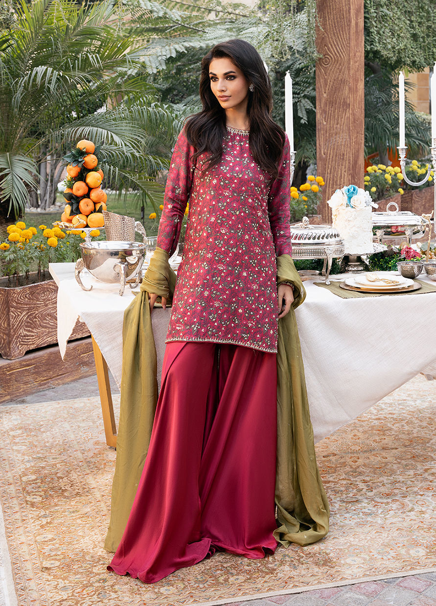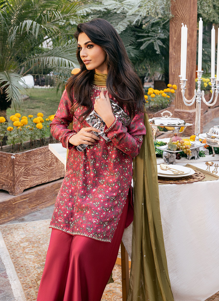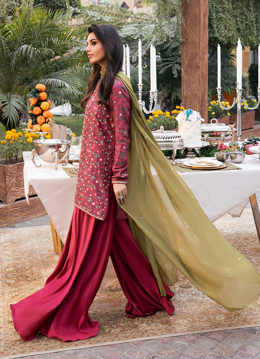 Digitally printed Short shirt crafted from pure raw silk, adorned with a delicate all-over floral. The shirt is further enhanced with subtle hand embellishments. It is paired with Satin silk flowy pants, designed to complement the look with their structured silhouette it. Completing the ensemble is a flowing KP SILK dupatta, draped effortlessly to add lightness and movement, beautifully balancing the richness of the silk textures.